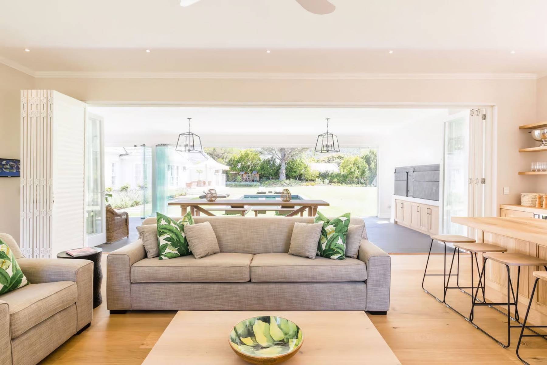 Das Poolhaus verfügt über einen eigenen Wohnbereich, der neben einem Wohnzimmer auch eine Küchentheke und einen Essbereich enthält. Große Fensterelemente lassen sich vollständig öffnen und ermöglichen einen direkten Zugang zum wunderschönen Garten und dem Pool.