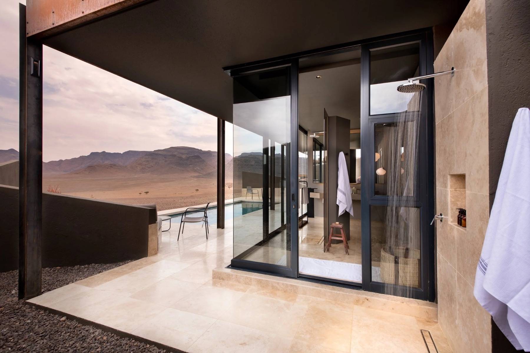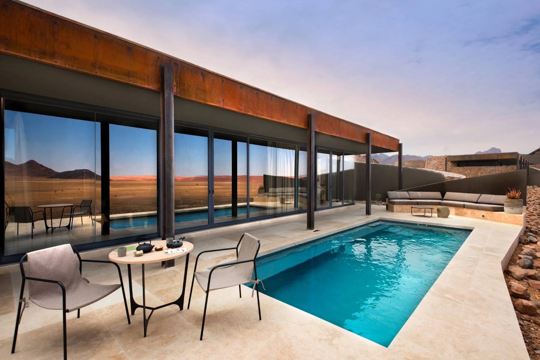 Erleben Sie den wahren Luxus: unvergleichliche Ruhe und endlose Zeit in diesen exklusiven Lodges in der namibischen Wüstenlandschaft. Jede Unterkunft ist ein harmonischer Mix aus Stein, Glas und Stahl, der sich nahtlos in die goldenen Dünen einfügt und das weite Blau des Himmels sich im Pool wieder findet.