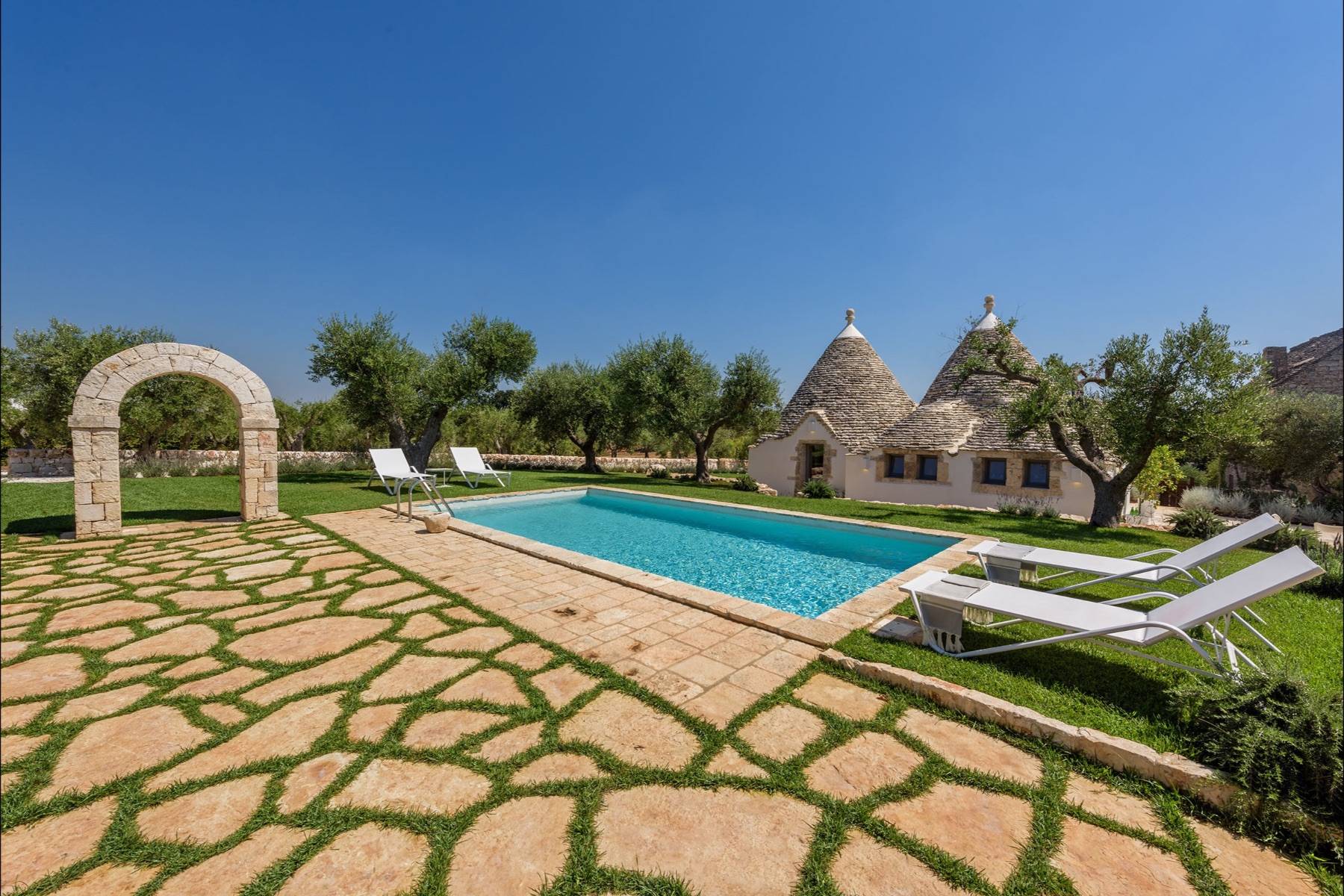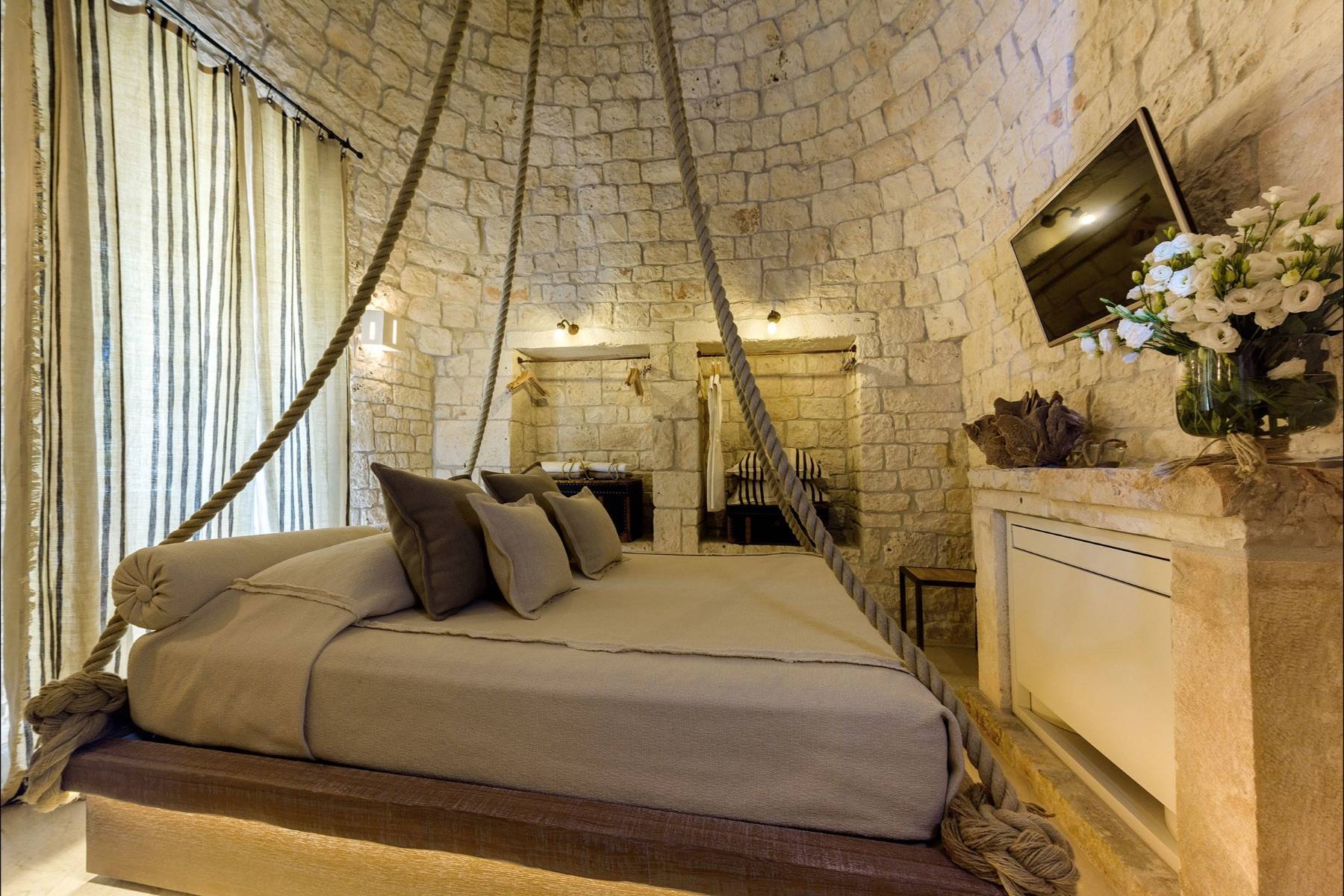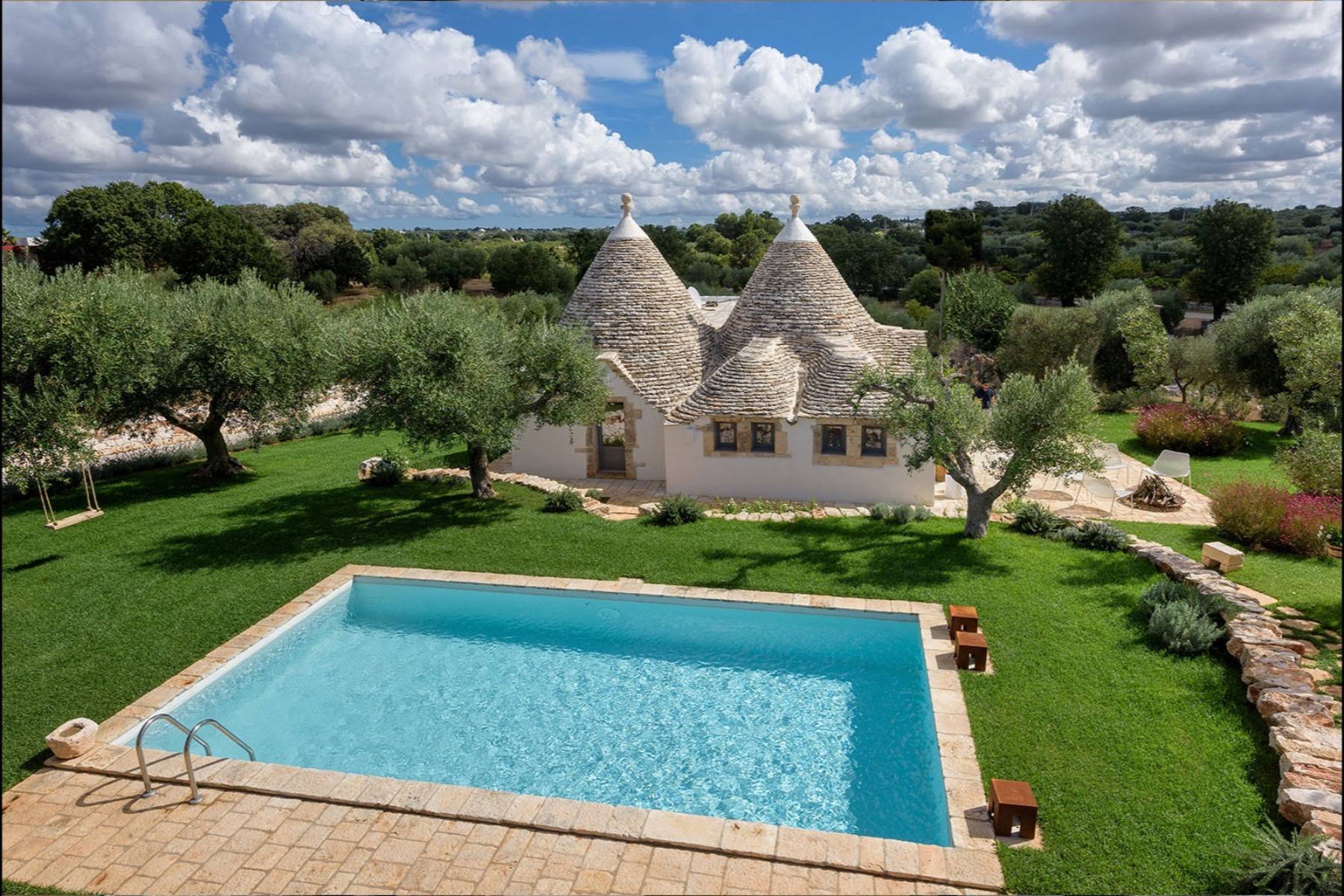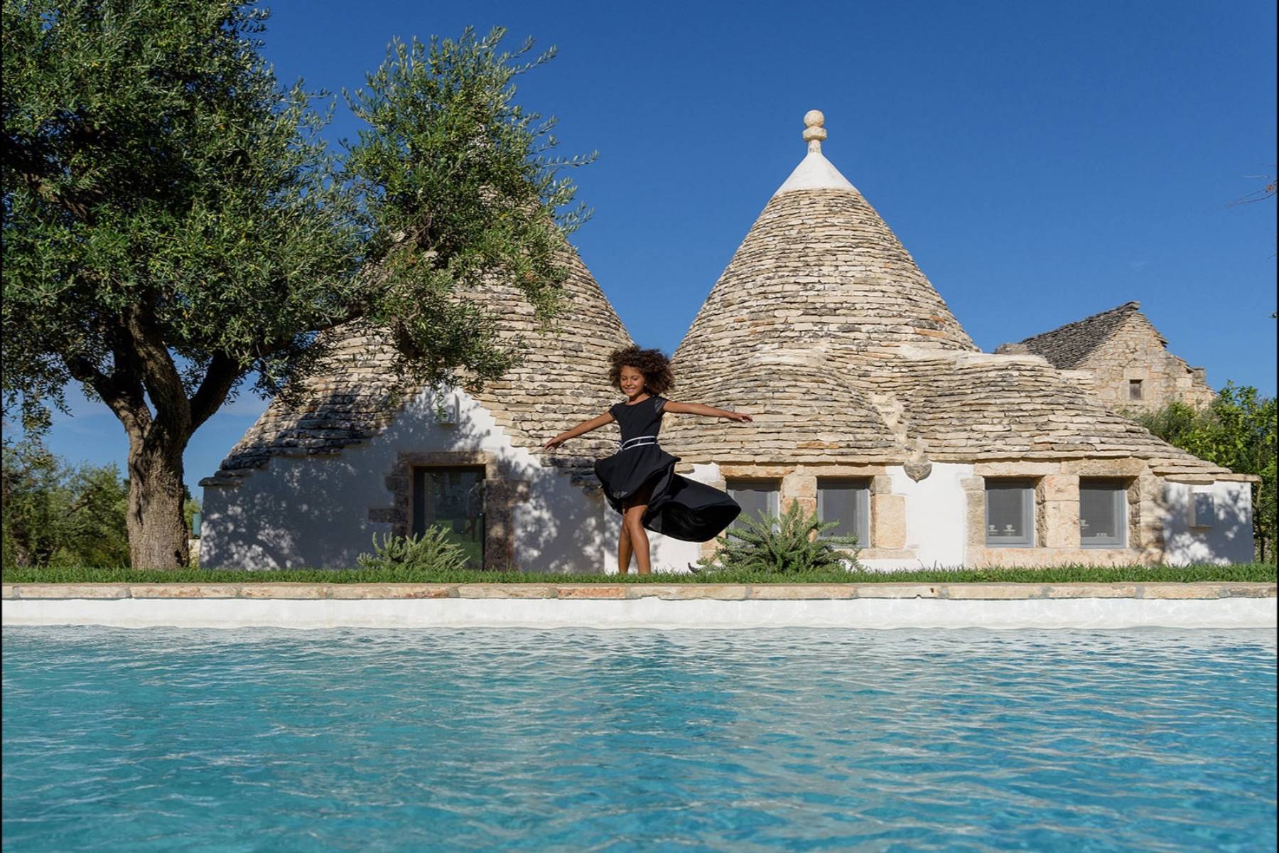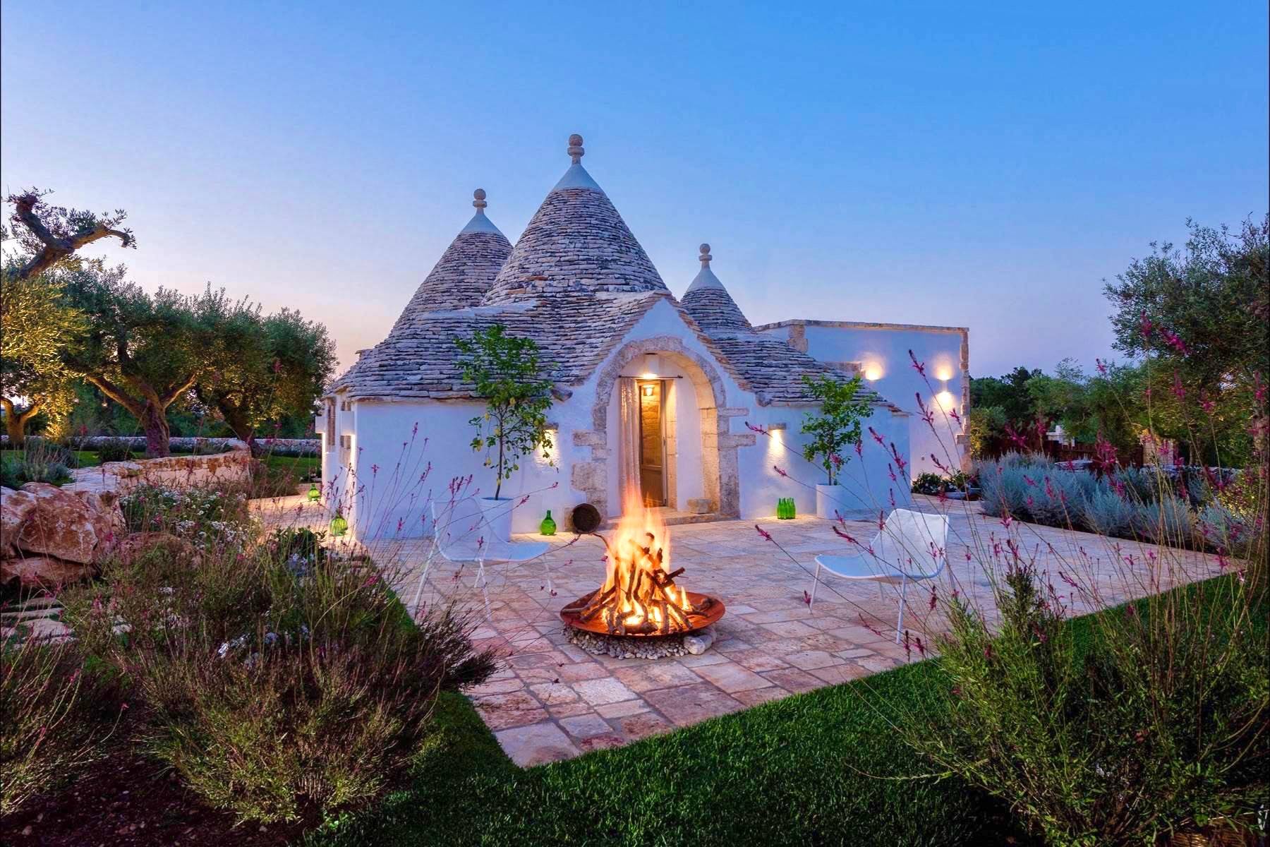 Die Villa Case di Fiaba in Alberobello ist ein perfekter Ausgangspunkt für Luxus, Ruhe und Entspannung, während man die sehenswerte Region Apulien erkundet. Sie besticht durch monochrome, bräunliche Farbtöne, die von weiß über gelb bis hin zu einem rötlichem Farbton übergehen. Die typischen Merkmale eines Trulli sind die drei Kegel mit weißen Spitzen.