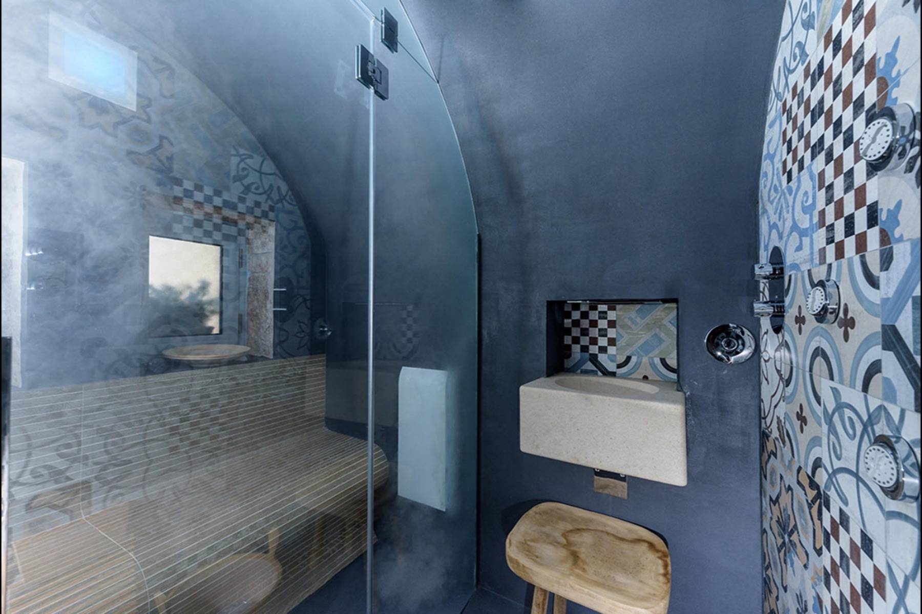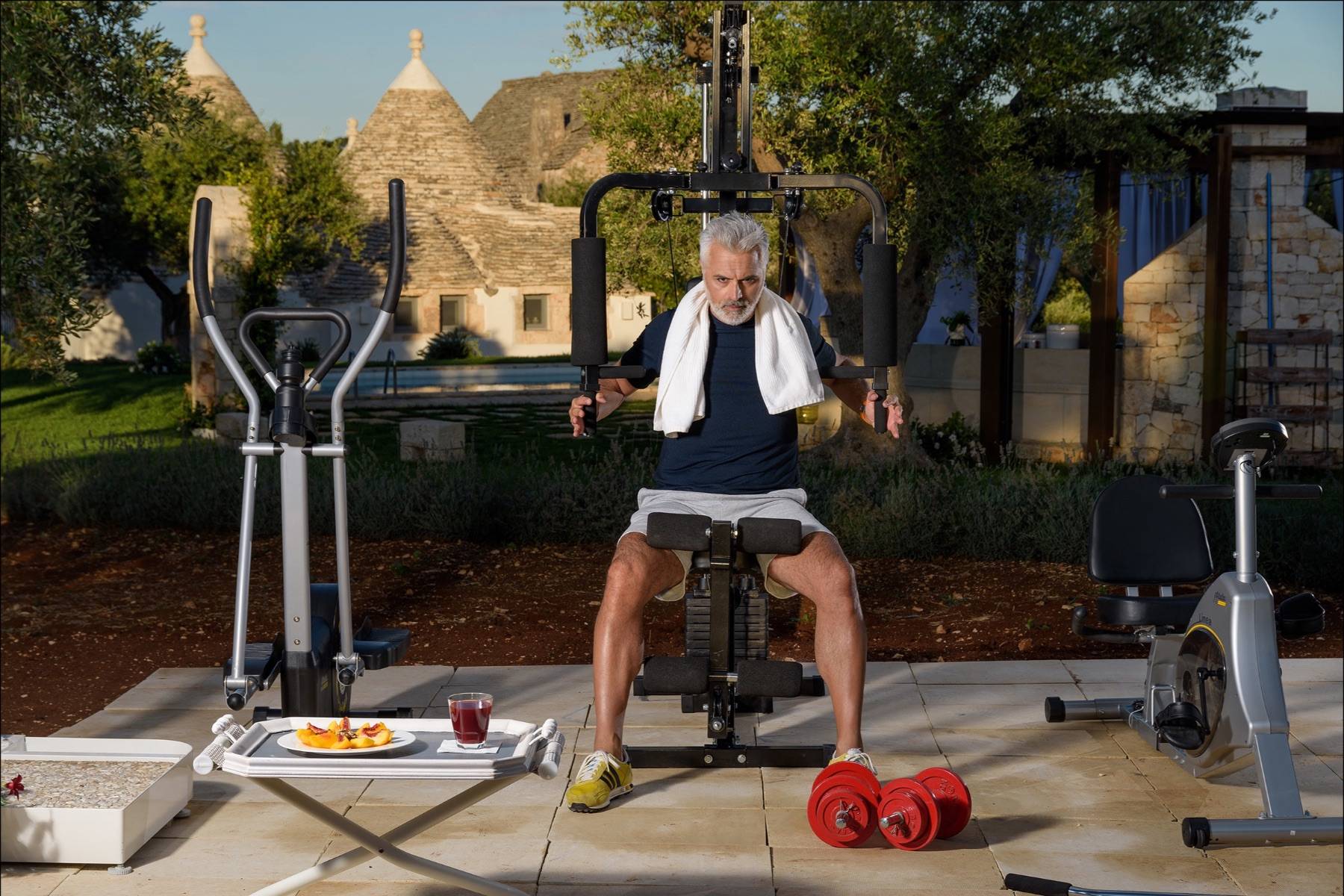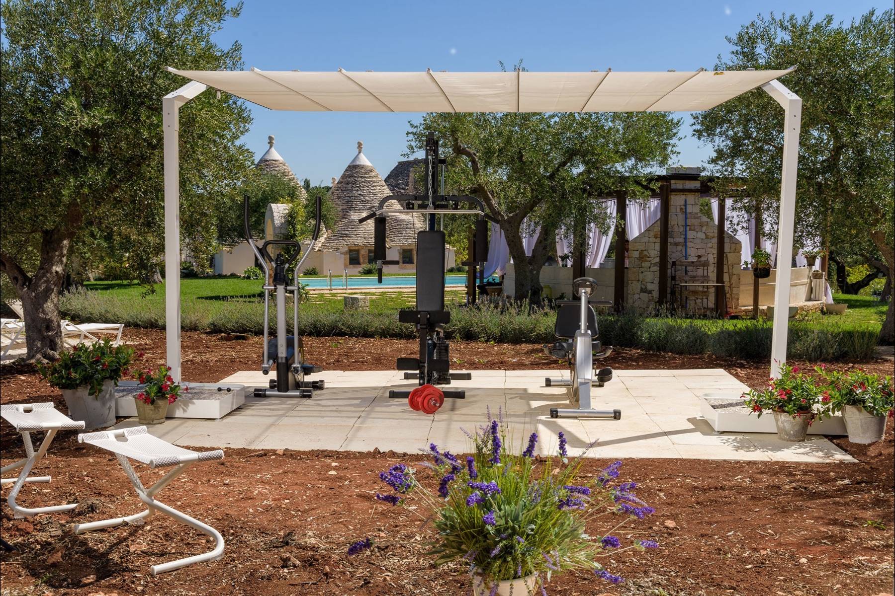 Abkühlung findet man in dem ca. 4 x 8 Meter großen Pool, neben dem auch eine Außendusche und Sonnenliegen vorhanden sind. Ferner befinden sich einige Fitnessgeräte im Freien.