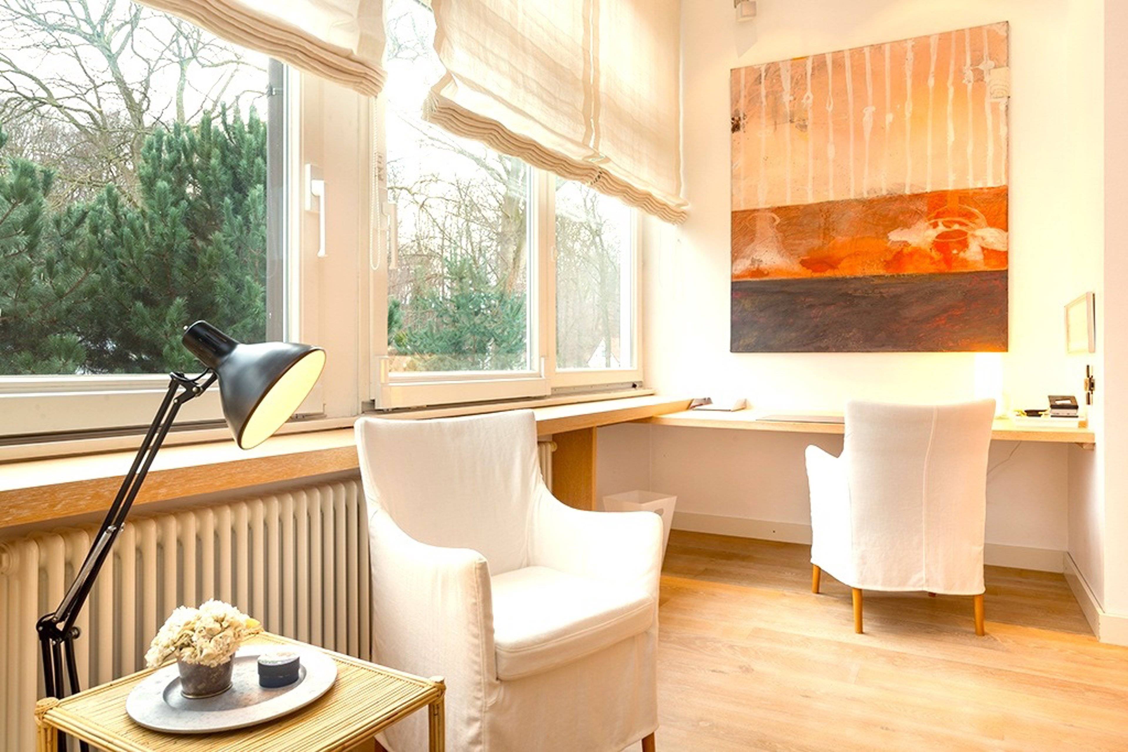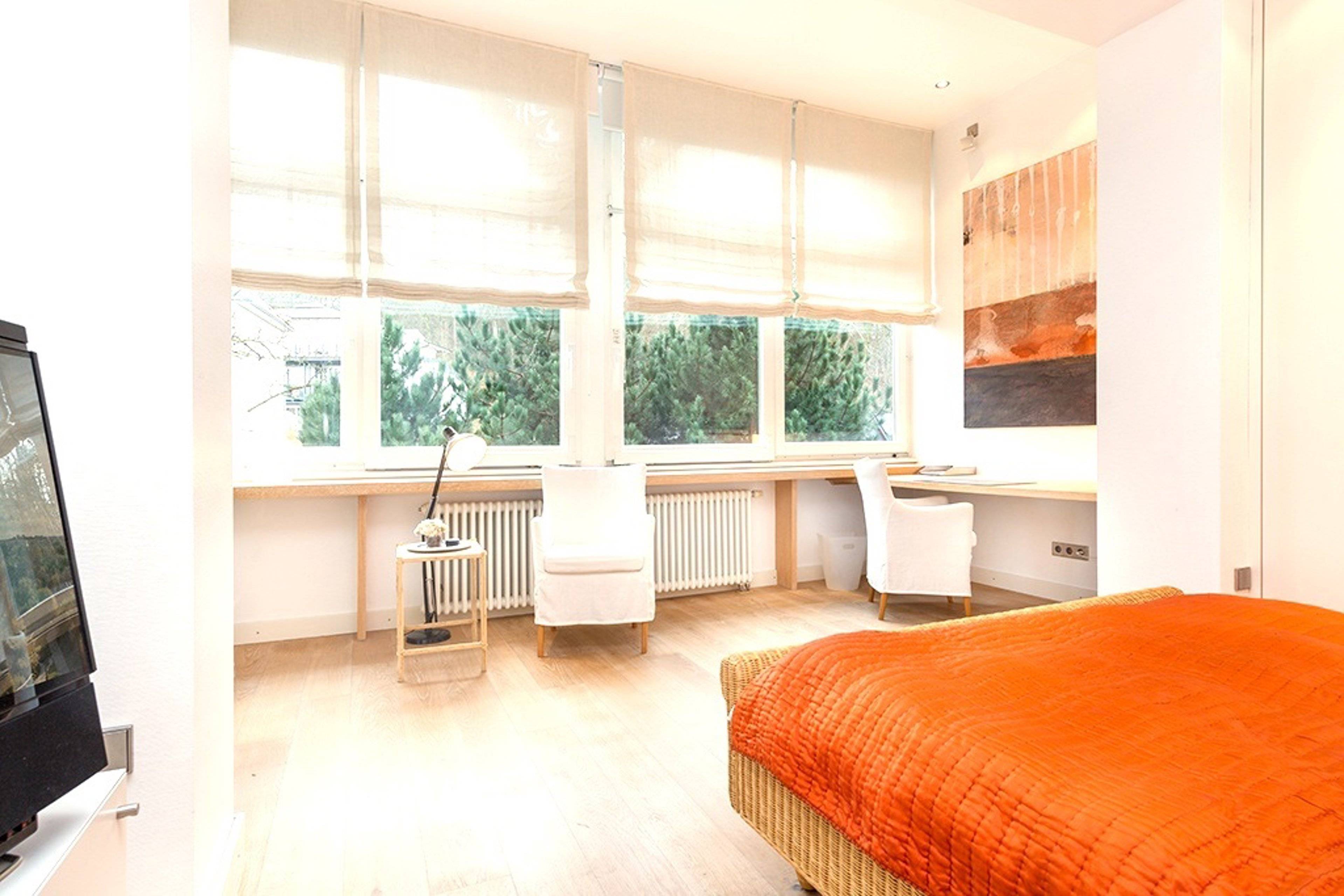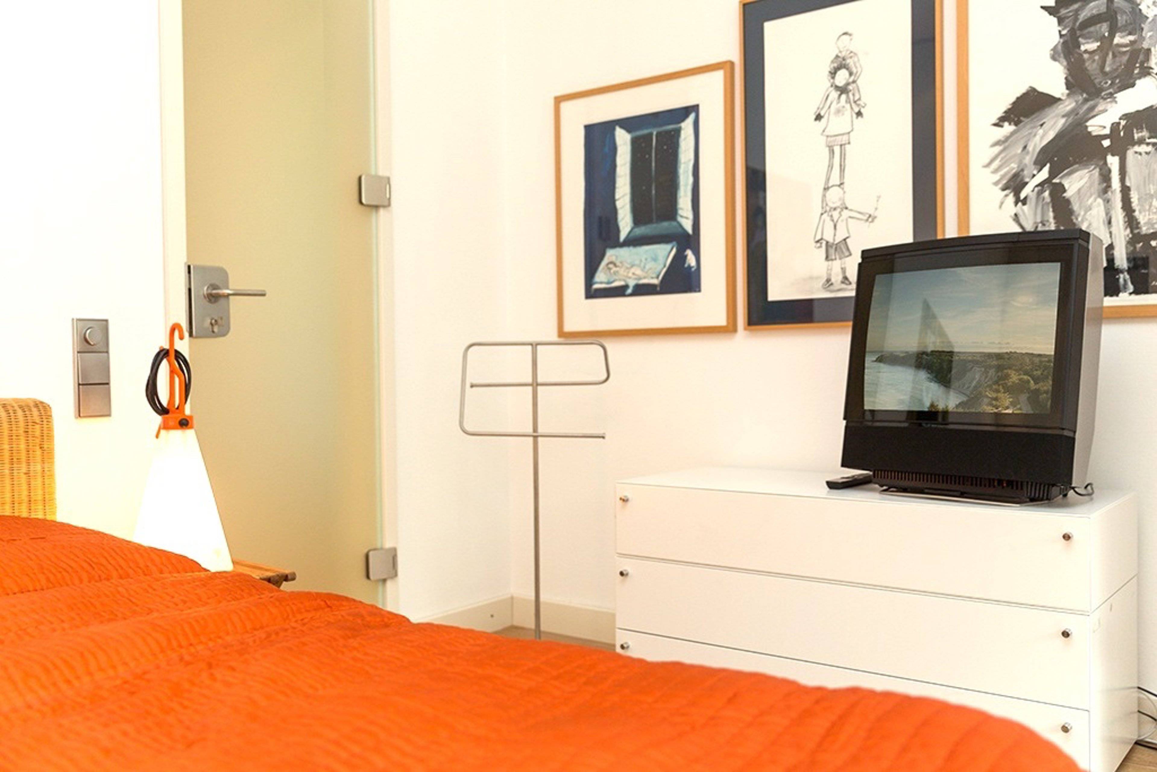 Das großzügige Schlafzimmer mit Doppelbett und einer Leseecke mit zahlreichen Büchern laden zum Entspannen ein. Bei Bedarf besteht die Möglichkeit für eine dritte und vierte Person das Schlafsofa zu nutzen.