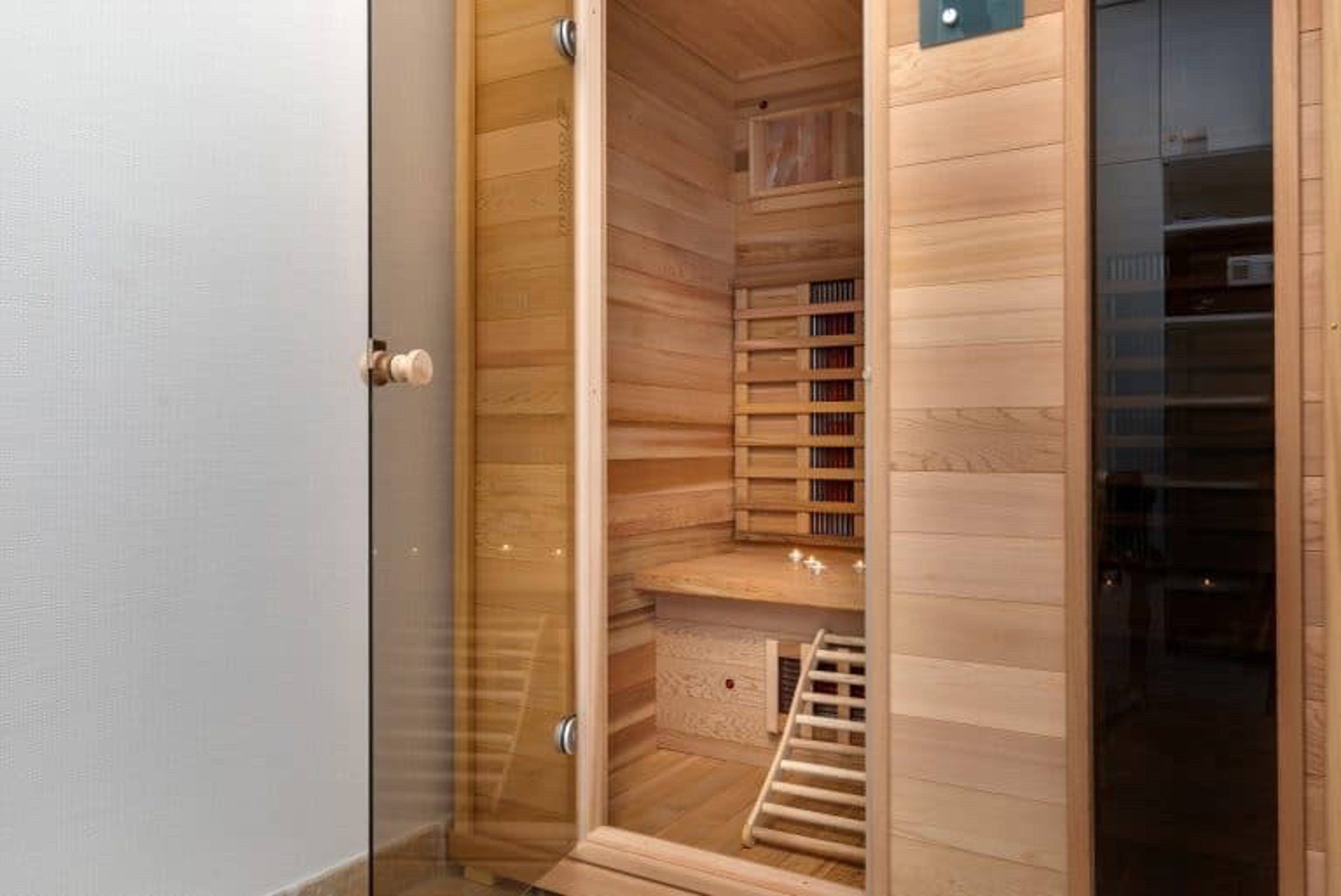 Ein Schlafzimmer mit Doppelbett, Flachbildschirm und Zugang zum Balkon, sowie ein zweites Schlafzimmer mit Doppelbett bietet bis zu vier Personen einen erholsamen Schlaf. Das Badezimmer ist mit edlen Marmorfliesen versehen und verfügt über eine Dusche. In der Wohnung steht Ihnen darüber hinaus eine Infrarotsauna für einen für eine sanfte Entspannung zur Verfügung.