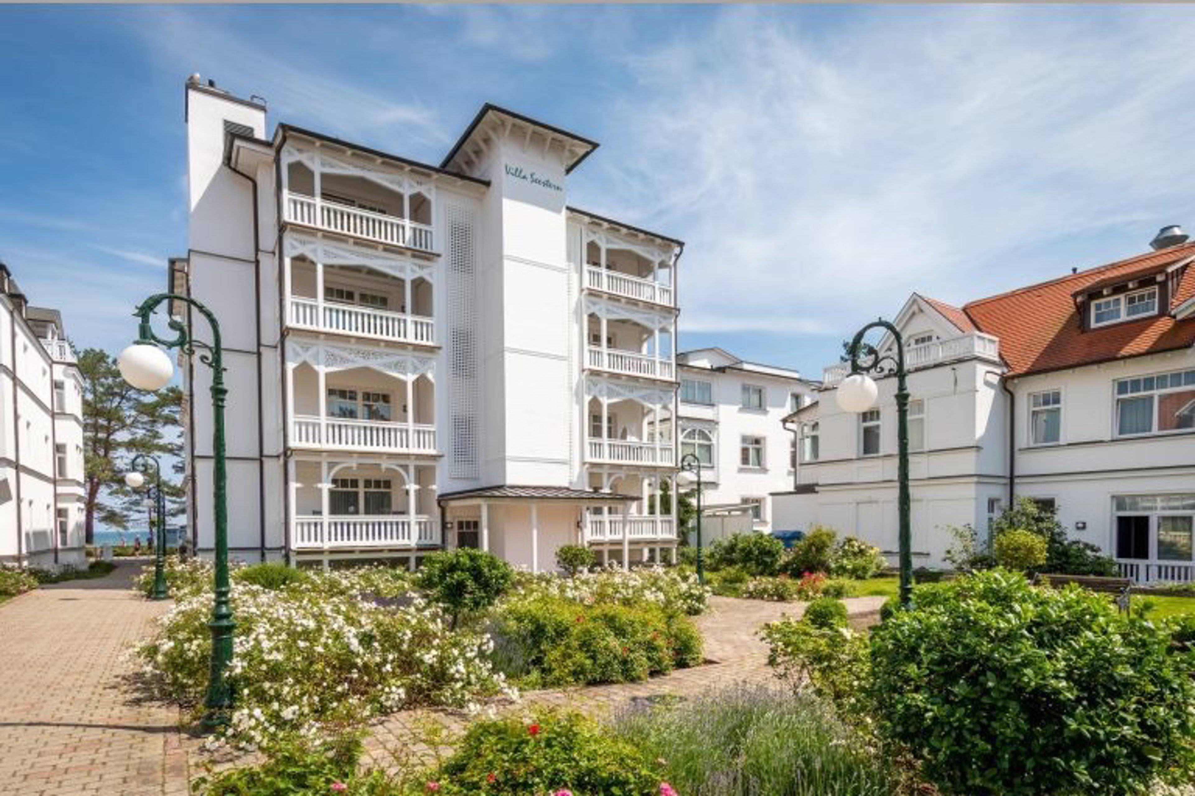 Die Villa Seestern befindet sich unmittelbar an der Strandpromenade in Binz und gehört aufgrund ihrer historischen Bäderarchitektur zu den schönsten Villen vor Ort.