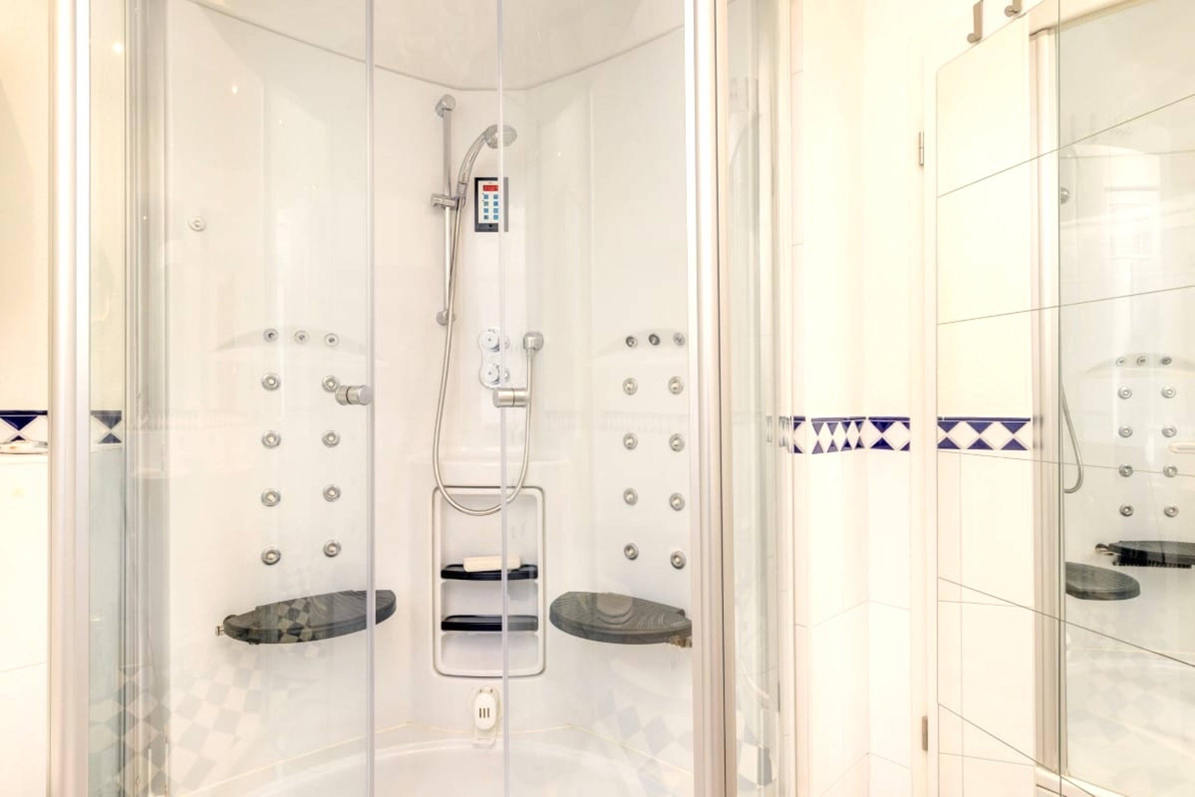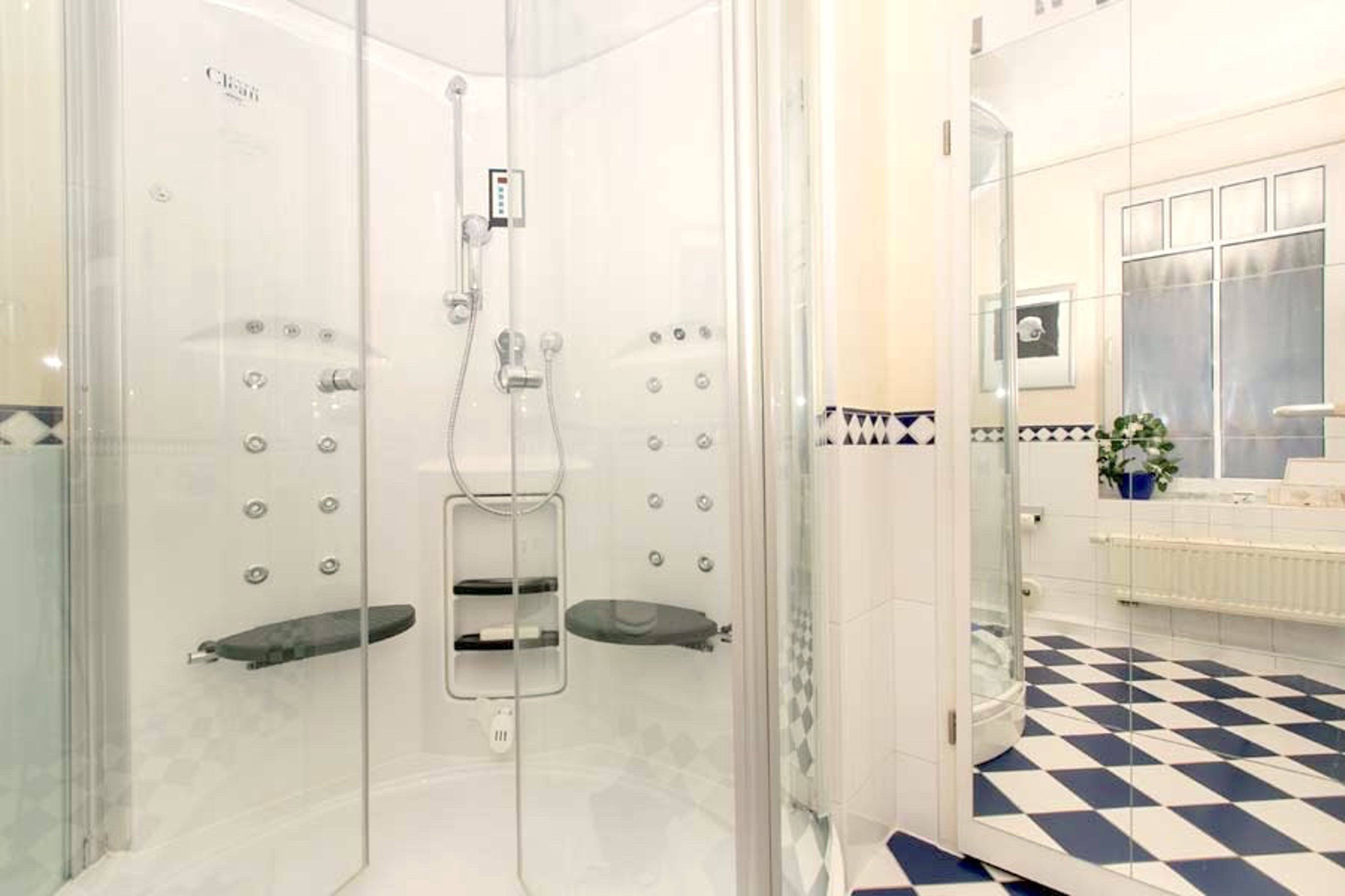 Das Badezimmer ist eine kleine Wellnessoase. Der Duschtempel verwandelt sich auf Knopfdruck zu einer Dampfsauna und sorgt für eine ganz besondere Entspannung.