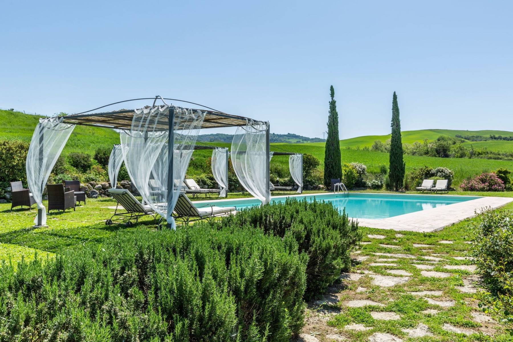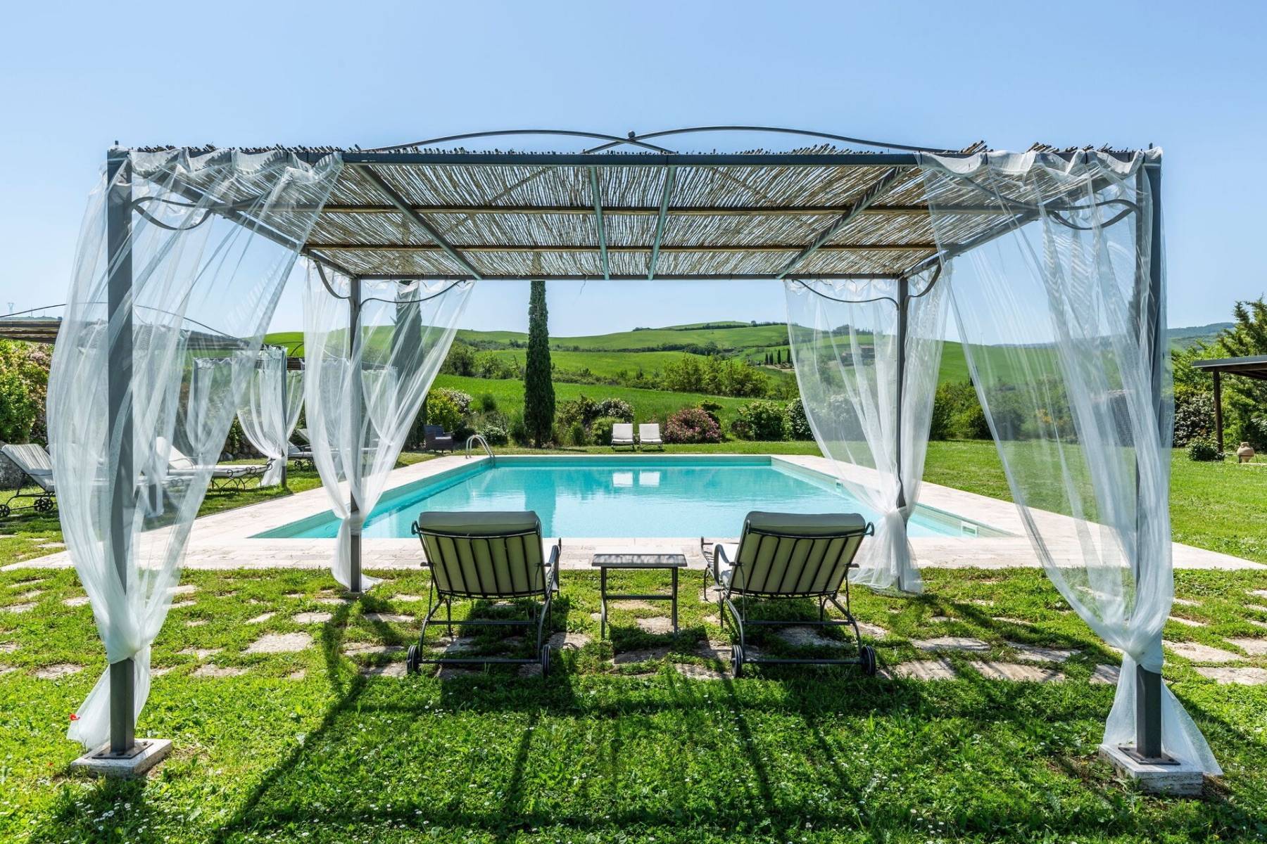 Die Villa Castiglione befindet sich auf einem ca. 6.500 qm großen und gepflegten Grundstück und ermöglicht somit einen ruhigen Urlaub. Im weitläufigen Garten lockt ein großer Pool (ca. 15 x 7,5 x1,45 Meter) zum Baden, Schwimmen oder Plantschen ein, um den zahlreiche Sonnenliegen und schattenspendende Pergola platziert sind.