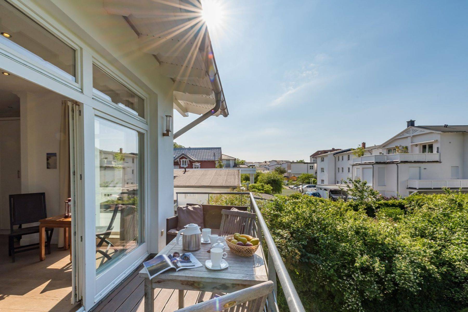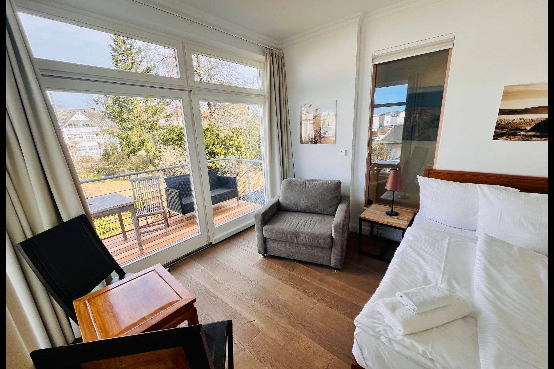 An warmen Tagen lädt der Balkon mit seinem Blick ins Grüne des Kurparks zum Verweilen ein. Auf dieser ruhigen Hausseite befindet sich auch das geräumige Schlafzimmer – ein Ort für erholsamen Schlaf, häufig begleitet vom sanften Rauschen der Ostseewellen.