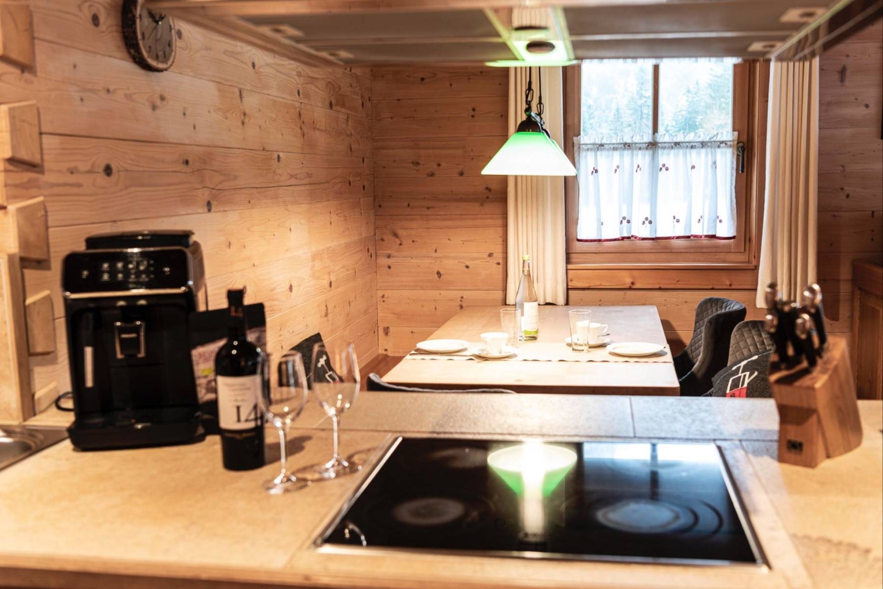 Der kombinierte Wohn-Ess- und Kochbereich im Chalet Rauschberg in Ruhpolding erstreckt sich über 40 qm und ist von der Fußbodenheizung, über einen Kamin mit allem ausgestattet, was das Herz begehrt. Auch ausreichende Sitzgelegenheiten für sechs Personen sind natürlich vorhanden.
