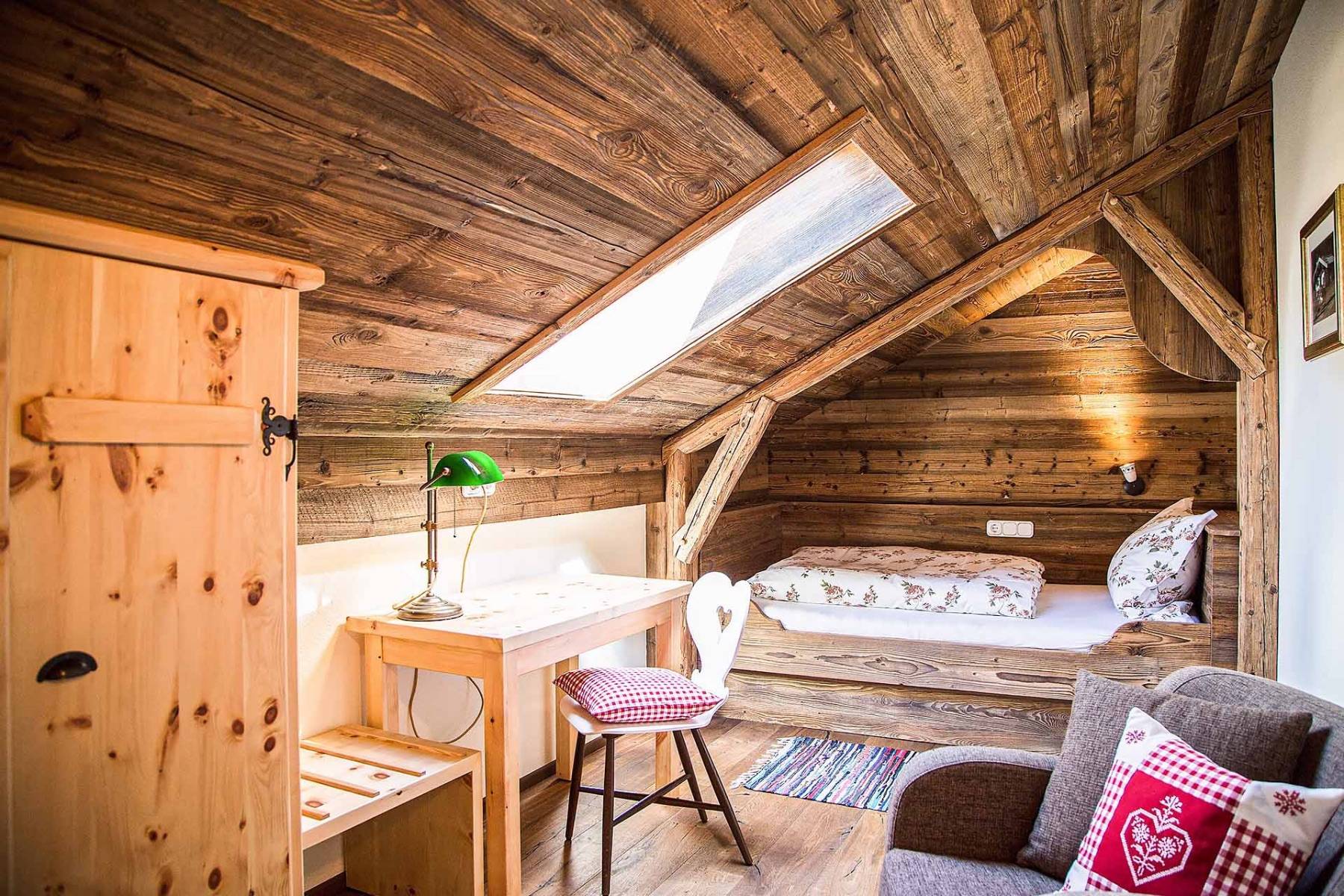 Genießen Sie das Flair einer Almhütte über 2 Etagen in unserem traditionsreichen Hauptgebäude mit vielen wunderbaren Details aus Altholz und Zirbenholz. Die ätherischen Öle der Zirbelkiefer aus den Hochlagen der österreichischen Alpen haben eine positive Wirkung auf ihren Kreislauf. Erleben sie eine unvergessliche, entspannende Atmosphäre, die seinesgleichen sucht. Die Kombination von alten und modernen Elementen wird Sie garantiert begeistern. Ein Kinderreisebett kann auf Wunsch zugestellt werden.