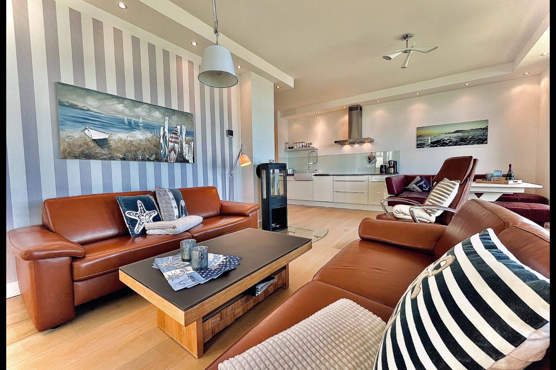 Großzügiger Wohn- und Küchenbereich mit Echtledermöbeln, Eichenholz & Kaminofen
