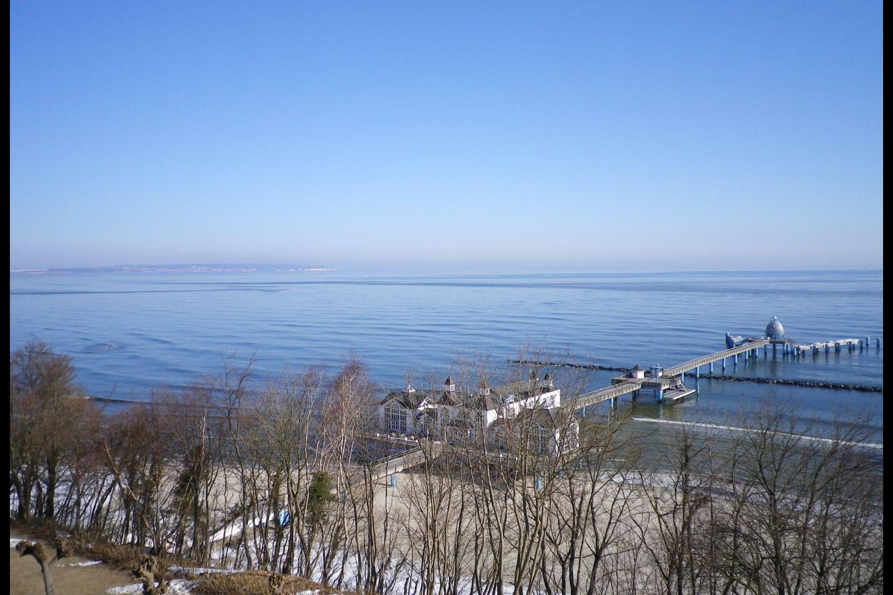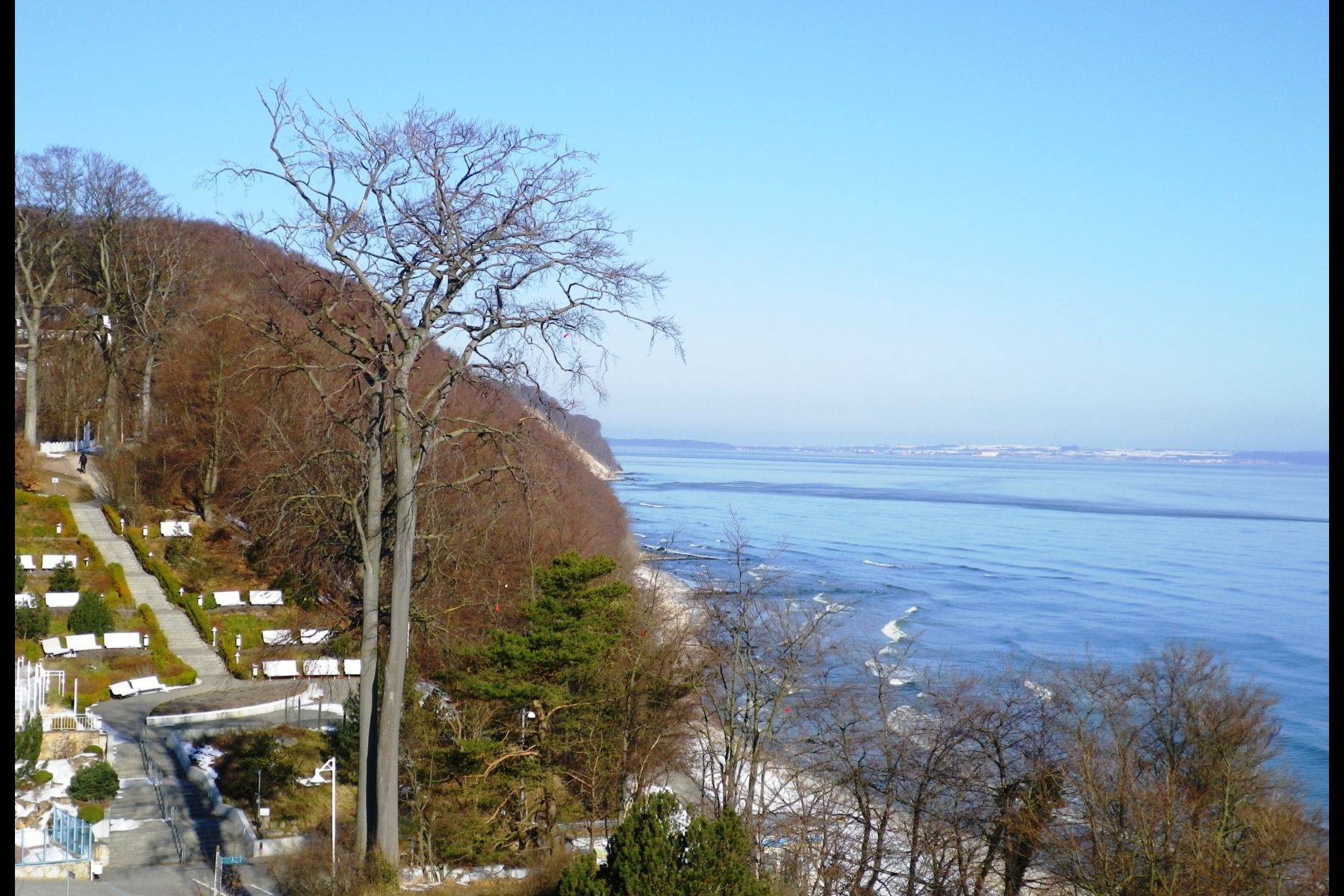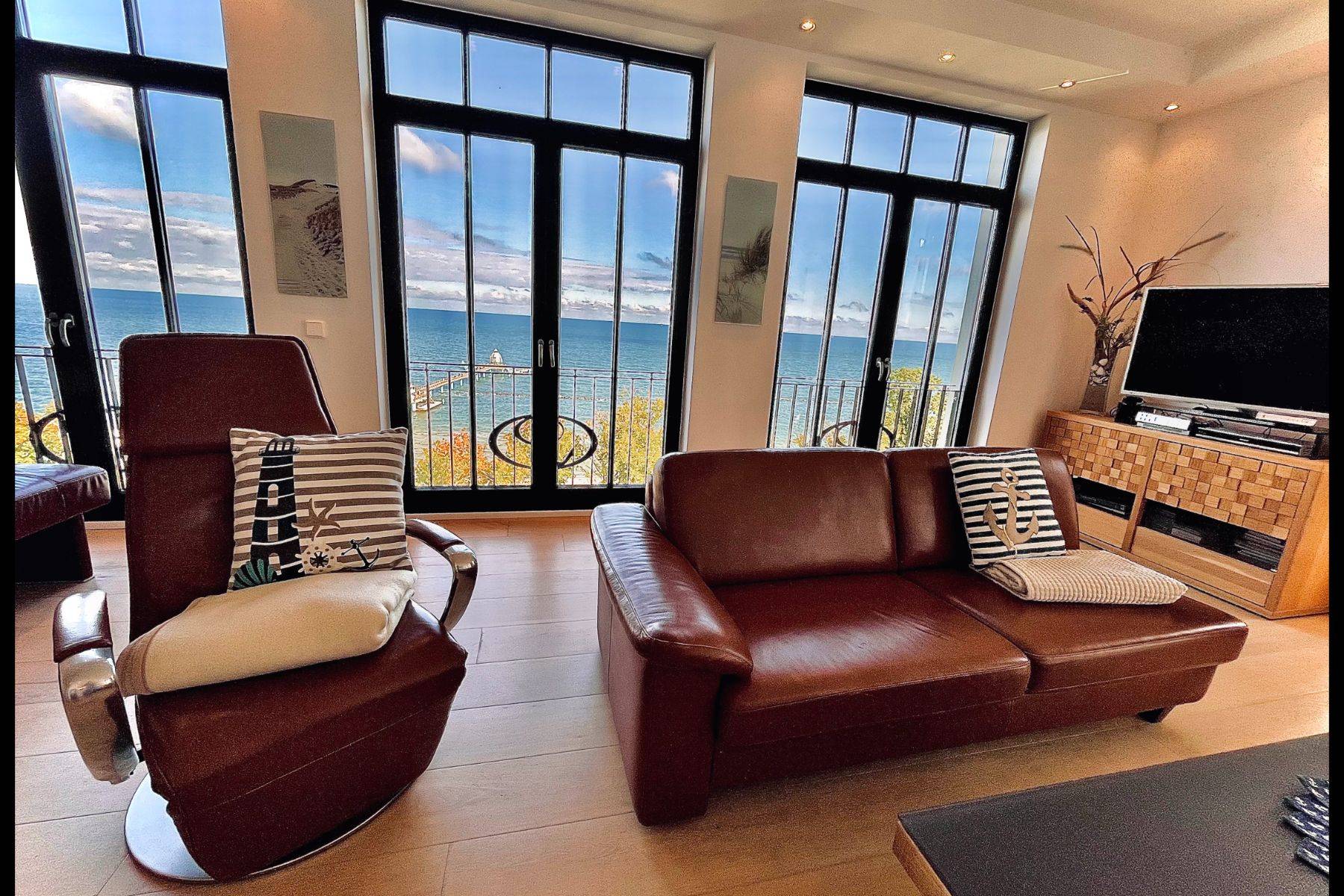 Gerne öffnen wir bei Ihrer Ankunft eines der großen französischen Fenster für Sie – dann genießen Sie aus fast 100 Metern Höhe den atemberaubenden Blick über die Ostsee, auf die Selliner Seebrücke und die Kreidefelsen der Stubbenkammer.