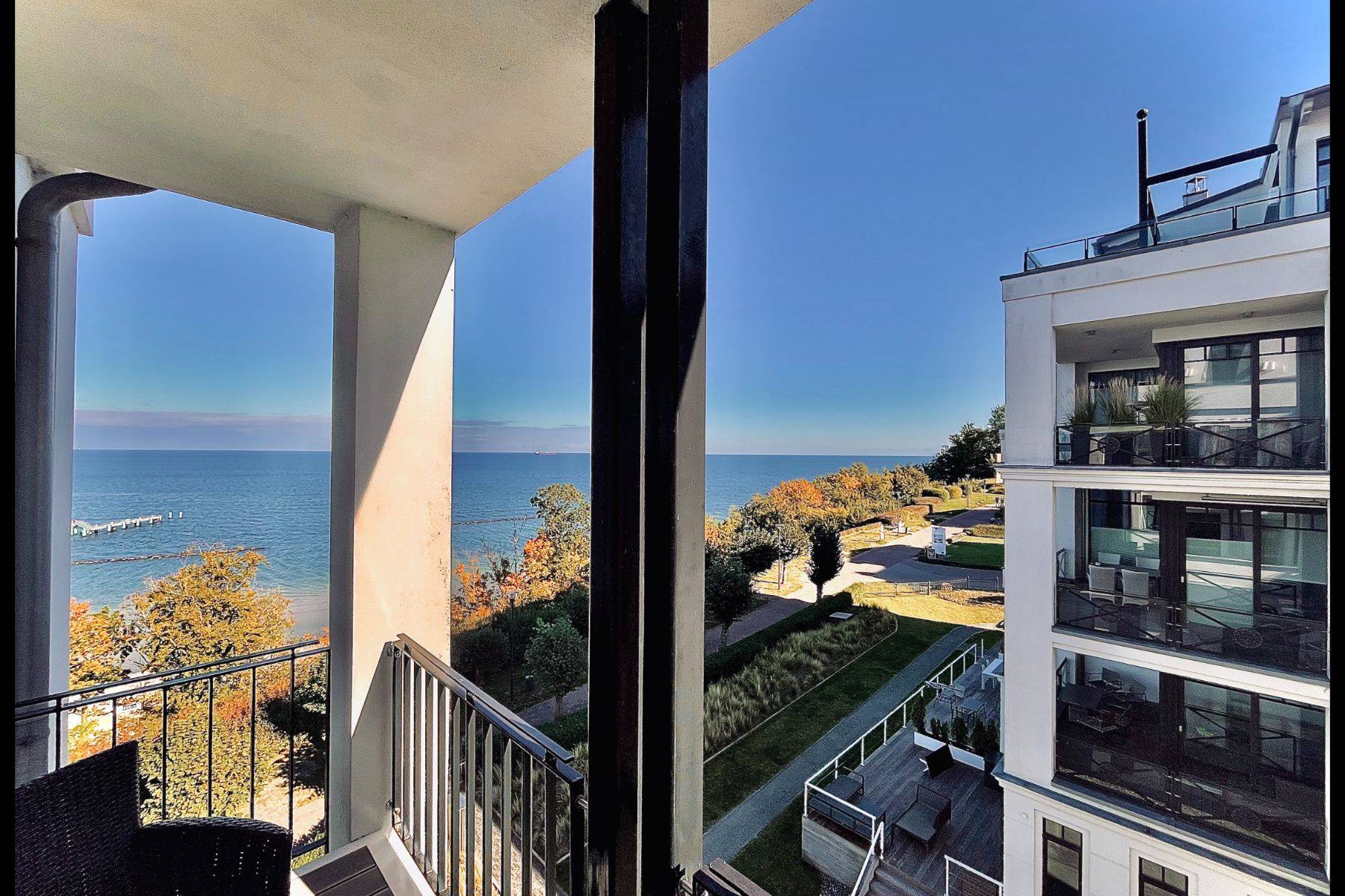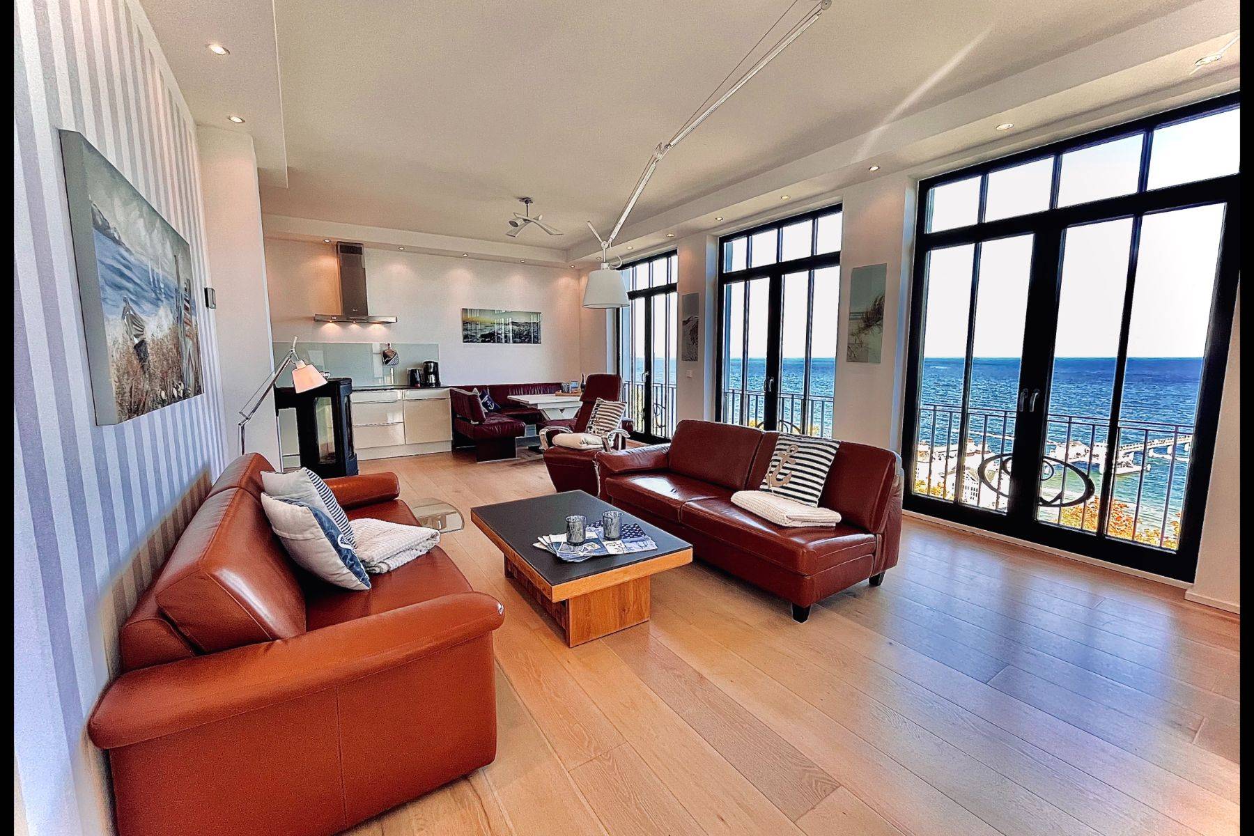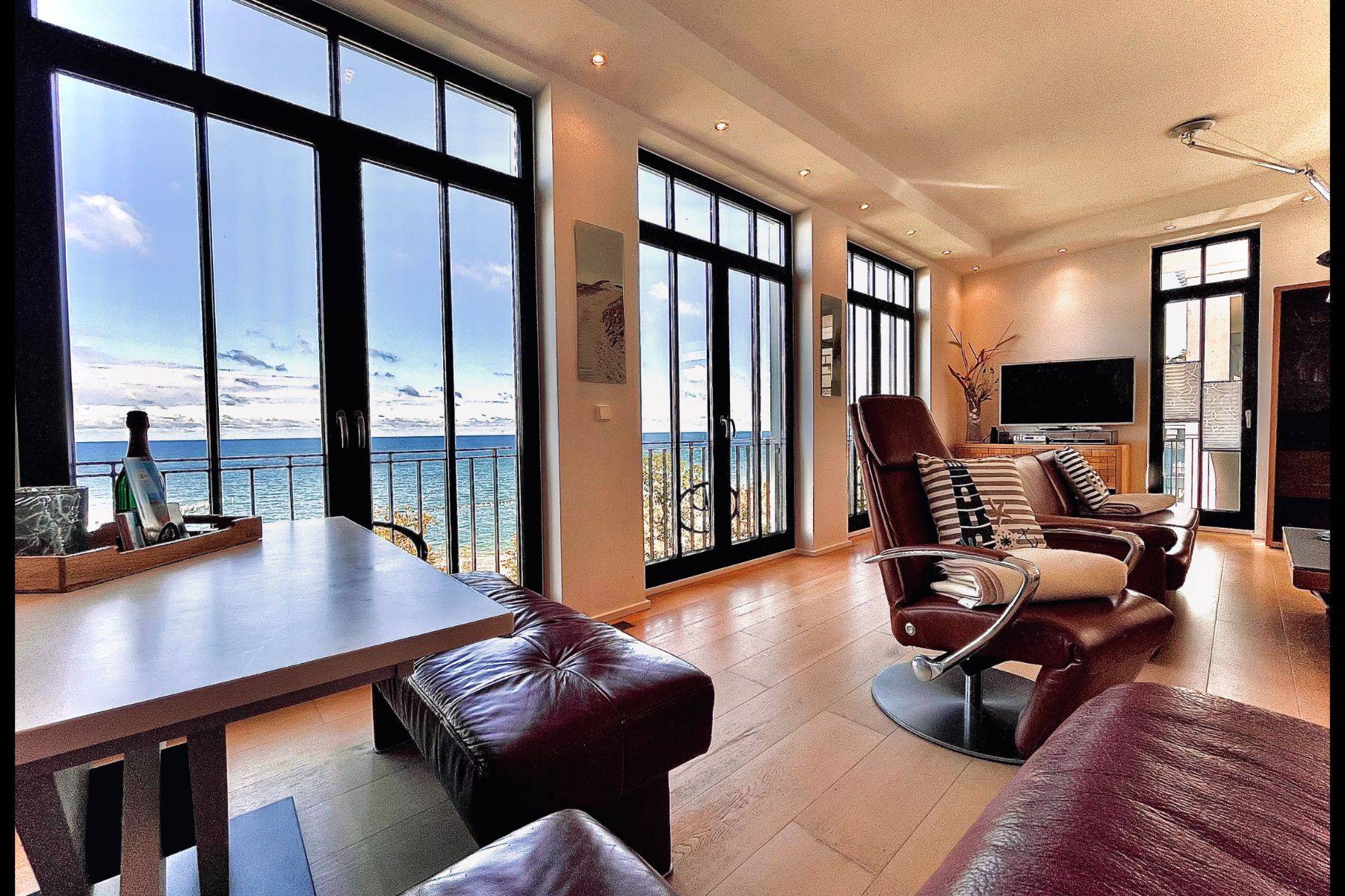 Gerne öffnen wir bei Ihrer Ankunft eines der großen französischen Fenster für Sie – dann genießen Sie aus fast 100 Metern Höhe den atemberaubenden Blick über die Ostsee, auf die Selliner Seebrücke und die Kreidefelsen der Stubbenkammer.