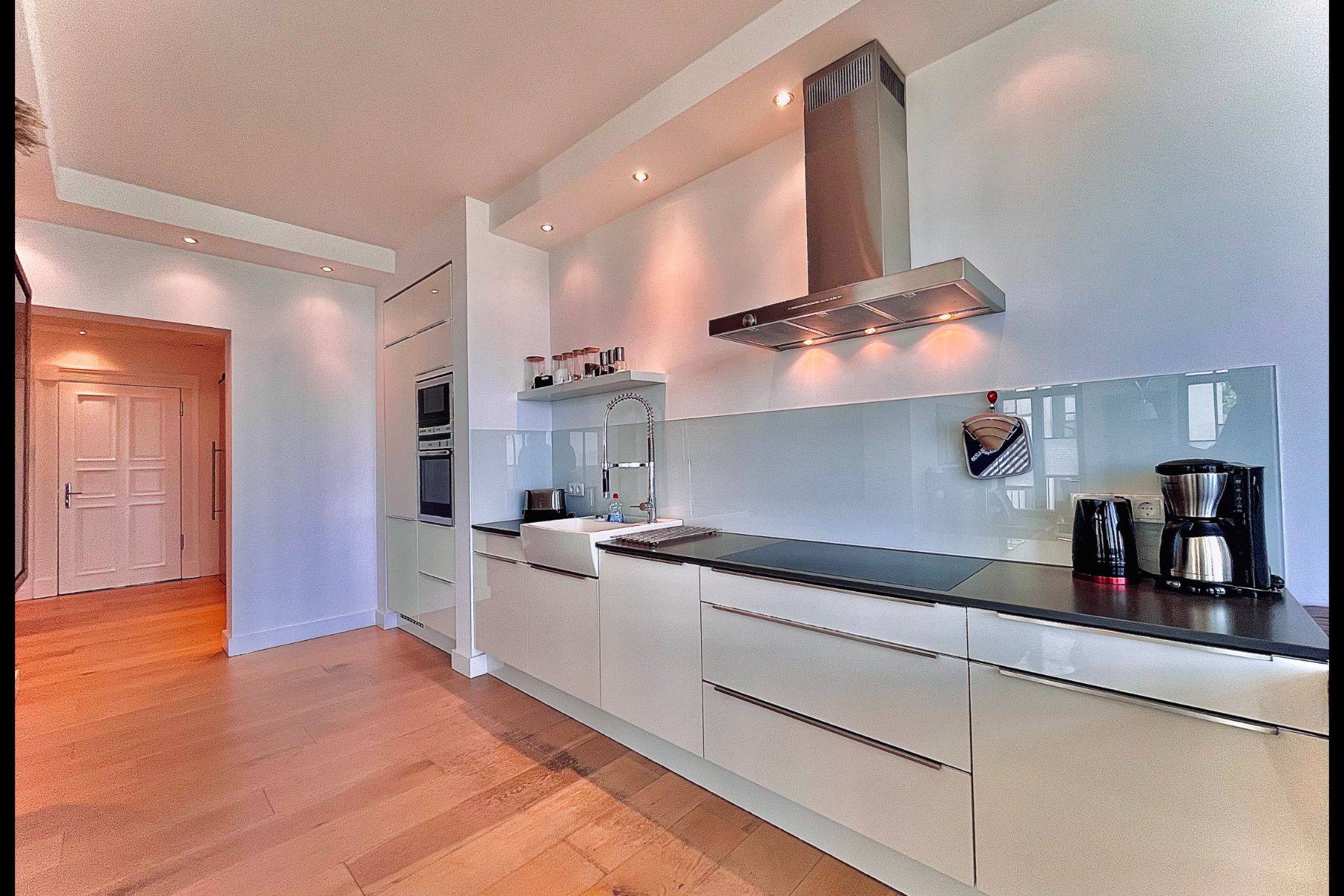 Voll ausgestattete Küche mit modernen Geräten, Geschirr & Gläsern