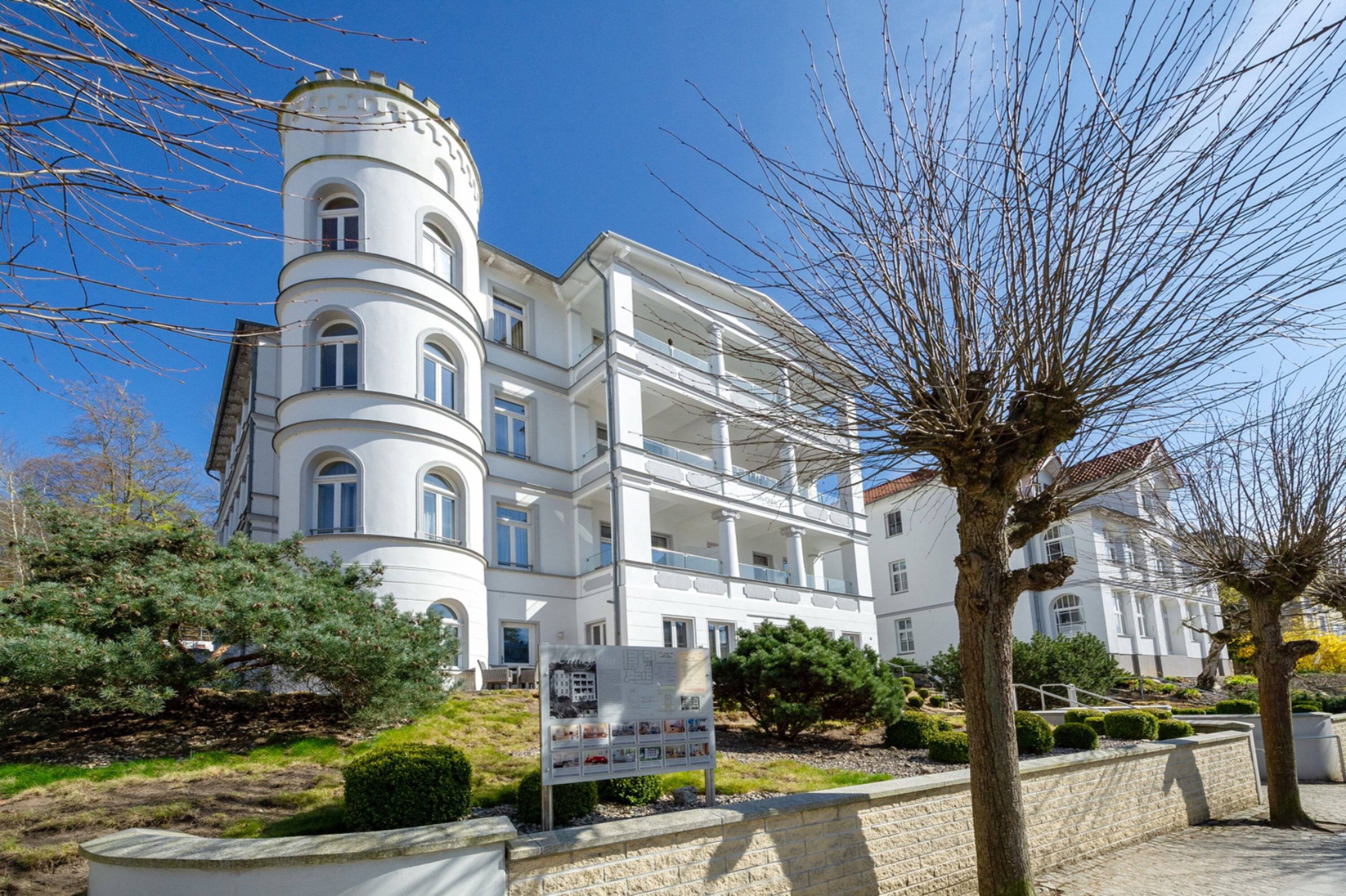 Die prachtvolle Wilhelmstraße, die von imposanten Villen in Bäderarchitektur und Bäumen geprägt ist, führt am oberen Ende direkt zum feinsandigen Badestrand und dem Meer. Die wunderbare Villa Odin befindet sich nur etwa 250 Meter vom Strand entfernt und gehört zu den beeindruckendsten Villen in Sellin, in der sich die Ferienwohnung Amapola befindet.