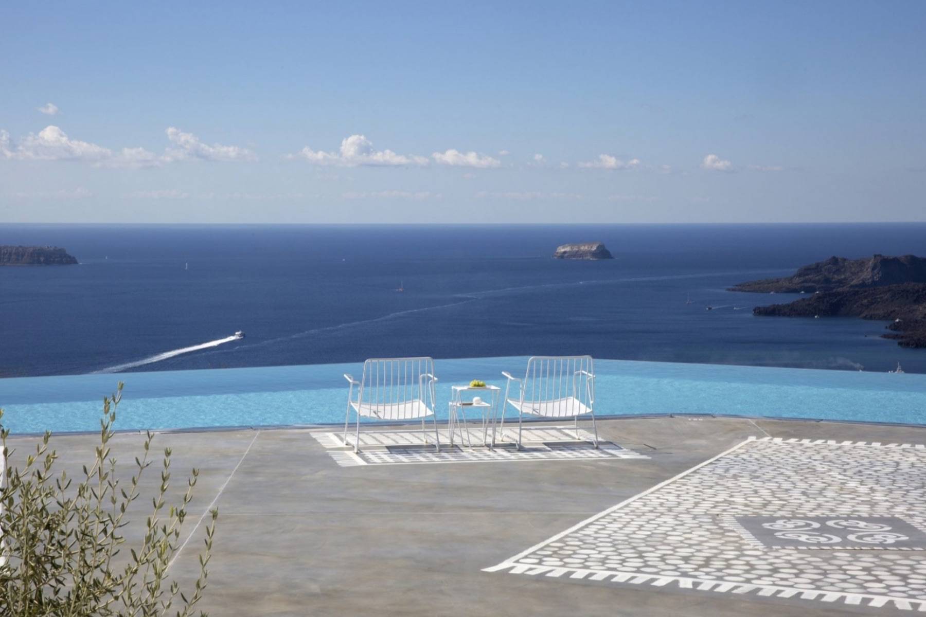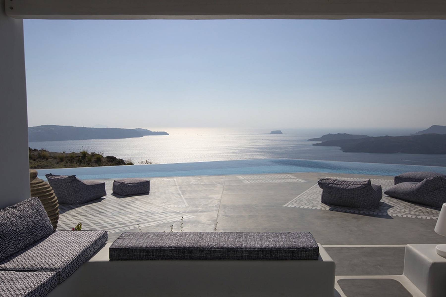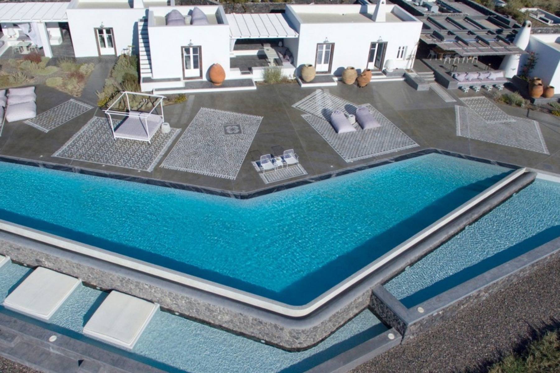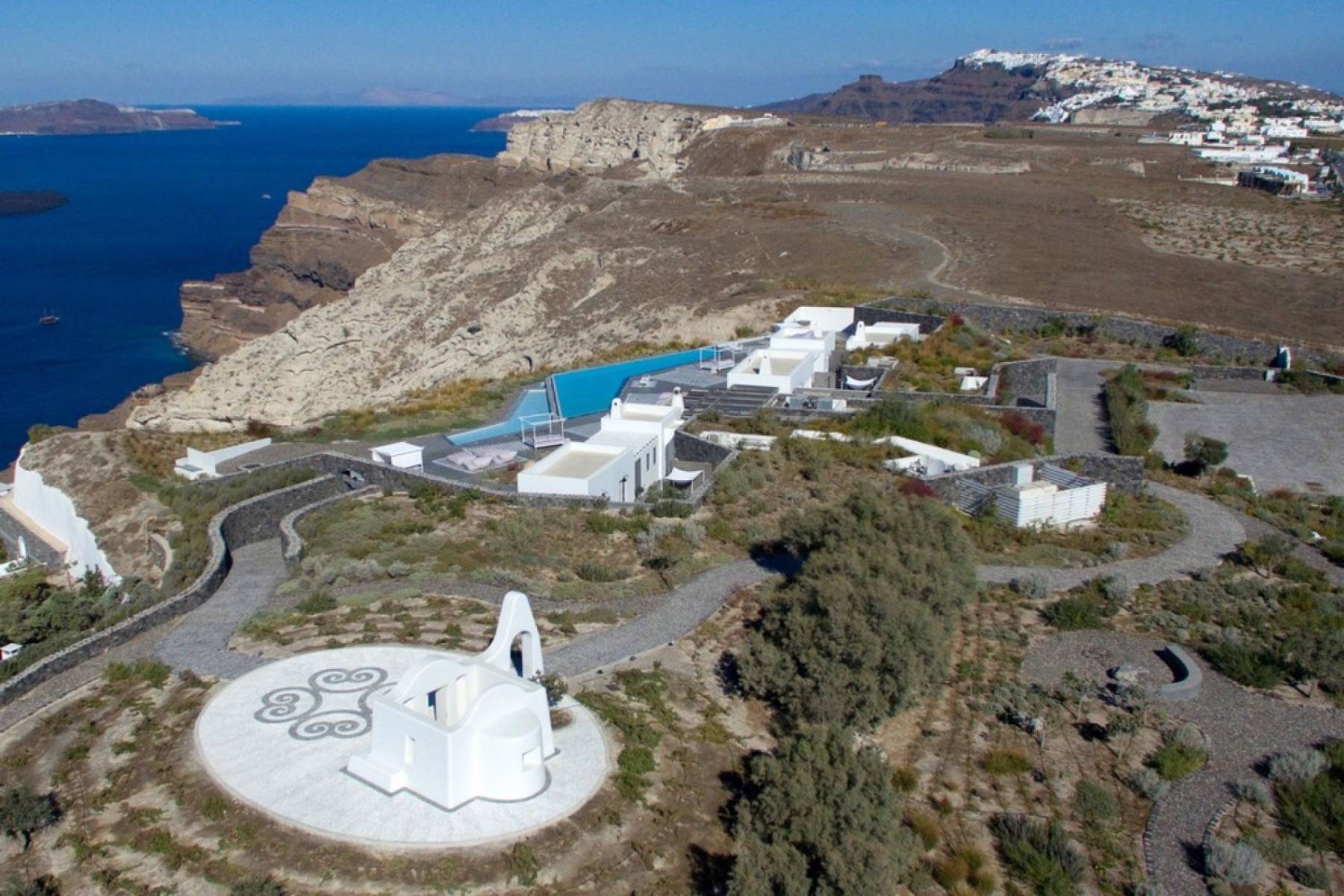Ganz vorne am Rand einer Klippe befindet sich auf einem etwa 8.000 qm großen Areal die Luxus Villa Erosantorini. Zwischen der Villa und der Meeresoberfläche liegen mehrere Hundert Meter, was einen atemberaubenden Panoramameerblick ermöglicht.