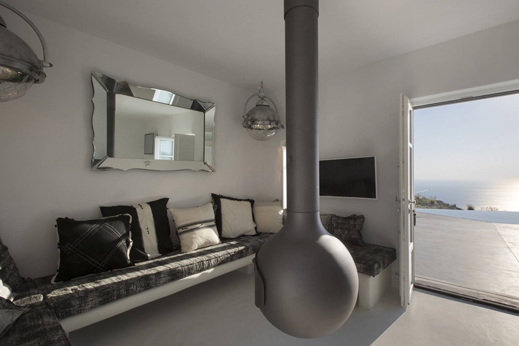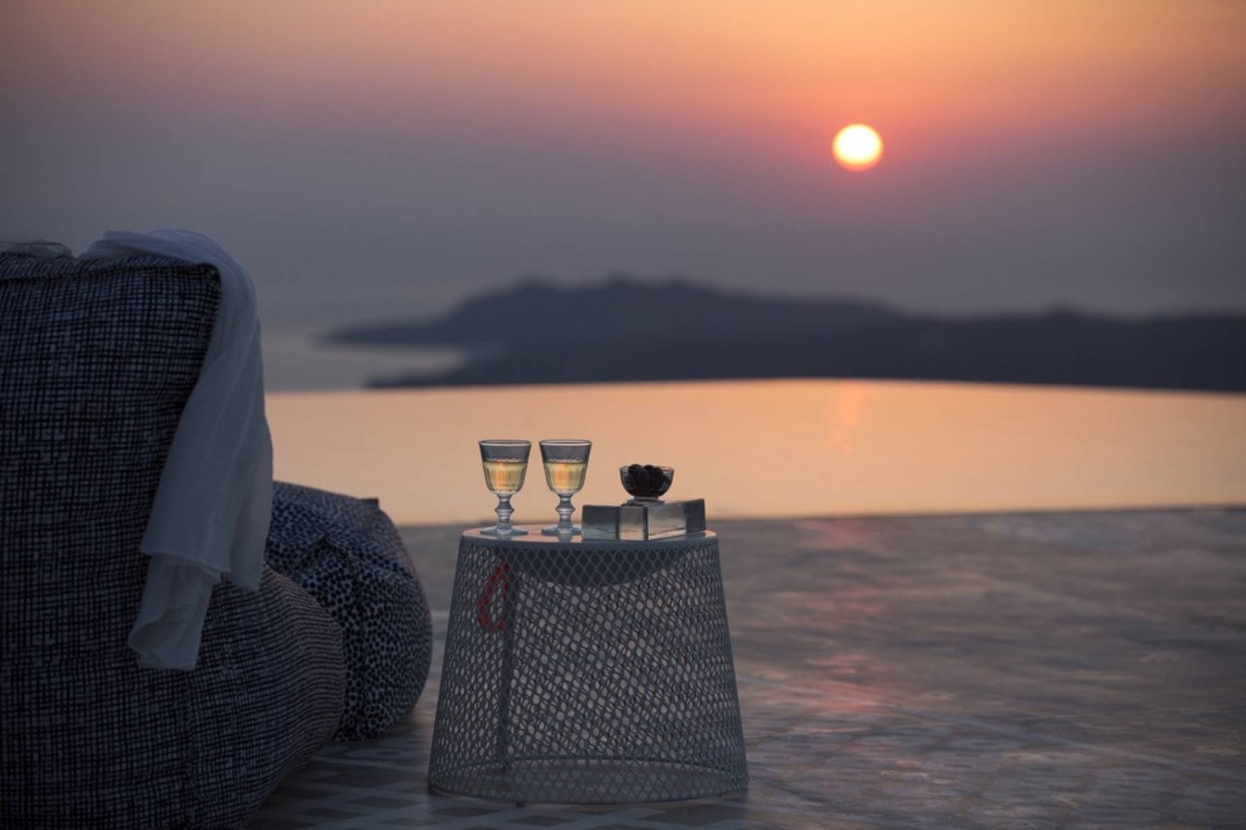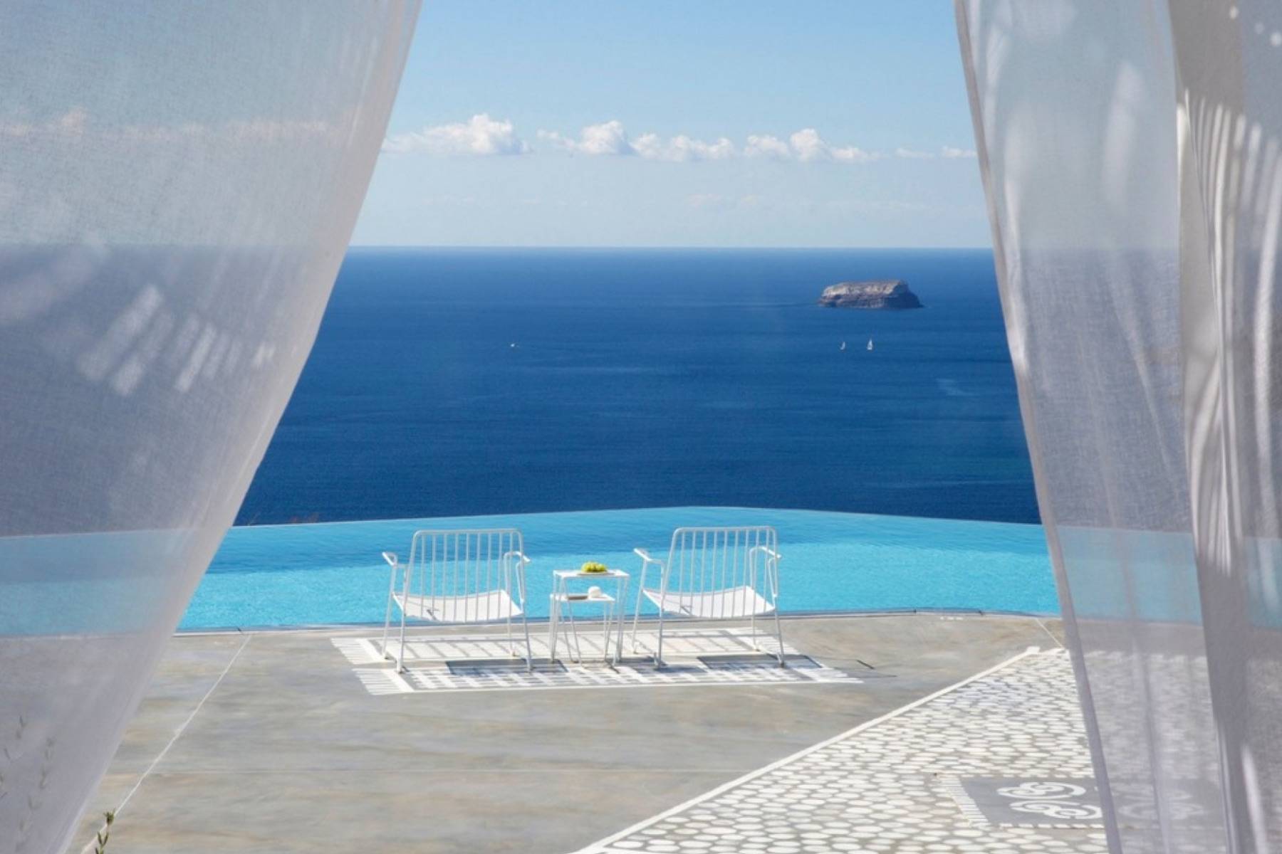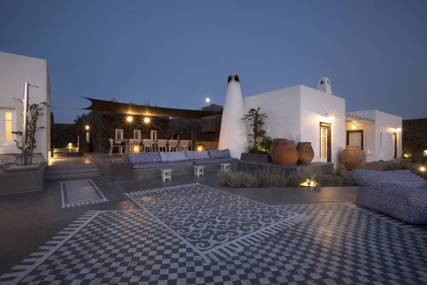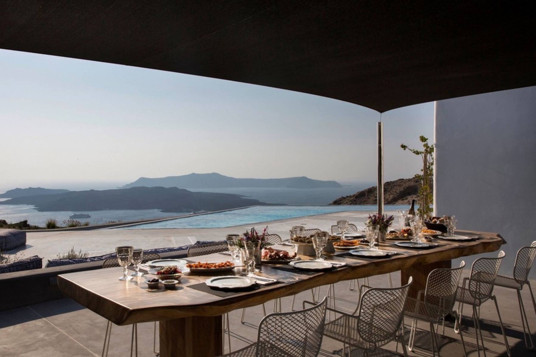 Ganz vorne am Rand einer Klippe befindet sich auf einem etwa 8.000 qm großen Areal die Luxus Villa Erosantorini. Zwischen der Villa und der Meeresoberfläche liegen mehrere Hundert Meter, was einen atemberaubenden Panoramameerblick ermöglicht.