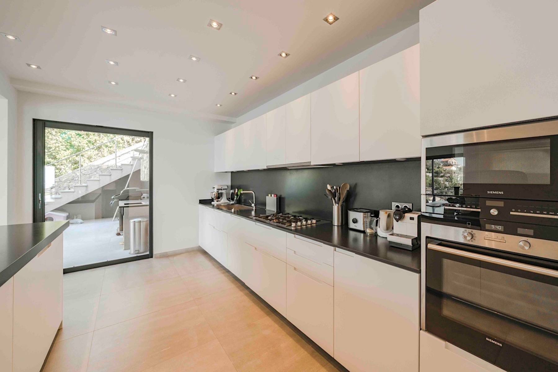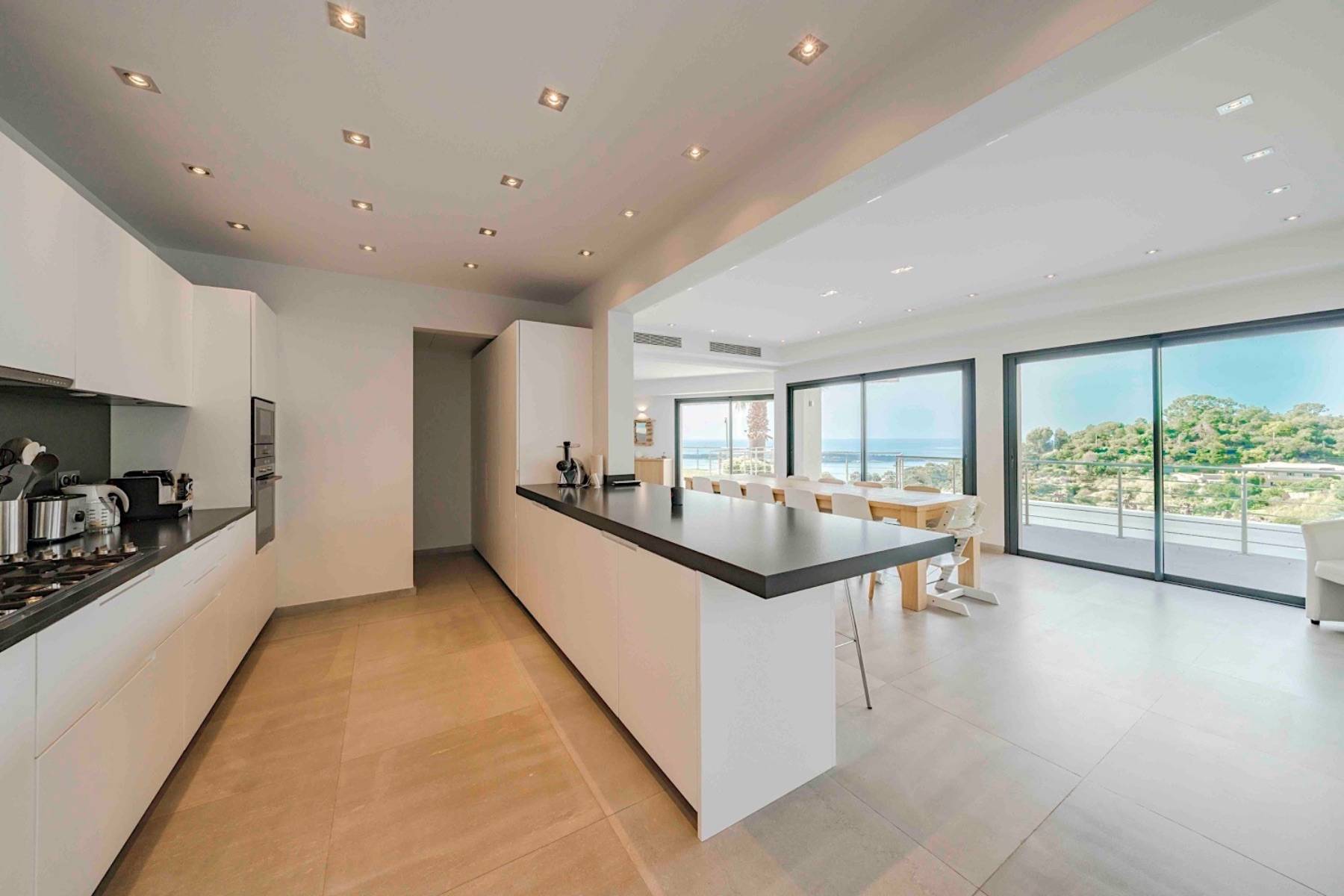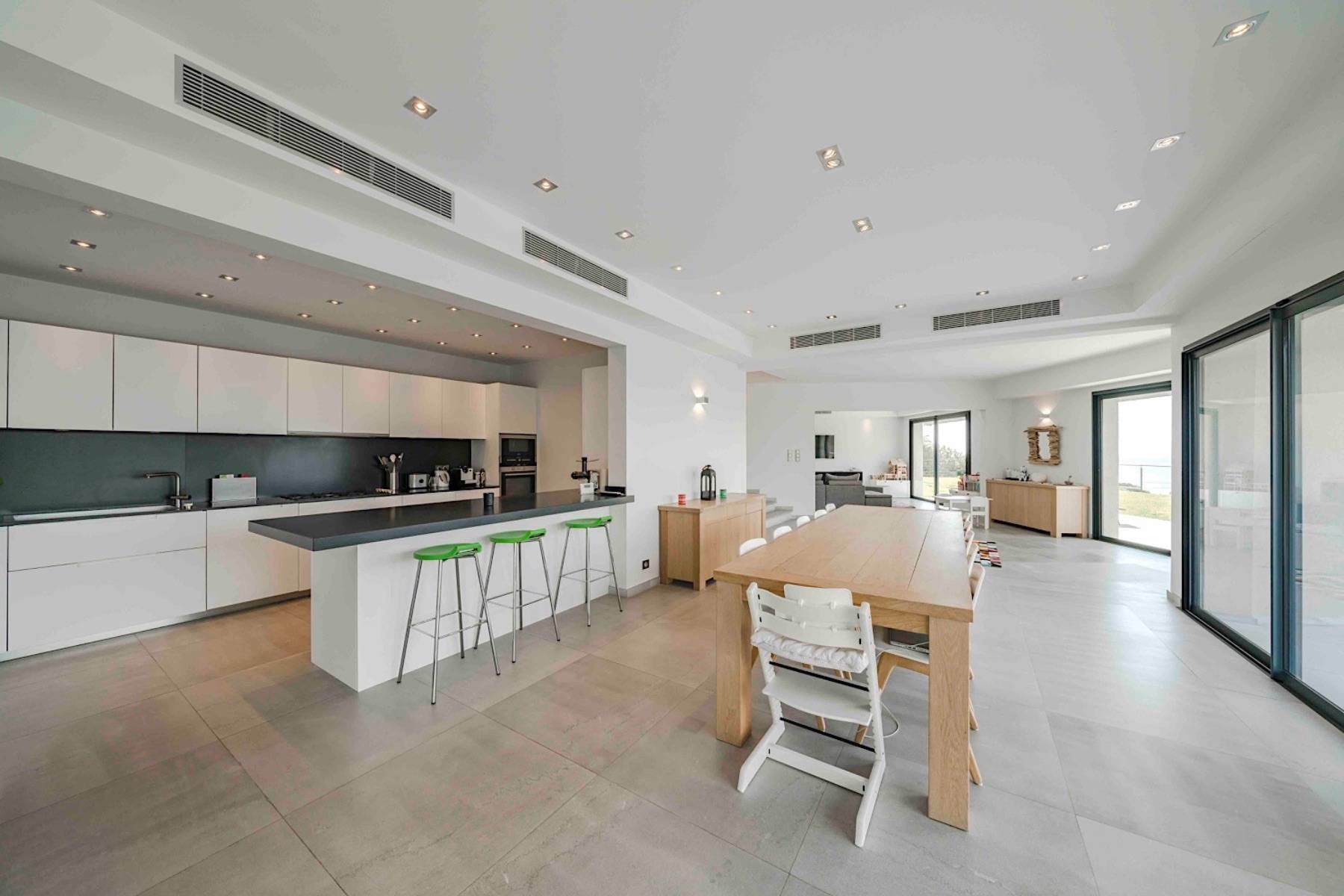 Auf der rechten Seite befindet sich die voll ausgestattete moderne Luxus- Küche mit Frühstückstheke und der geräumige Essbereich, an dem 10-12 Personen vor einem Flachbildfernseher Platz nehmen können. Der Blick durch die großen Schiebetüren führt direkt auf die große Sonnenterrasse samt Pool und auf das Meer.