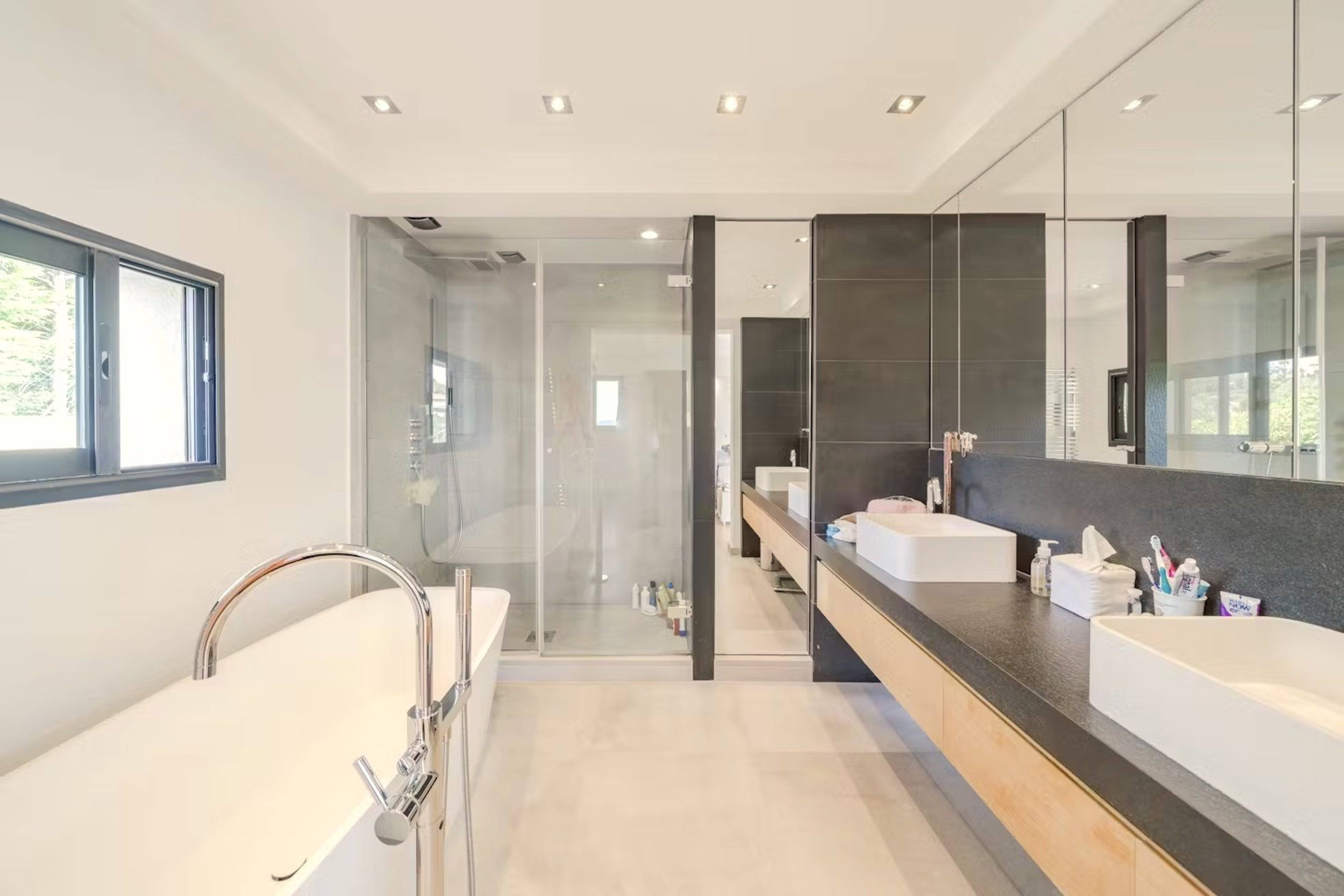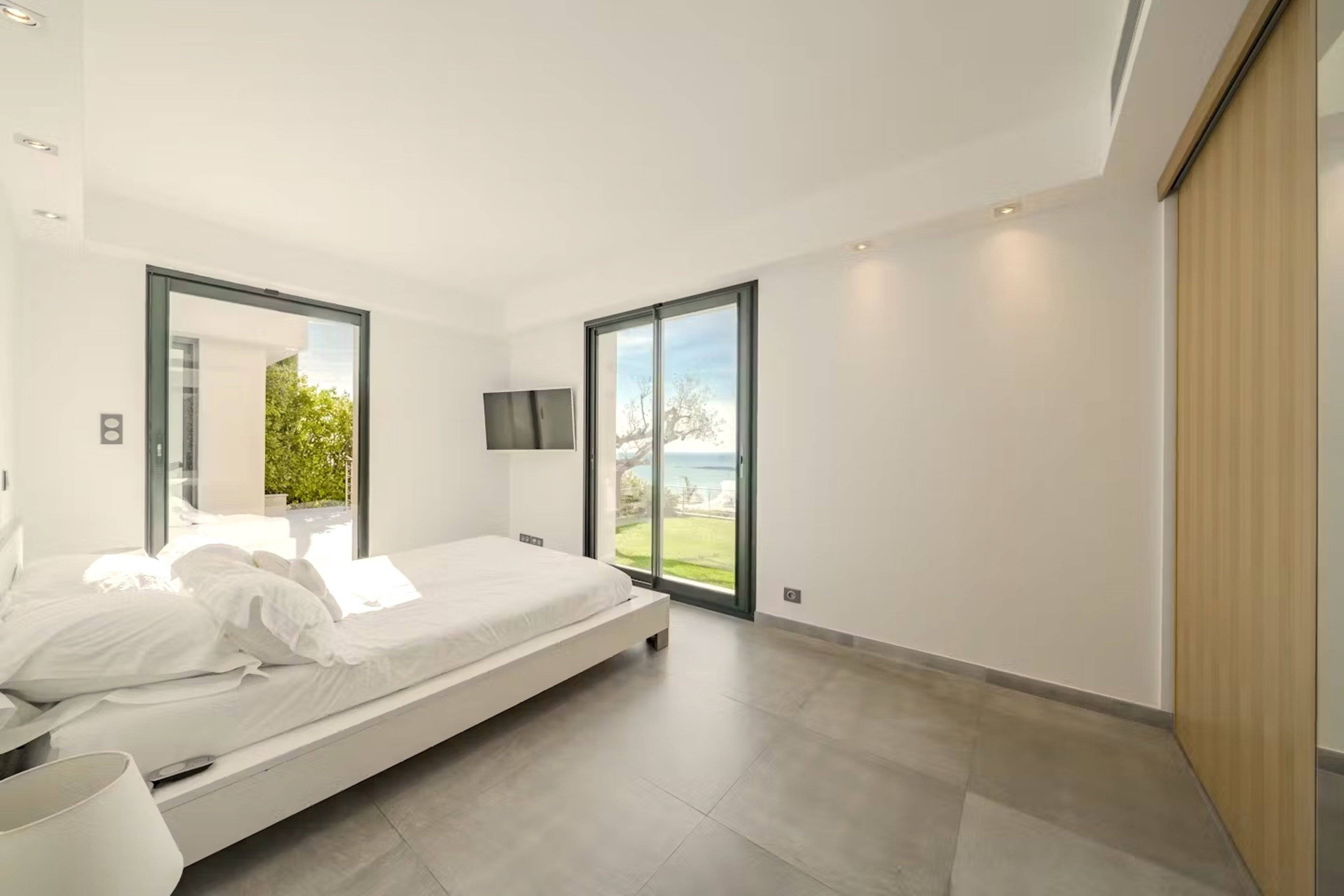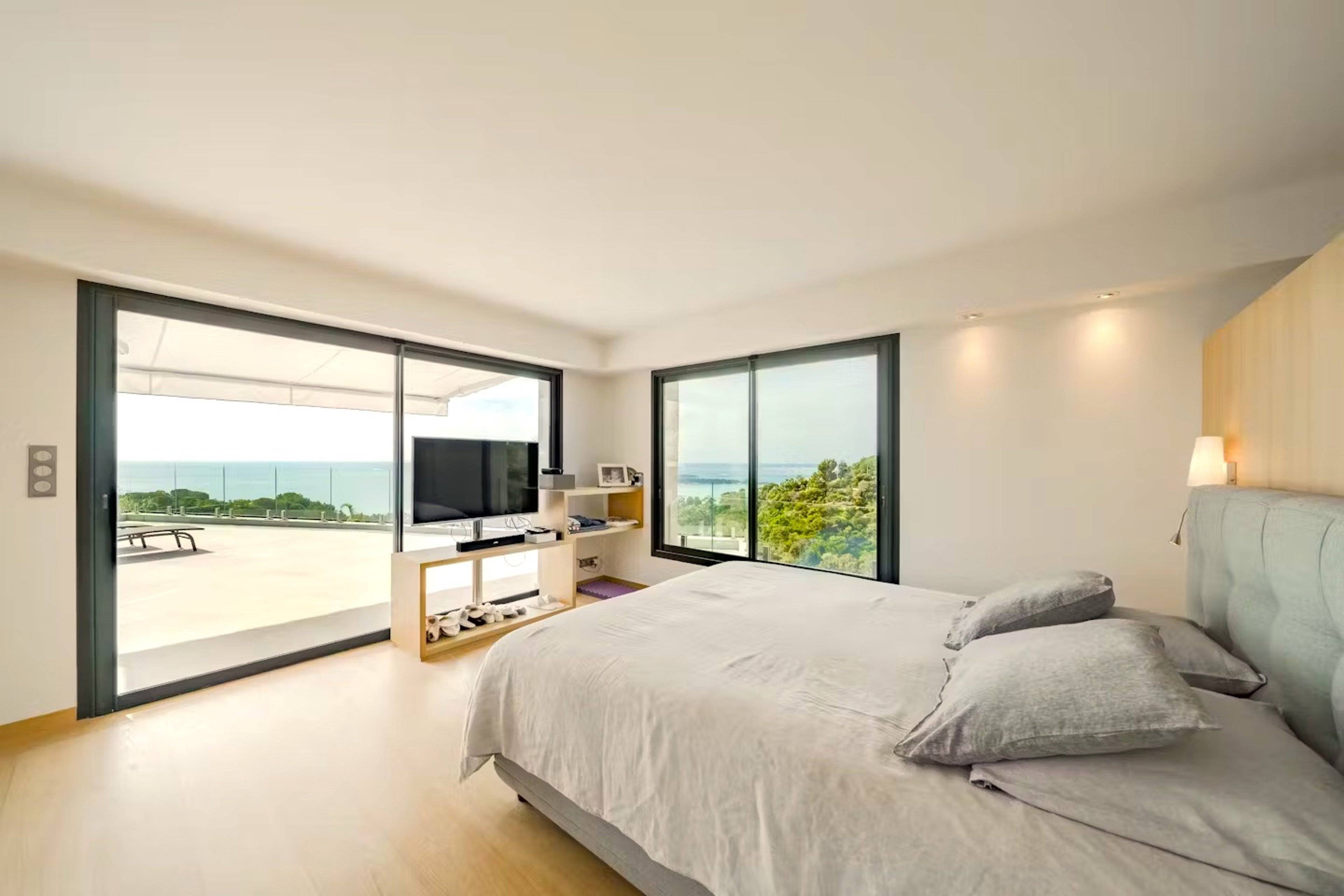 Die oberste Etage ist exklusiv für das große Hauptschlafzimmer reserviert, das mit einem Kingsize-Bett, einem Flachbild-Sat-TV, einer Klimaanlage und einem geräumigen begehbaren Ankleide ausgestattet ist. Die großen, deckenhohen Schiebetüren öffnen sich zu einer riesigen Dachterrasse mit Sitzgelegenheiten und Sonnenliegen, um die einzigartige Privatsphäre und den atemberaubenden Blick auf die Küste von Cannes zu genießen. Das moderne Bad mit Marmor verfügt über zwei Waschbecken, eine Regendusche, eine Badewanne und eine separate Toilette.
