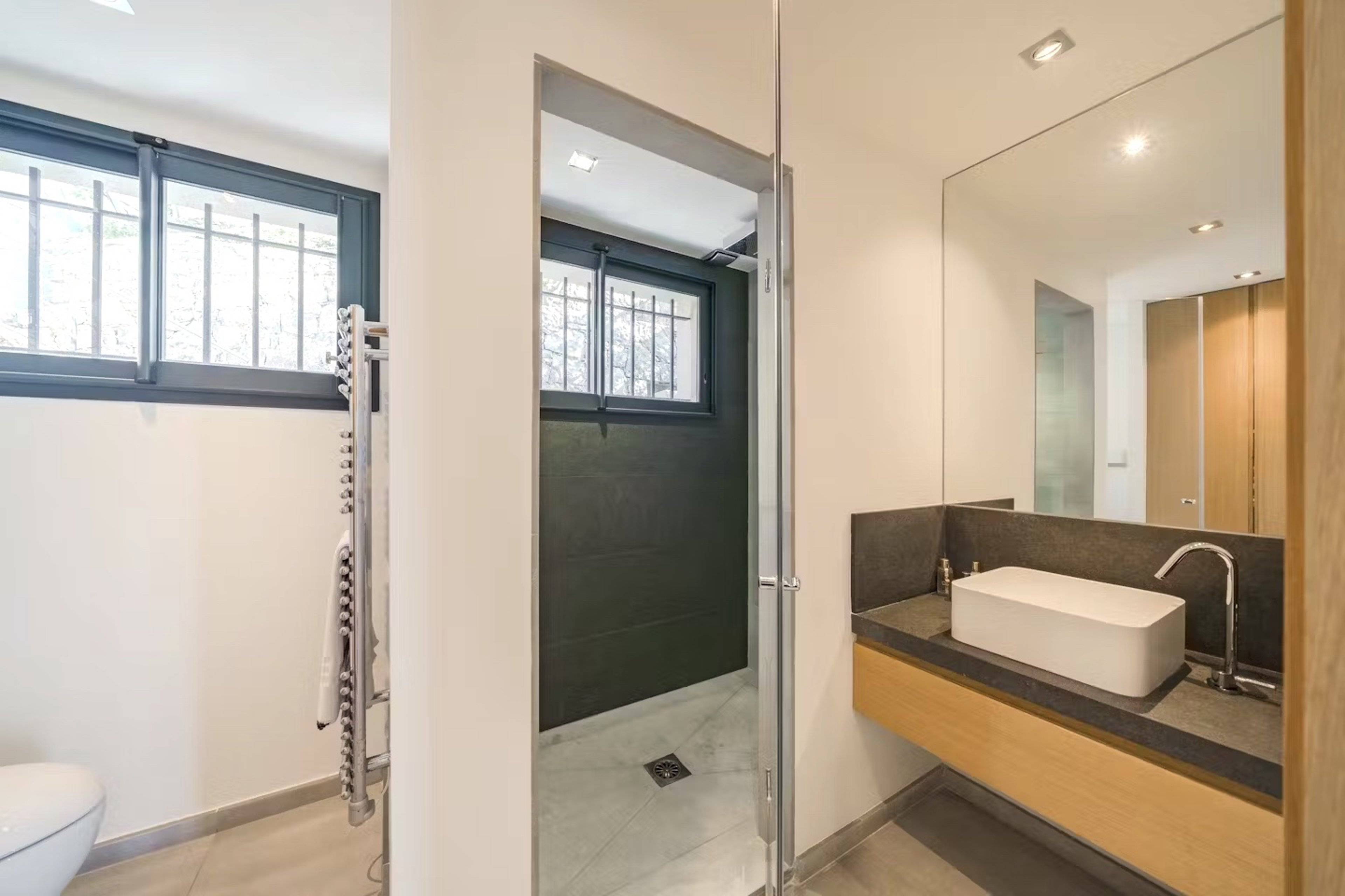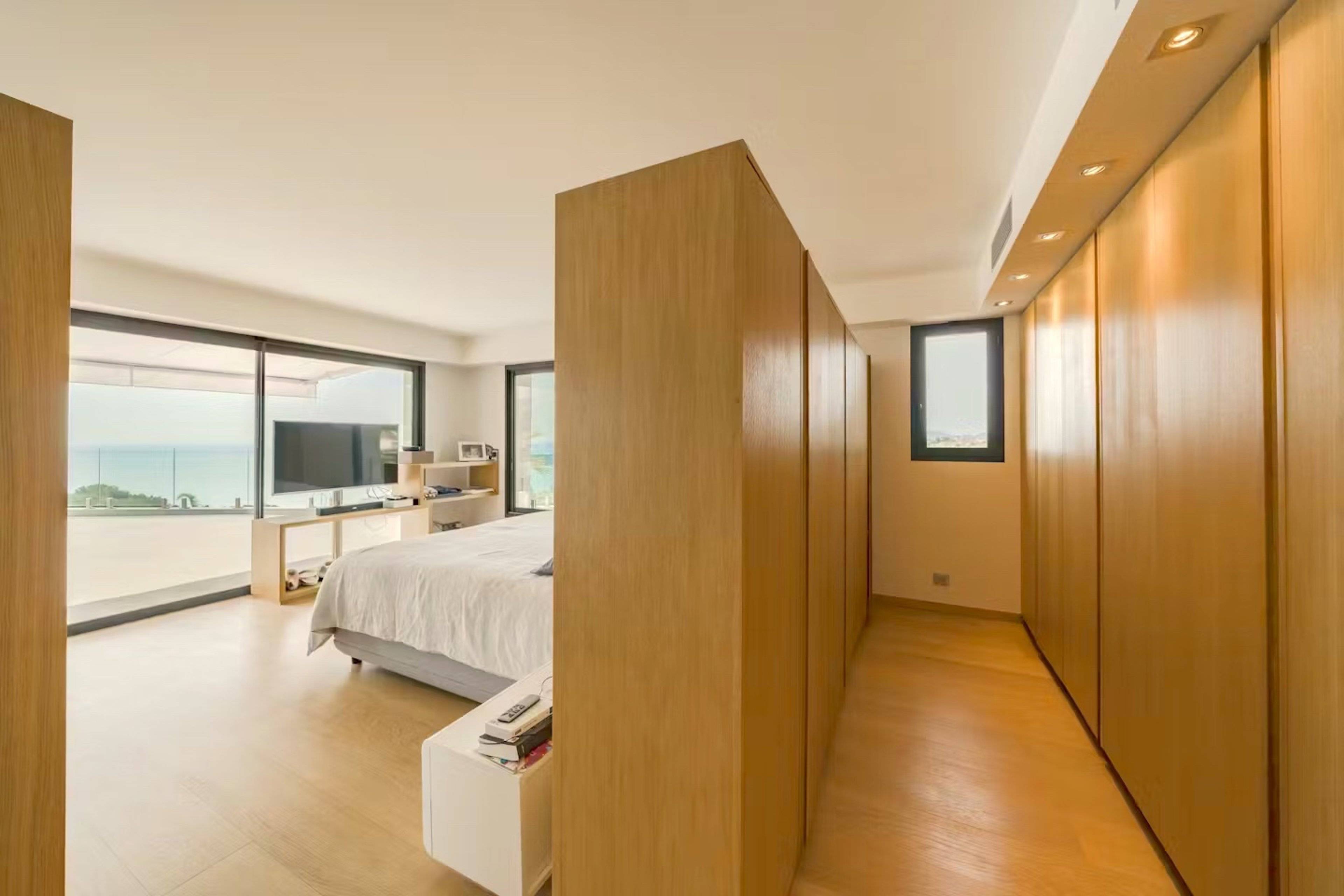 Die anderen vier Schlafzimmer sind zwischen dem Zwischengeschoss und der unteren Etage aufgeteilt. Drei Schlafzimmer sind mit Doppelbetten (ca. 140 x 200 cm), ein Schlafzimmer hat zwei Einzelbetten, alle mit Klimaanlage, Kleiderschränken und Fernseher mit direktem Zugang zu den verschiedenen Terrassen und Rasenflächen. Zwei Schlafzimmer haben ein eigenes Bad mit Doppelwaschbecken, Badewanne, Dusche und WC. Die anderen beiden Schlafzimmer teilen sich ein Badezimmer mit einem Waschbecken, einer Duschkabine und einer Toilette.