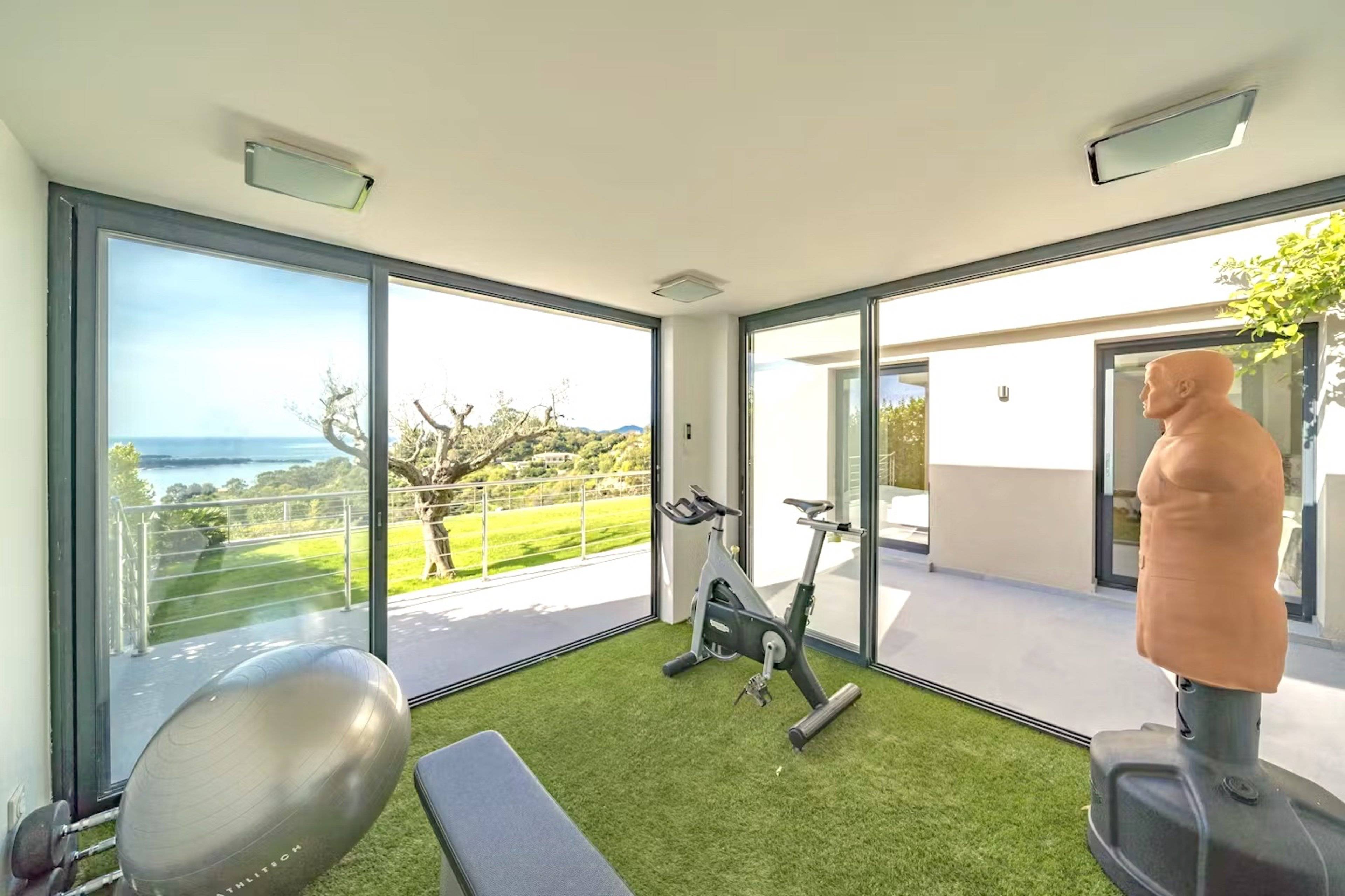 Neben dem Wohnzimmer befindet sich ein Arbeitszimmer, sowie ein separates, klimatisiertes Fitnessstudio, das mit Cardio- und Box-Attributen und verschiedenen Hantelsets ausgestattet ist.