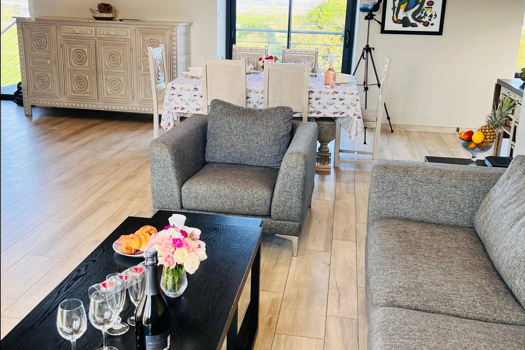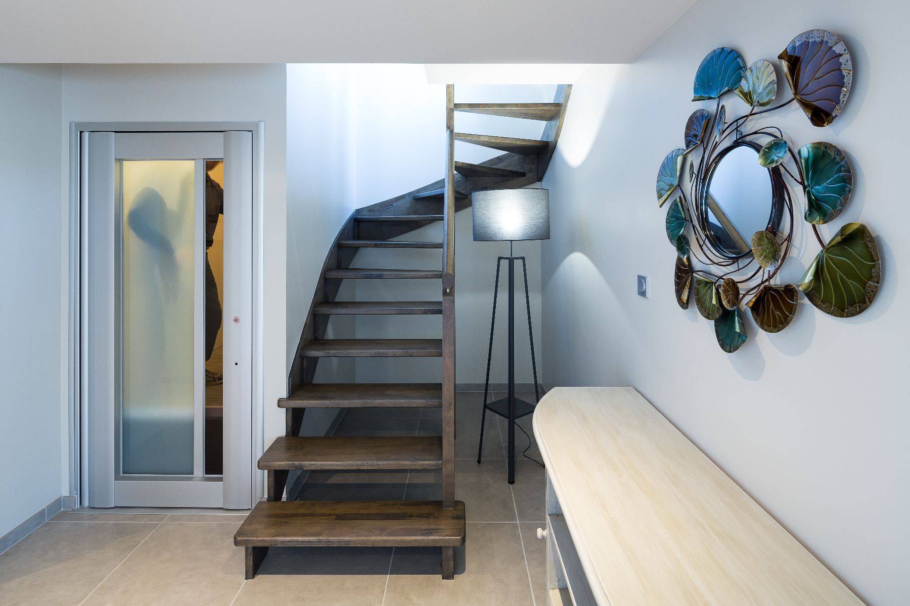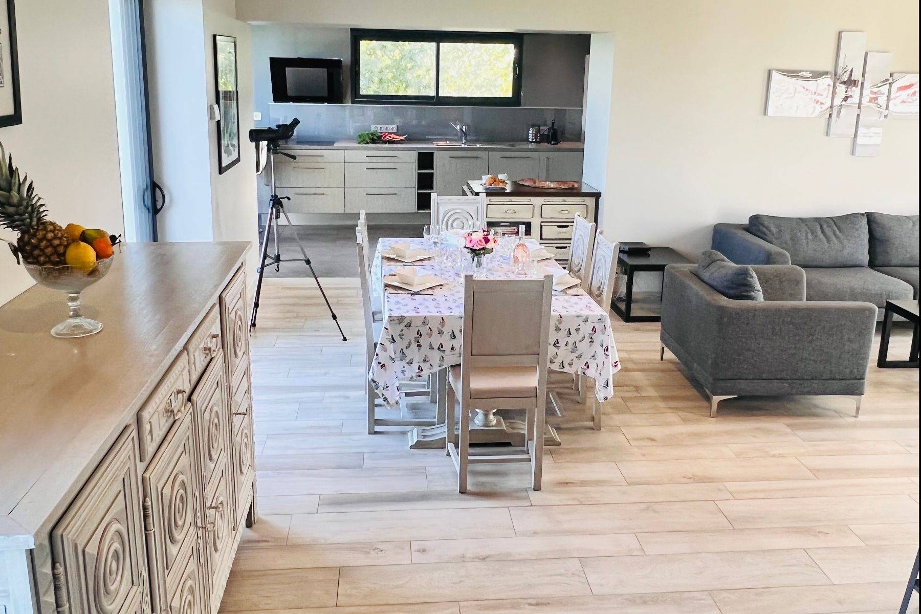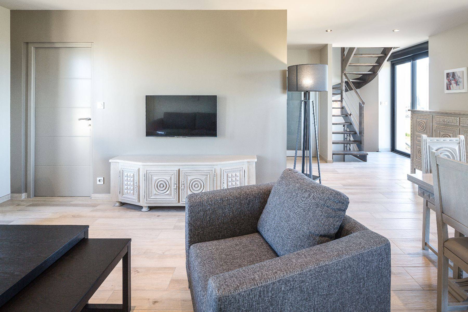 Nachdem man angekommen ist und sein Auto vor dem Haus auf dem privaten Parkplatz abgestellt hat - kommt man in einen schönen Eingangsbereich mit großer Garderobe - durch die Industriescheiben können Sie Ihren Jacuzzi und Ihr Dampfbad schon im SPA Bereich sehen. Weiter geht es entweder per Treppe oder bequem - mit dem Aufzug in den Wohnbereich der ersten Etage. Wie schön man aufs Meer blicken kann - kann man gar nicht in Worte fassen - egal wo Sie sich befinden im Raum - das Meer liegt Ihnen zu Füßen - übrigens ist der schönste feine Sandstrand nicht weit vom Haus entfernt. Der Wohnbereich ist sehr offen und großzügig - eine große gut ausgestattete Küche -natürlich mit tollem Meerblick- ist mit dem Essbereich /Esstisch für 6 Personen und dem Wohnzimmer Bereich mit Sofas verbunden.