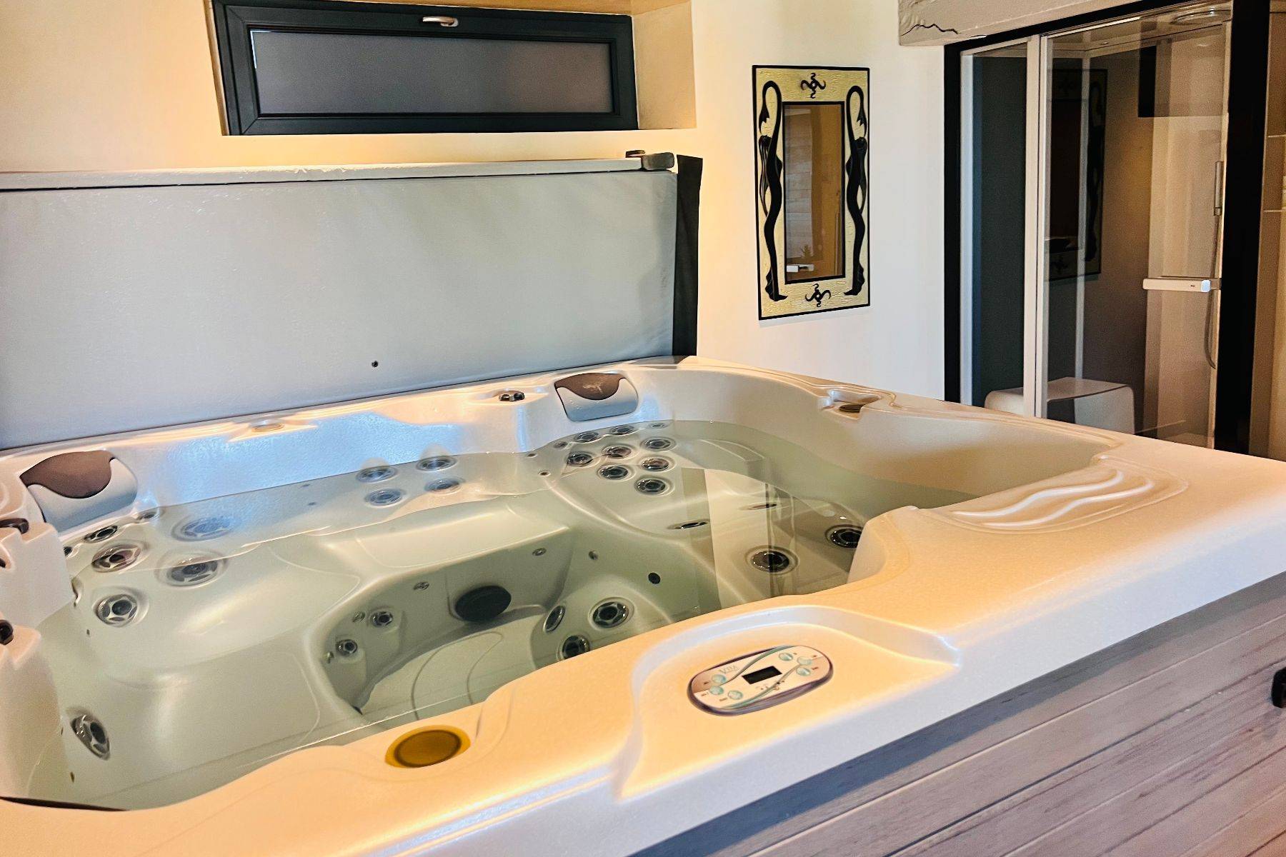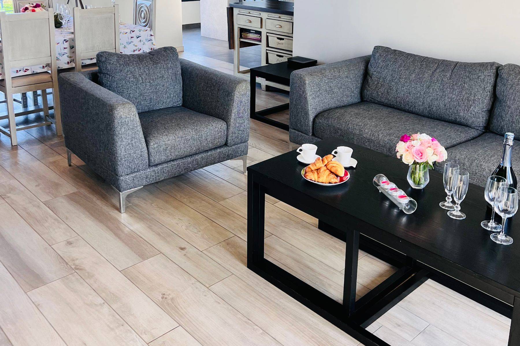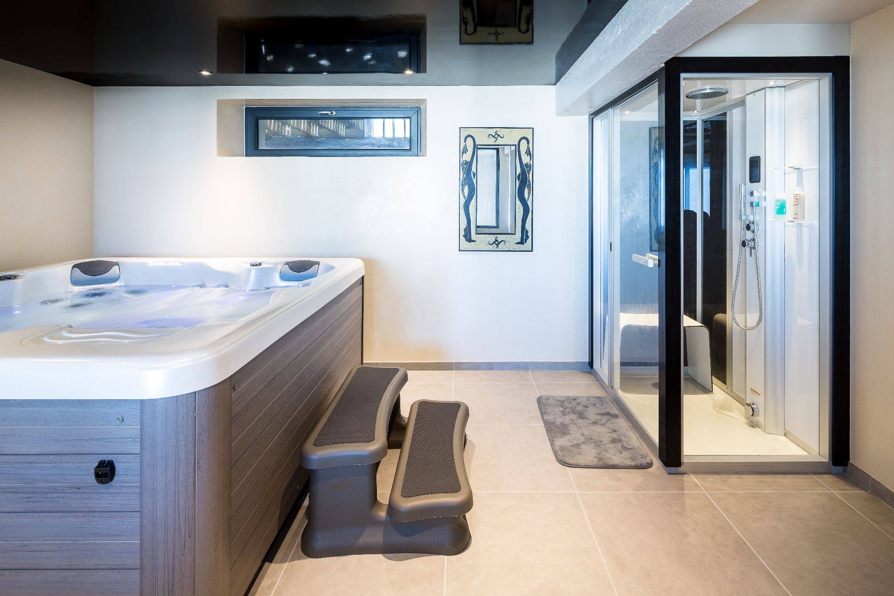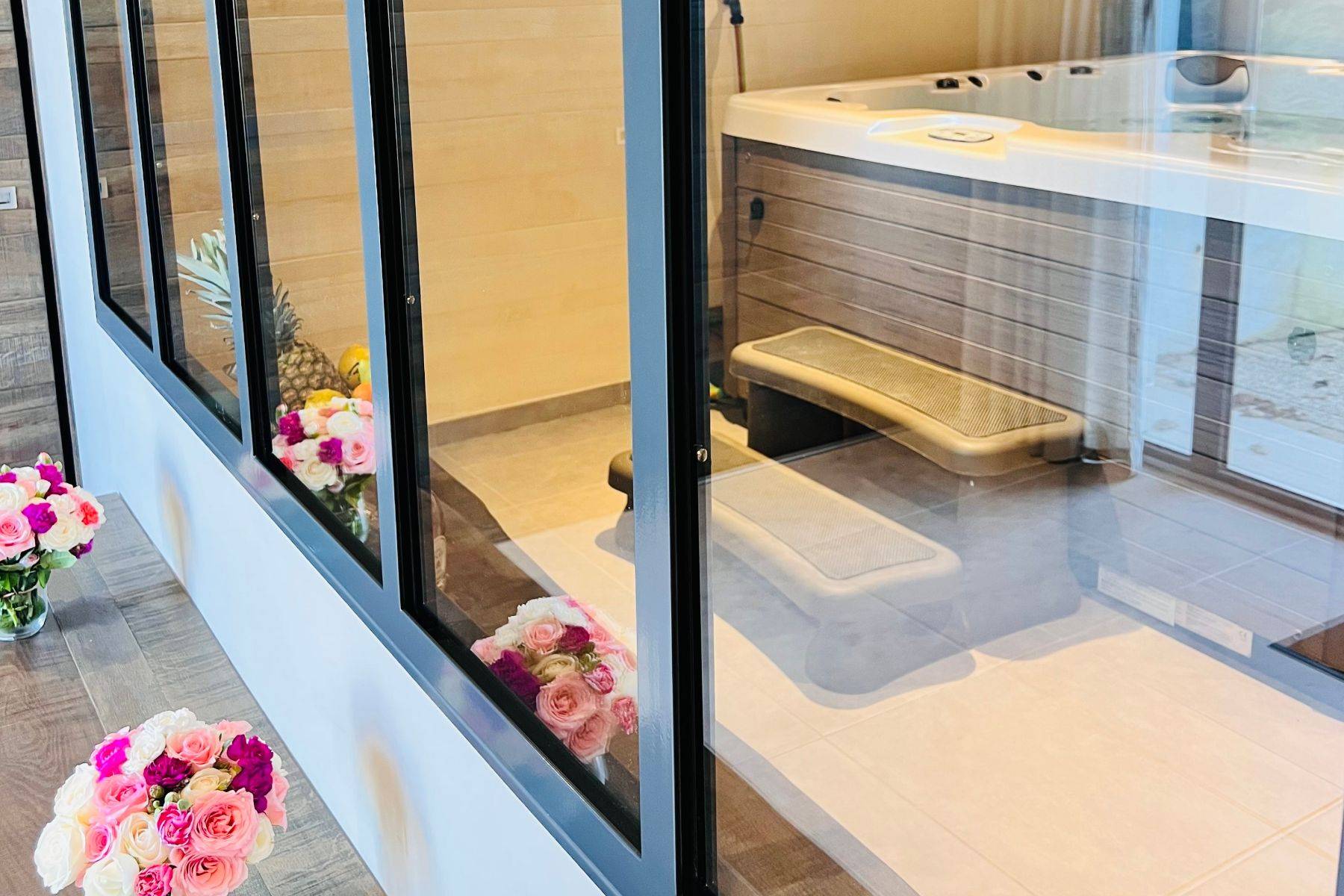 Nachdem man angekommen ist und sein Auto vor dem Haus auf dem privaten Parkplatz abgestellt hat - kommt man in einen schönen Eingangsbereich mit großer Garderobe - durch die Industriescheiben können Sie Ihren Jacuzzi und Ihr Dampfbad schon im SPA Bereich sehen. Weiter geht es entweder per Treppe oder bequem - mit dem Aufzug in den Wohnbereich der ersten Etage. Wie schön man aufs Meer blicken kann - kann man gar nicht in Worte fassen - egal wo Sie sich befinden im Raum - das Meer liegt Ihnen zu Füßen - übrigens ist der schönste feine Sandstrand nicht weit vom Haus entfernt. Der Wohnbereich ist sehr offen und großzügig - eine große gut ausgestattete Küche -natürlich mit tollem Meerblick- ist mit dem Essbereich /Esstisch für 6 Personen und dem Wohnzimmer Bereich mit Sofas verbunden.