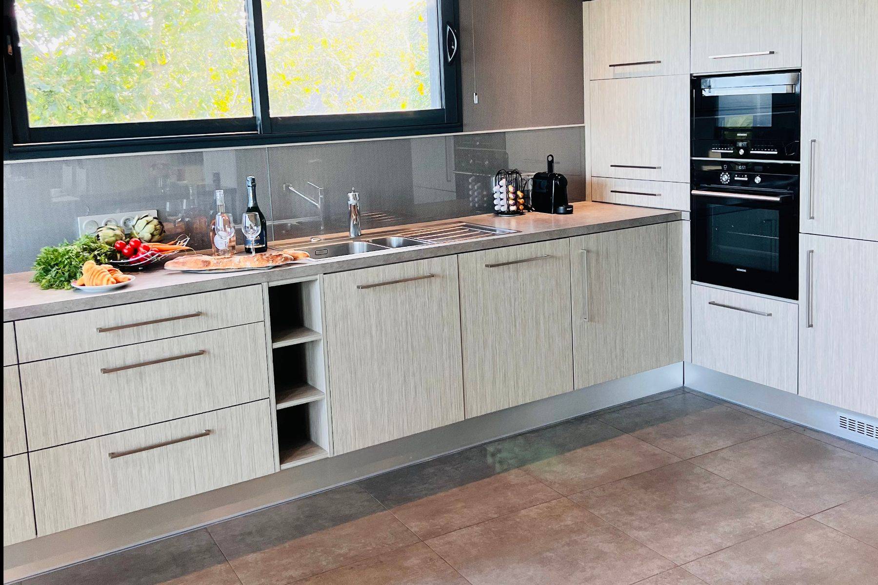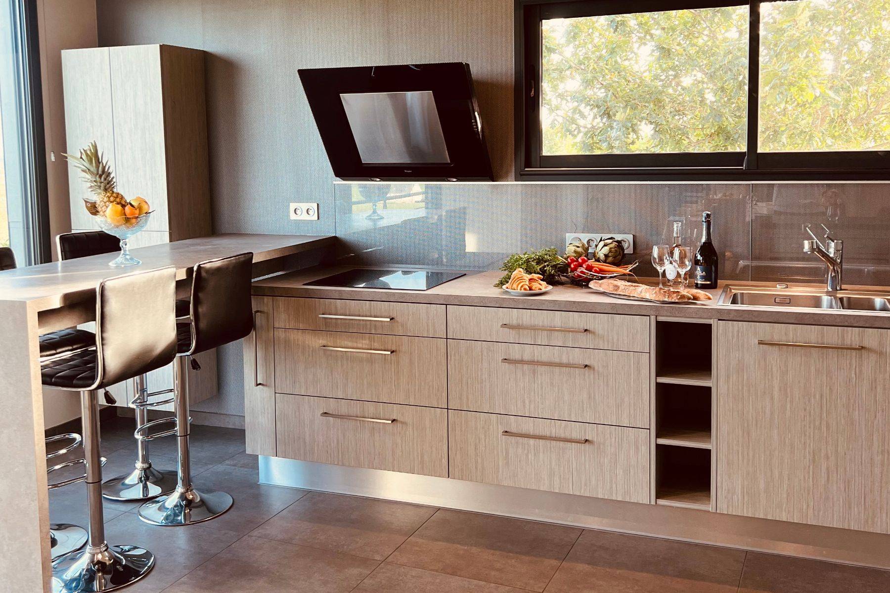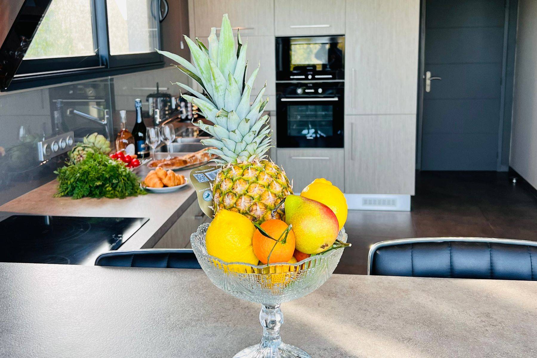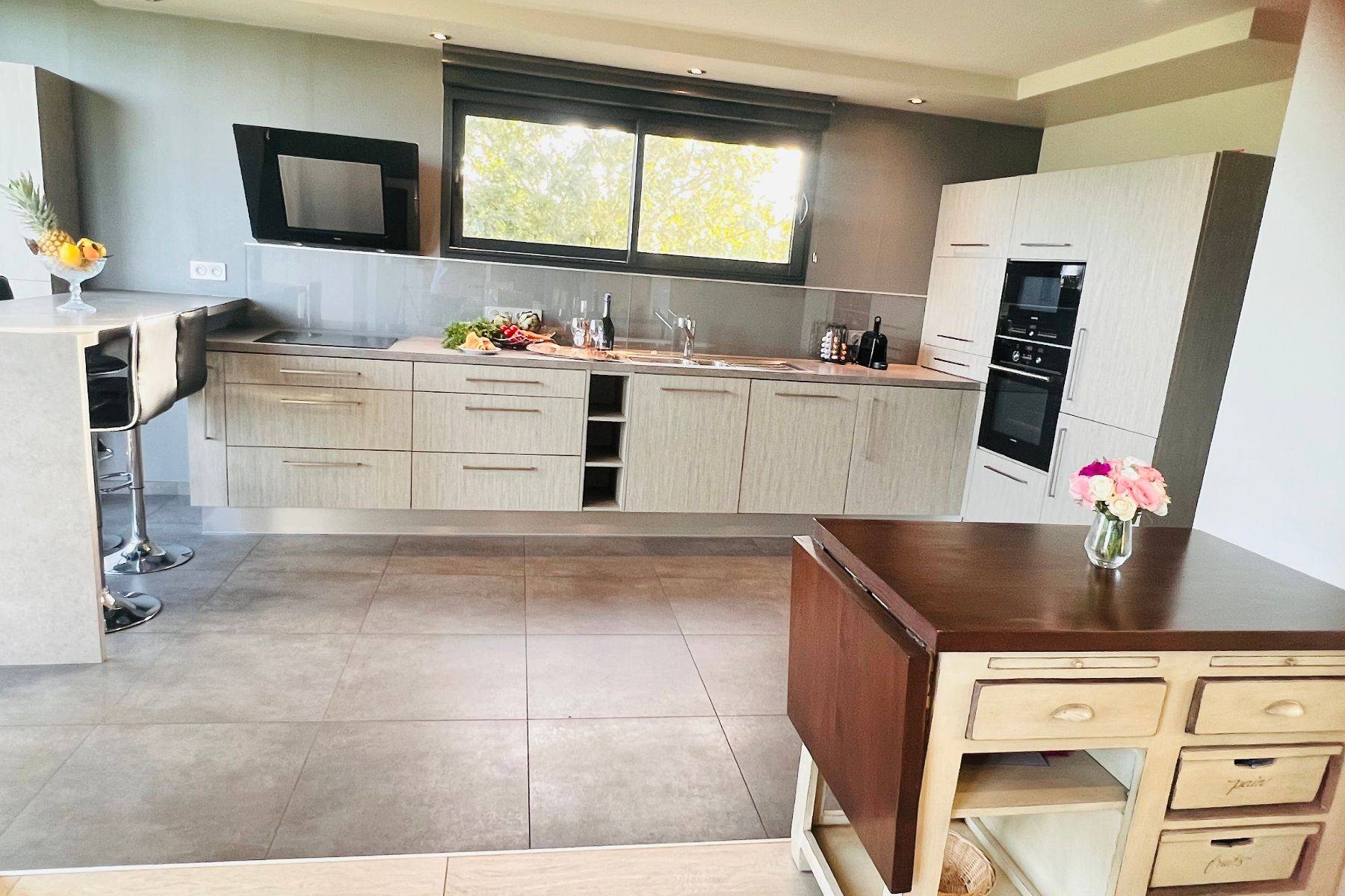 Und gleich in Richtung Garten (total eingezäunt) öffnet man die Großen Glasschiebetüren und ist auf der Süd Terrasse mit Sonnenliegen und Gartenmöbeln - der Weber Grill darf auch nicht fehlen. Neben dem Esstisch hat die Küche noch eine kleine Meerblick-Bar mit Zugang zu den Meerblickterrassen.