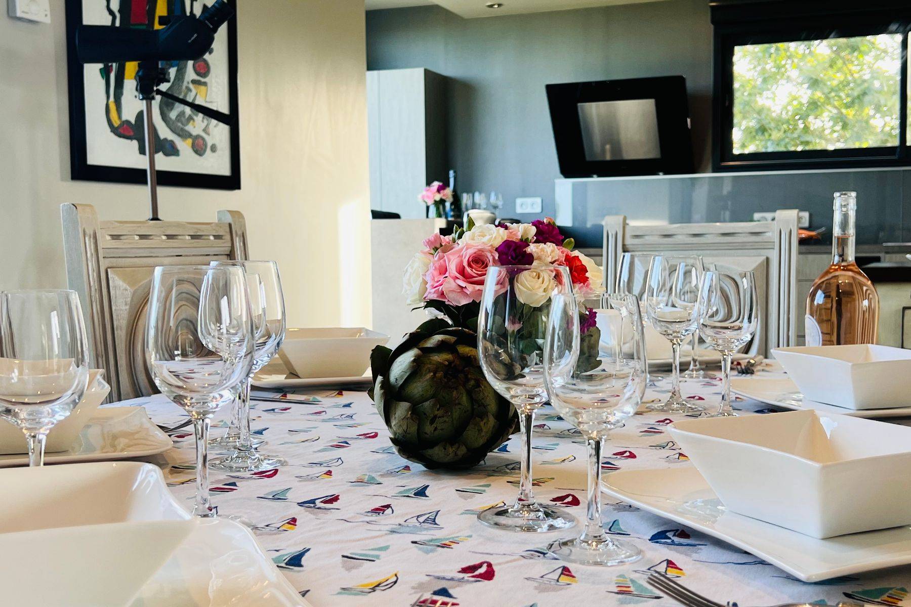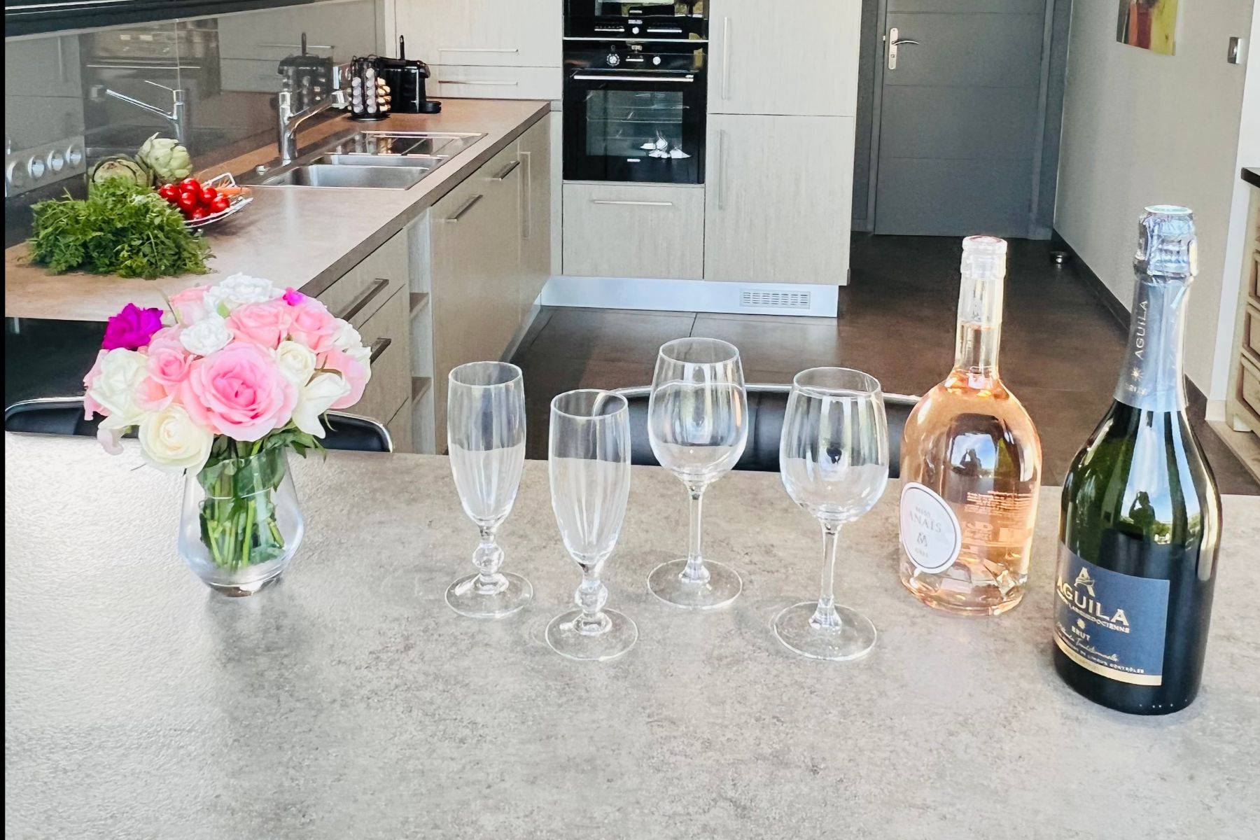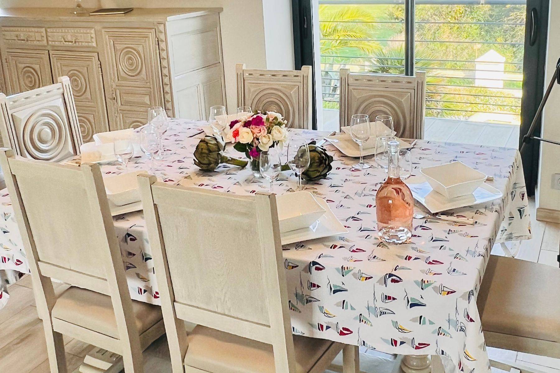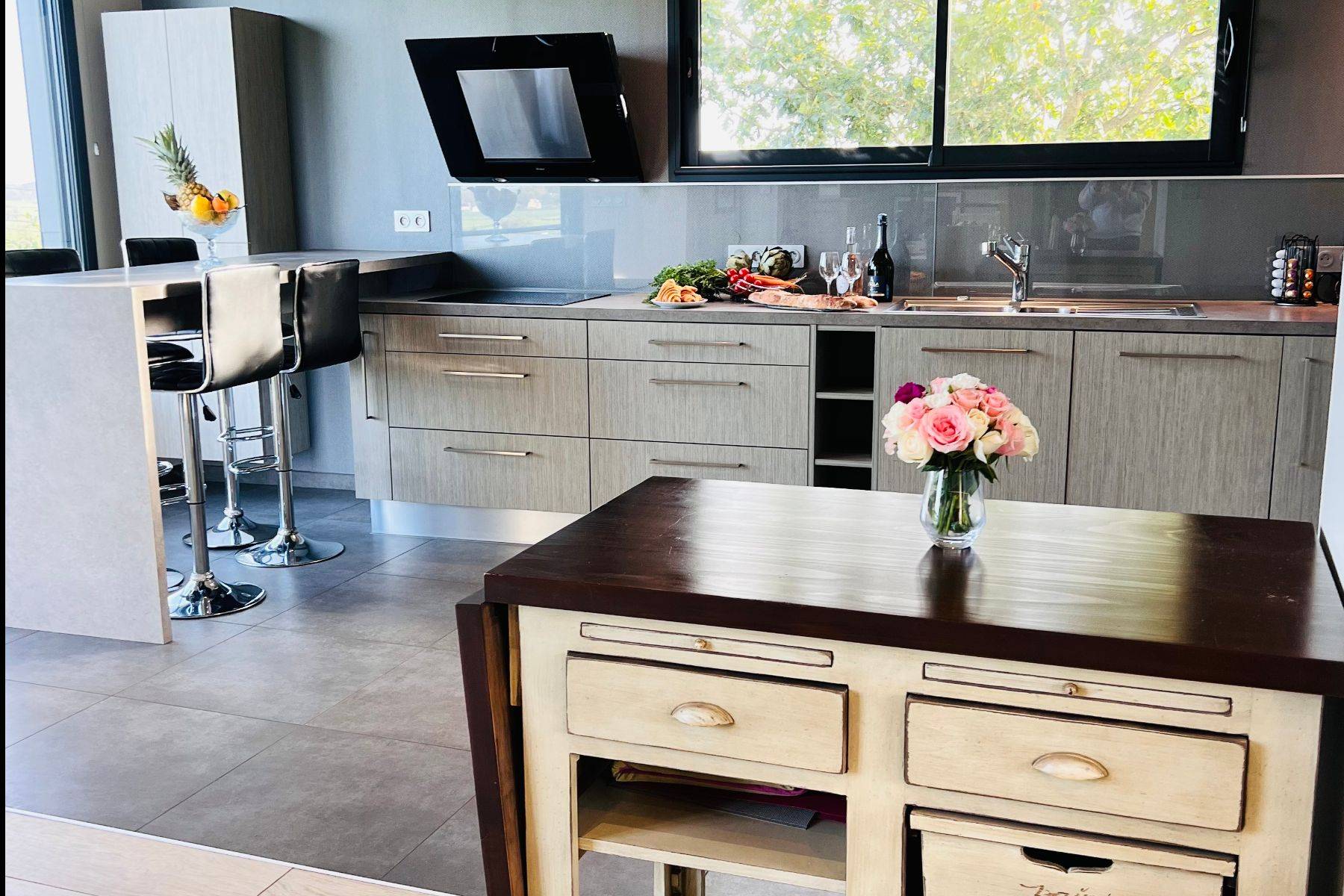 Und gleich in Richtung Garten (total eingezäunt) öffnet man die Großen Glasschiebetüren und ist auf der Süd Terrasse mit Sonnenliegen und Gartenmöbeln - der Weber Grill darf auch nicht fehlen. Neben dem Esstisch hat die Küche noch eine kleine Meerblick-Bar mit Zugang zu den Meerblickterrassen.