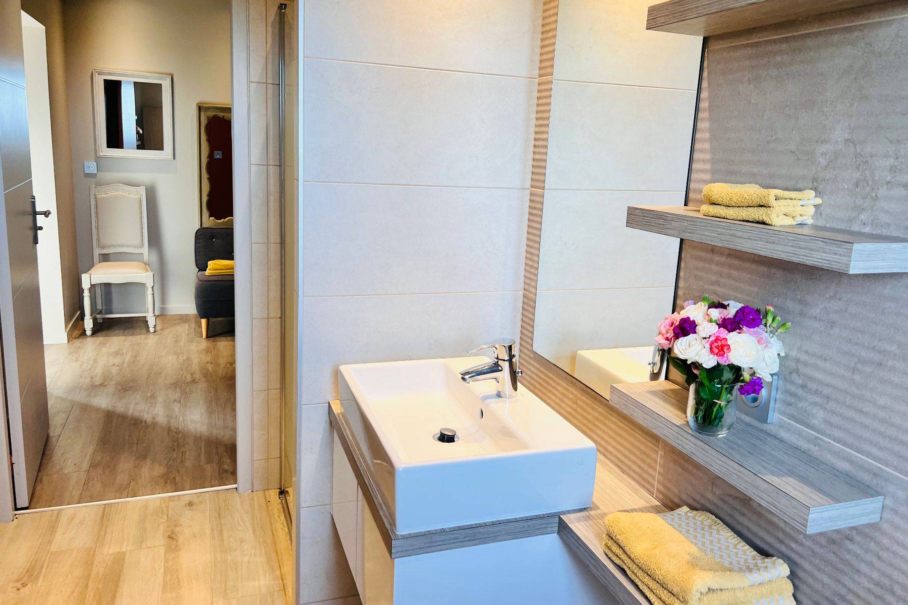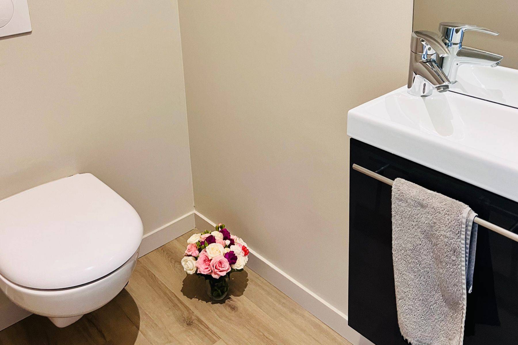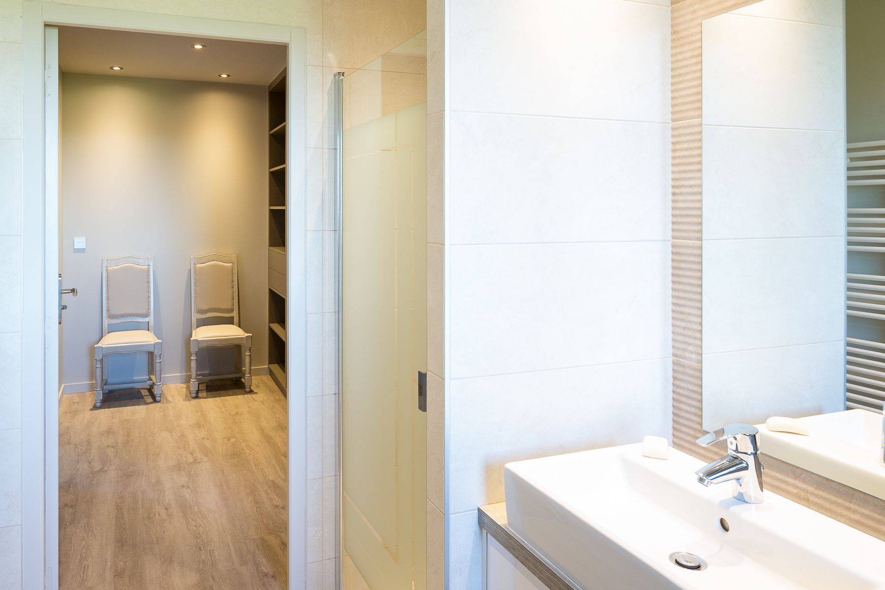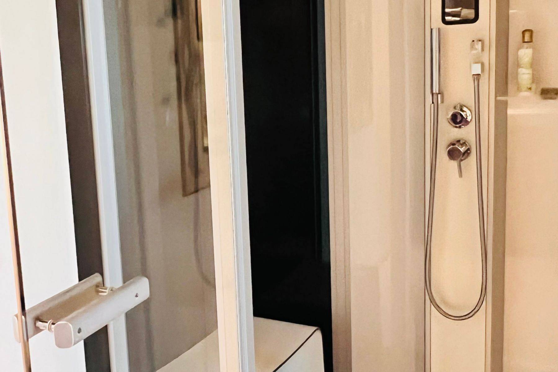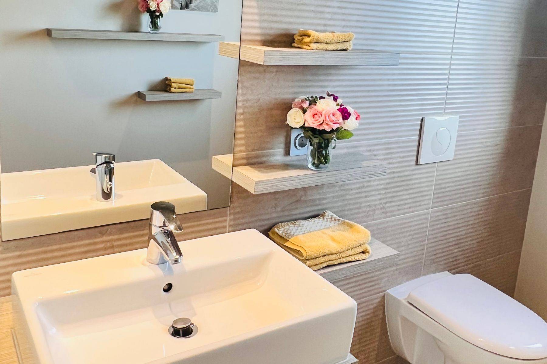 Auf dem ersten Stock wurden noch ein geräumiges behindertengerechtes Gäste WC untergebracht. Weiter mit dem Aufzug in die zweite Etage - auch hier wieder herrlicher Blick aufs Meer - eine kleine Sitzgruppe erlaubt z.B. das ruhige Lesen eines Buches ab vom Wohnbereich. Die Zwei Schlafzimmer im zweiten Stock sind ebenfalls geräumig mit TV Schrank und kleinem Büro-Bereich. Das WC ist hier separat und das Bad ebenfalls - hier gibt es sogar eine schöne Badewanne zum Relaxen - die Dusche ist dort integriert - eine Duschverglasung ist vorhanden.