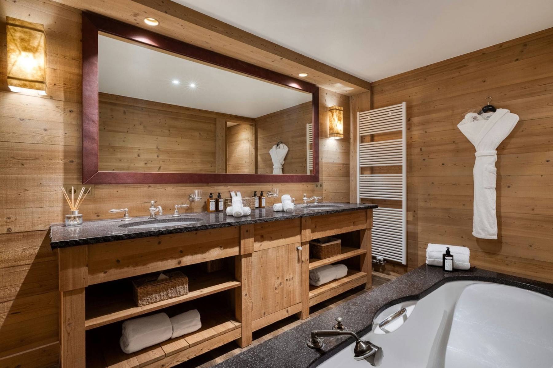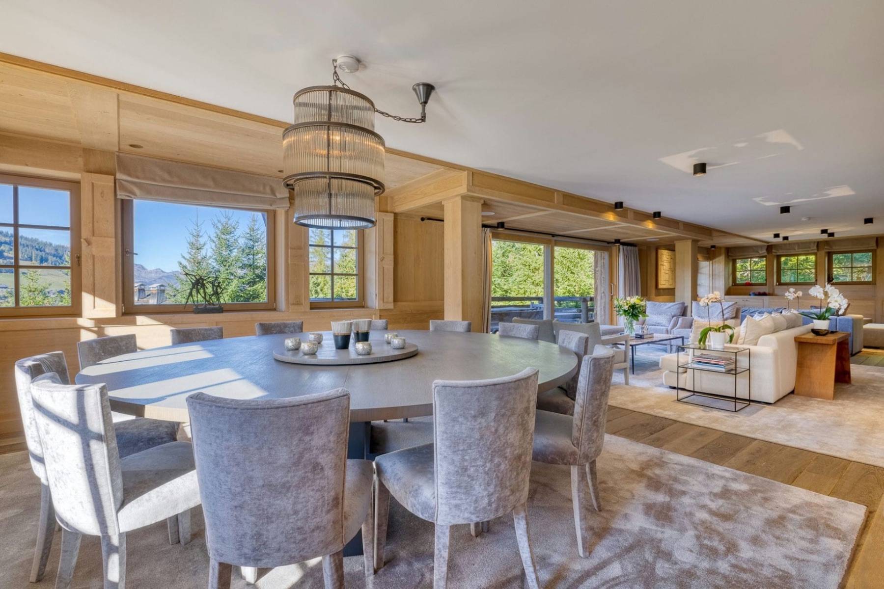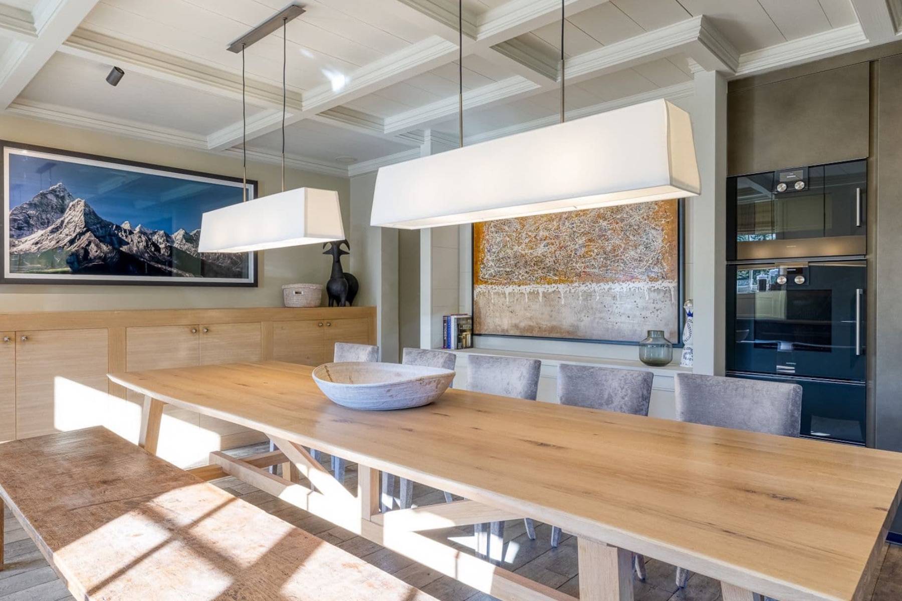 Edle Holzvertäfelungen, hochwertige Polstermöbel und ausgewählte Kunstwerke untermauern die Exklusivität dieses Chalets. Warme Erdtöne sorgen für ein gemütliches Ambiente zum Wohlfühlen, gleichwohl genügend Tageslicht die Räume durchflutet. Ein Blick auf die weiß bedeckte Berglandschaft sorgt für Urlaubsstimmung und lockt nach draußen.