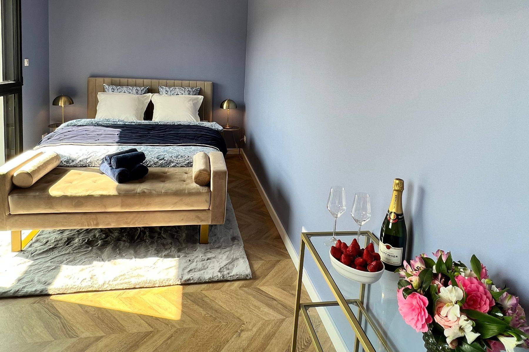 Bettwäsche Doppelbett Fenster Fußbodenheizung Rolladen Rolladen elektrisch Sessel Spiegel Vorhänge