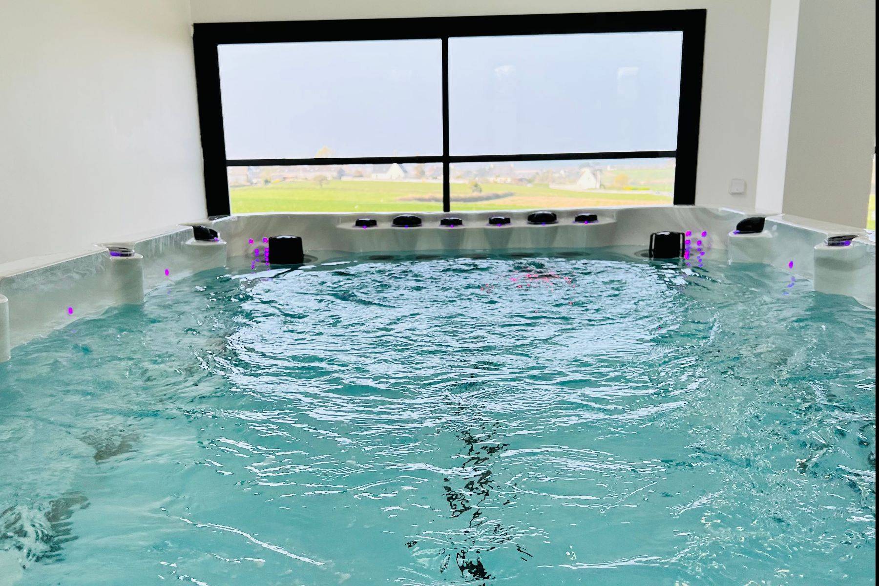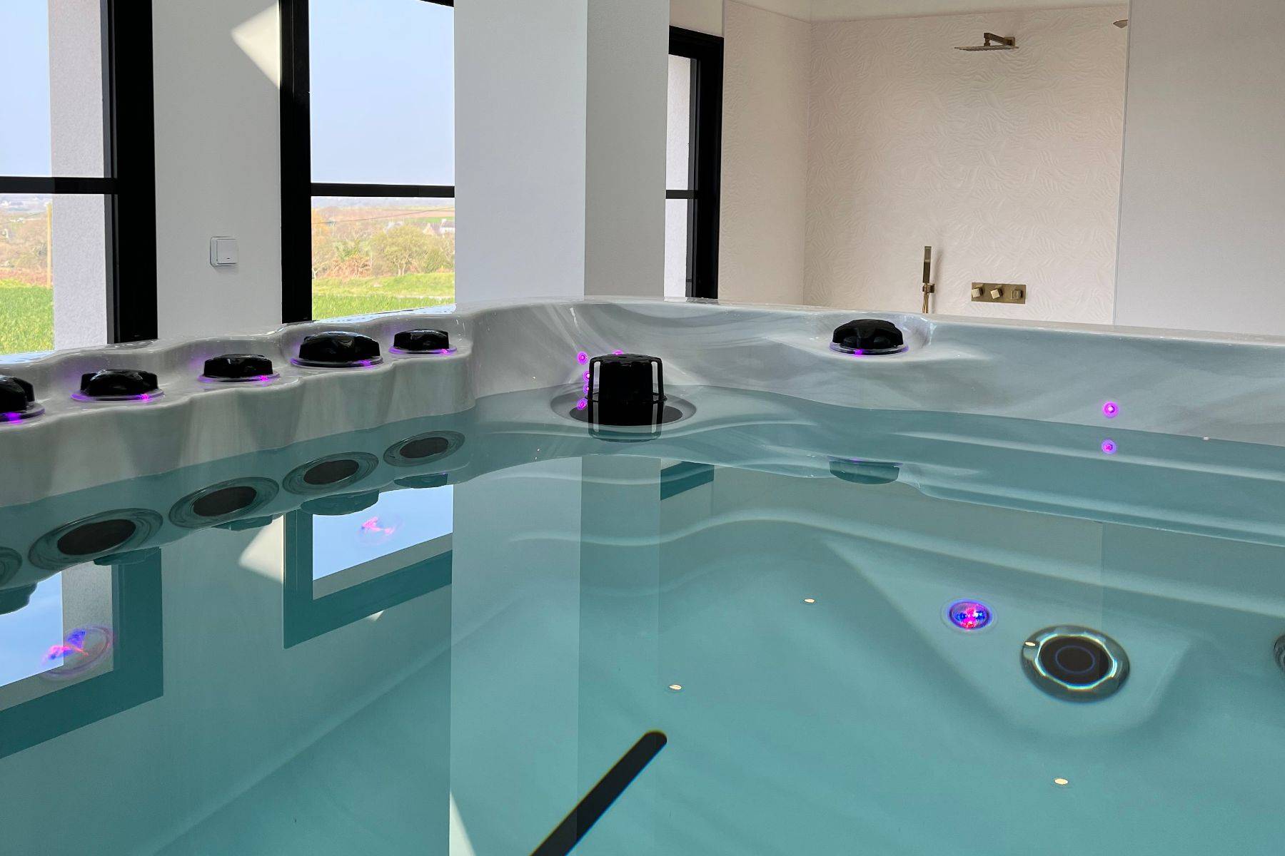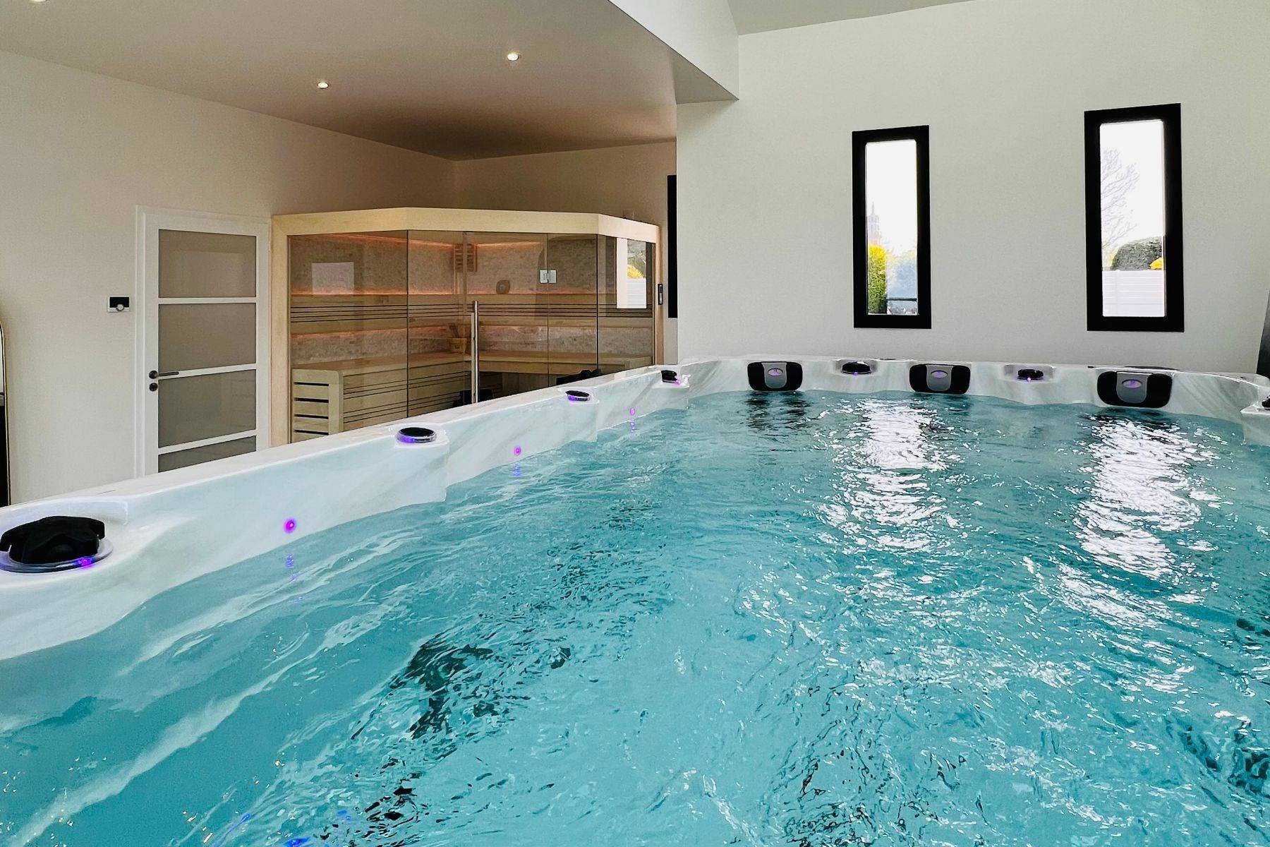 Das Urlaubsherzstück ist sicher der imposante Wellness Bereich mit großer Fensterfront und zusätzlichem Oberlicht- hier erholen Sie sich in der großen finnischen Sauna ( 5m² groß) oder dem Schwimm- Jacuzzi mit Gegenstromanlage für die Schwimmfans und Massagedüsen für die Wellnessliebhaber (…..12.000l Wasser auf 4m Länge). Gleich um die Ecke befindet sich Ihre 30 m² Sonnen-Terrasse und Natürlich gibt es dort eine moderne Gas-Plancha für Ihr leckeres Urlaubs-BBQ.
