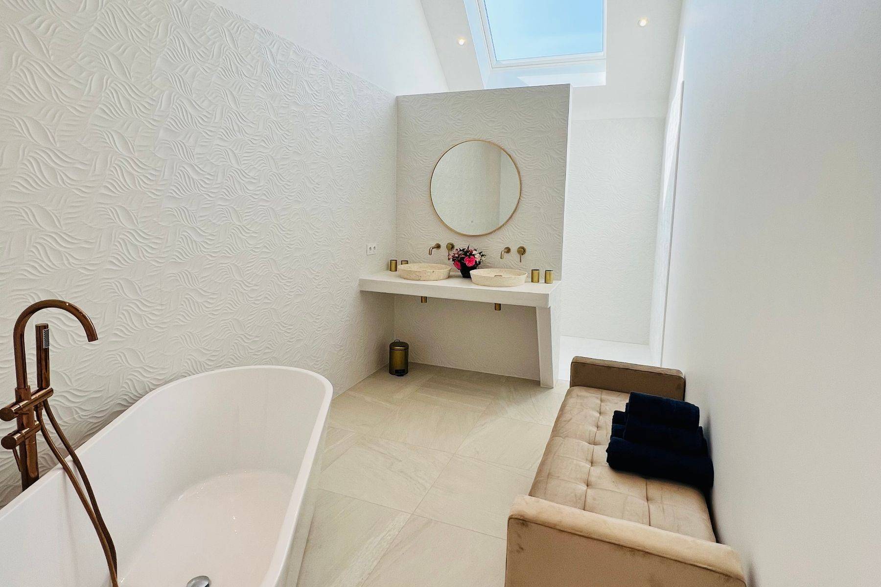 Badetuch Badewanne Badewanne freistehend Doppelwaschbecken Dusche Duschgel Fenster Fußbodenheizung Haartrockner Handtuch Heizung Seife Shampoo Spiegel Waschbecken