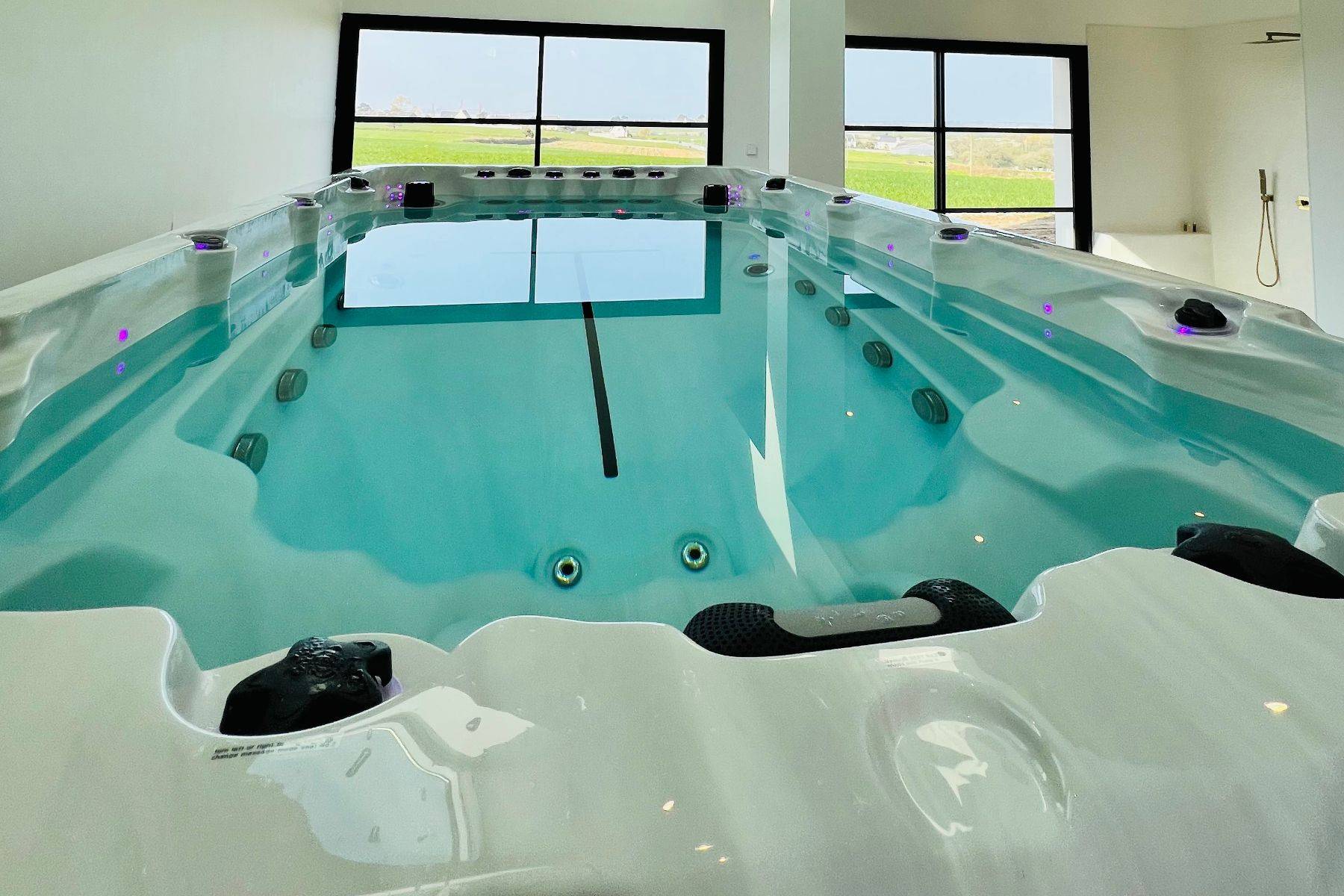 Urlaubsherzstück ist sicher der imposante Wellness Bereich mit großer Fensterfront und zusätzlichem Oberlicht- hier erholen Sie sich in der großen finnischen Sauna ( 5m² groß) oder dem Schwimm- Jacuzzi mit Gegenstromanlage für die Schwimmfans und Massagedüsen für die Wellnessliebhaber. Wir haben extra keinen Klassischen Swimming-Pool gewählt - sondern das große Jacuzzi Sport - und Wellnessgerät (12.000l Wasser auf 4m Länge). Gleich um die Ecke befindet sich Ihre 30 m² Sonnen-Terrasse mit spezieller Außen-Dusche "von unten"; nicht nur für die Saunagänger. Natürlich gibt es dort eine moderne Gas-Plancha für Ihr leckeres Urlaubs-BBQ.