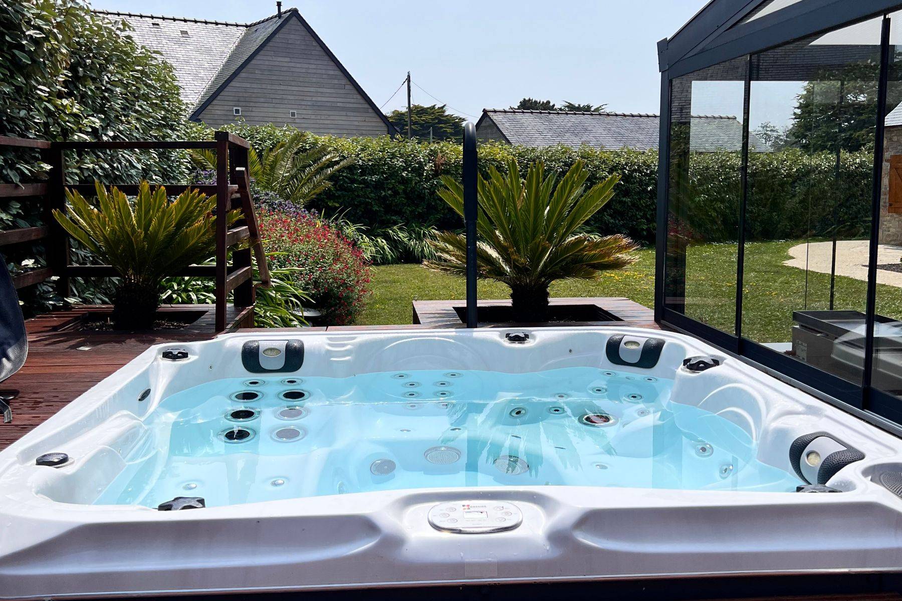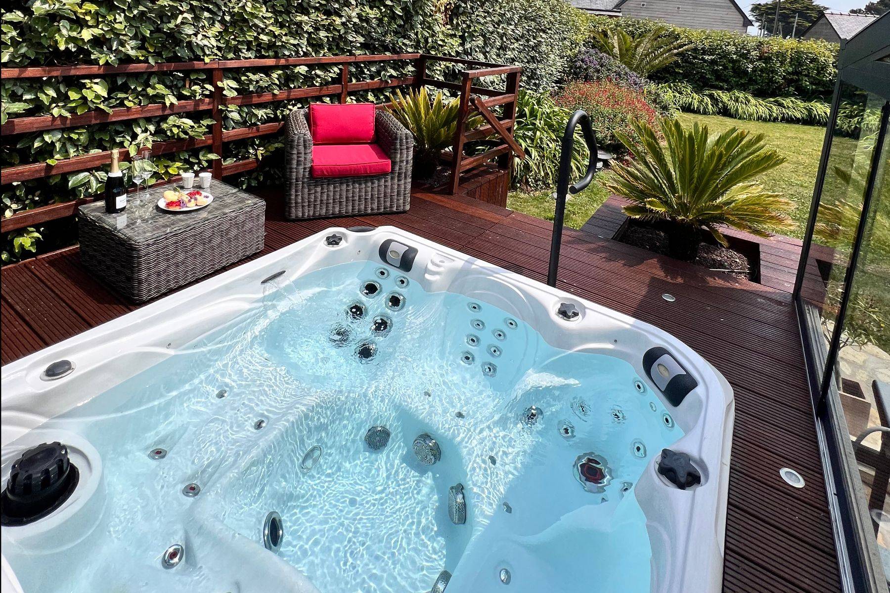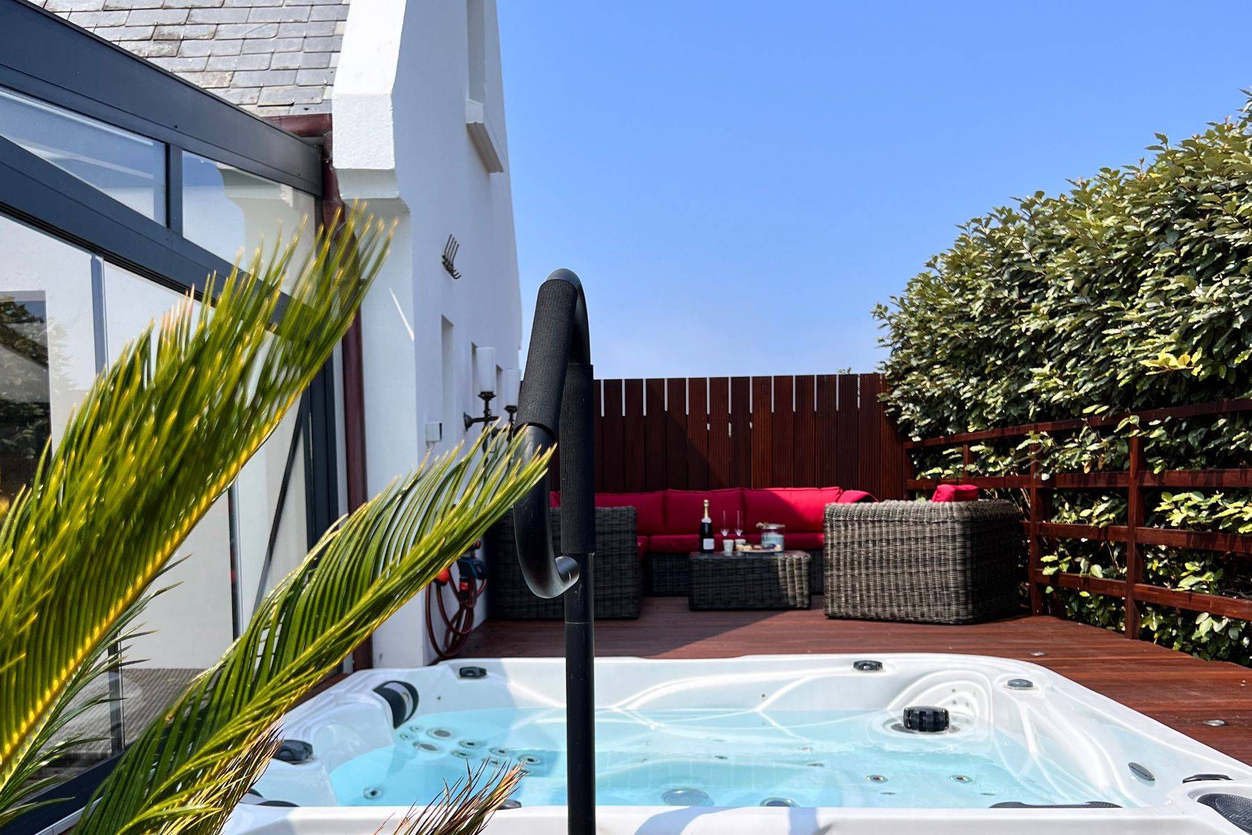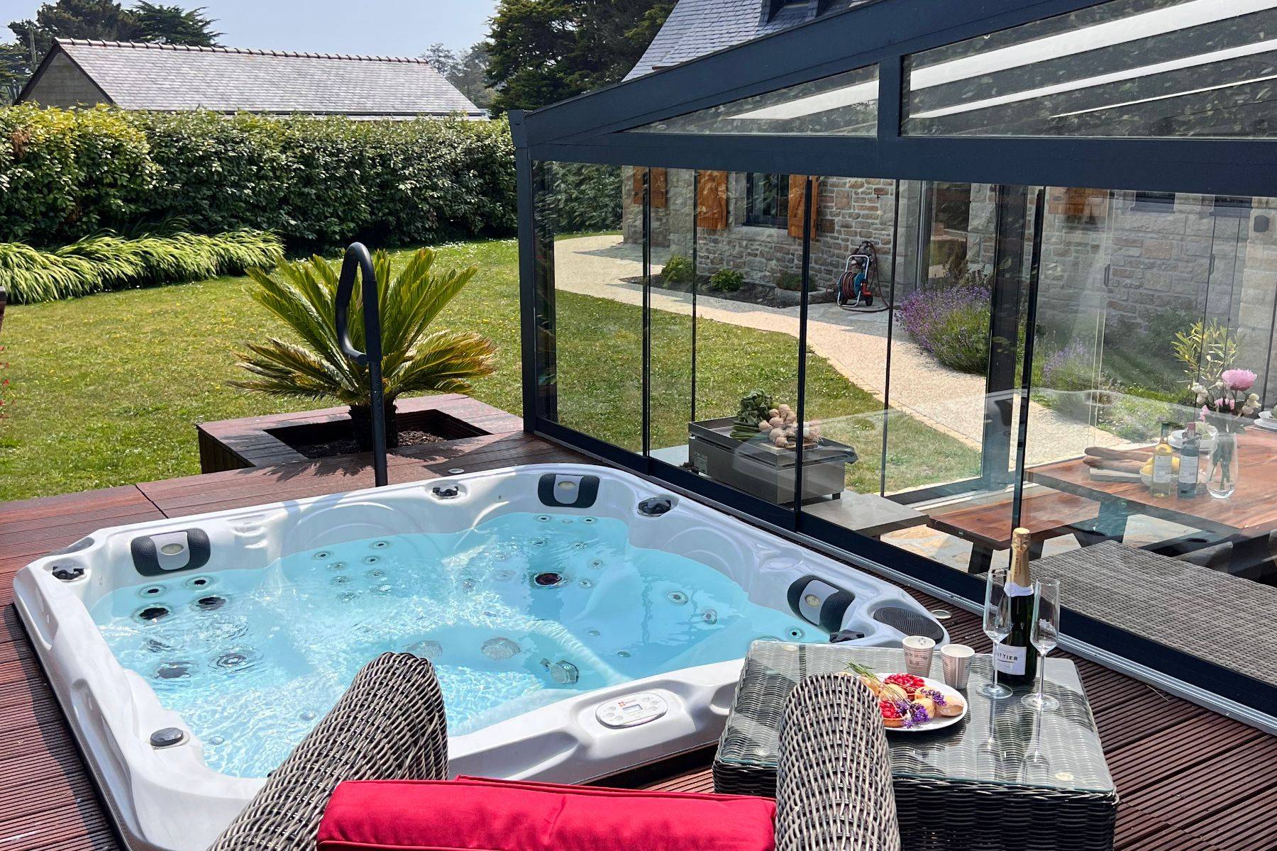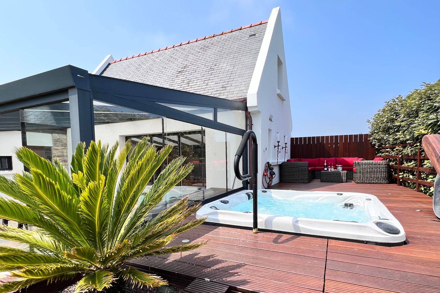 Die Villa Ty Arvorig ist wirklich einzigartig an Ausstattung und Komfort, sie hat wirklich mehr als nur einen Hauch Luxus und wurde mit fünf Sternen von französischen Tourismus Verband klassifiziert - eine sehr seltene Auszeichnung auf die man sehr stolz sein kann. Eigentlich geht einem gleich das Herz auf, wenn man das schöne Ferienhaus betritt, geschmackvoll, gemütlich, und de luxe - diese Villa ist unser Cocooning Herzstück, unseres ganzen Ferienhaus-Portfolios - großzügig fast 200m² für nur 6 Personen. Tolle sehr wertige Ausstattung, mit allem was man sich nur wünschen kann, eigene Bar, ein total verglaster Wintergarten direkt vor ihrem eigenen Wellness-Bereich mit großer Sauna, Kneipp-Becken, eigene SPA- Dusche und WC und natürlich davor ein riesiger Jacuzzi.