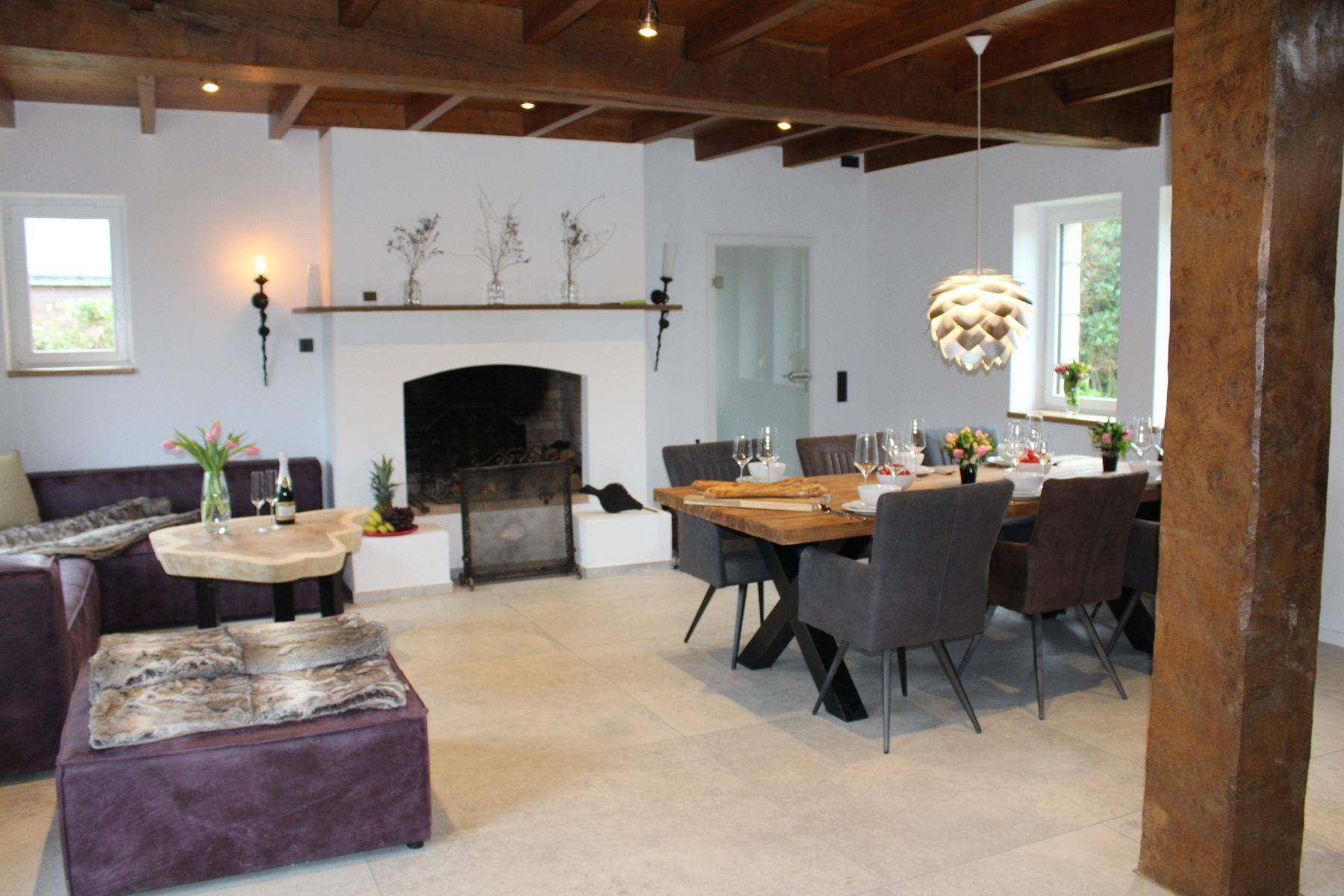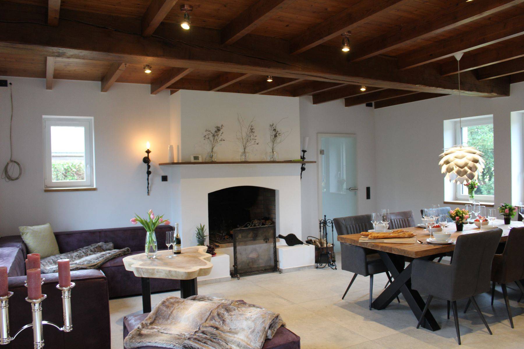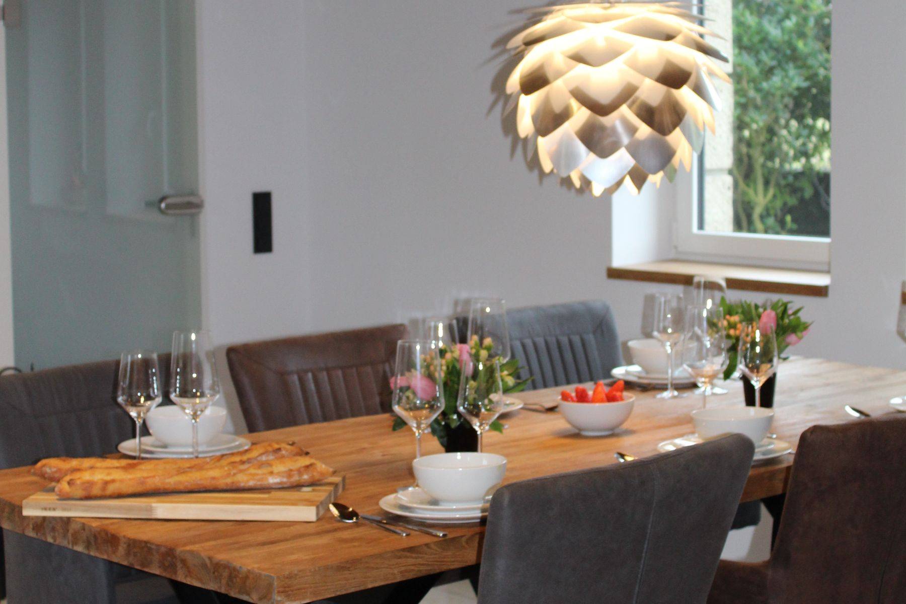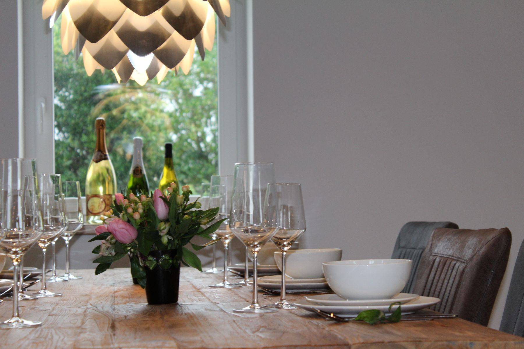 Hunde sind hier sehr gerne willkommen (max. zwei Hunde bitte.!! und ausschließlich gegen Voranmeldung) der Garten ist eingezäunt und bietet üppigen Platz, der große Parkplatz (gut 3 Pkw möglich) ist durch ein elektrisches Tor verschlossen. Gleich neben der überdachten Steinterrasse gelangt man in die große Küche mit Oberlicht - die Küchen-Ausstattung ist einzigartig komplett, und Ihr Herd samt Ofen-Bereich annähernd professionell, der Amerikanische Kühlschrank selbstverständlich. Ein Gang mit eigener Bar (Weinkühlschrank, zusätzlicher Getränkekühlschrank, antike manuelle Aufschnitt-Maschine und vieles mehr!!) An der Bar vorbei wird man in den hellen offenen Wohnbereich mit klassisch offenem Kamin und großzügigem und massivem Kloster- Esstisch geführt; und eine Sofalandschaft zum Relaxen gleich daneben.