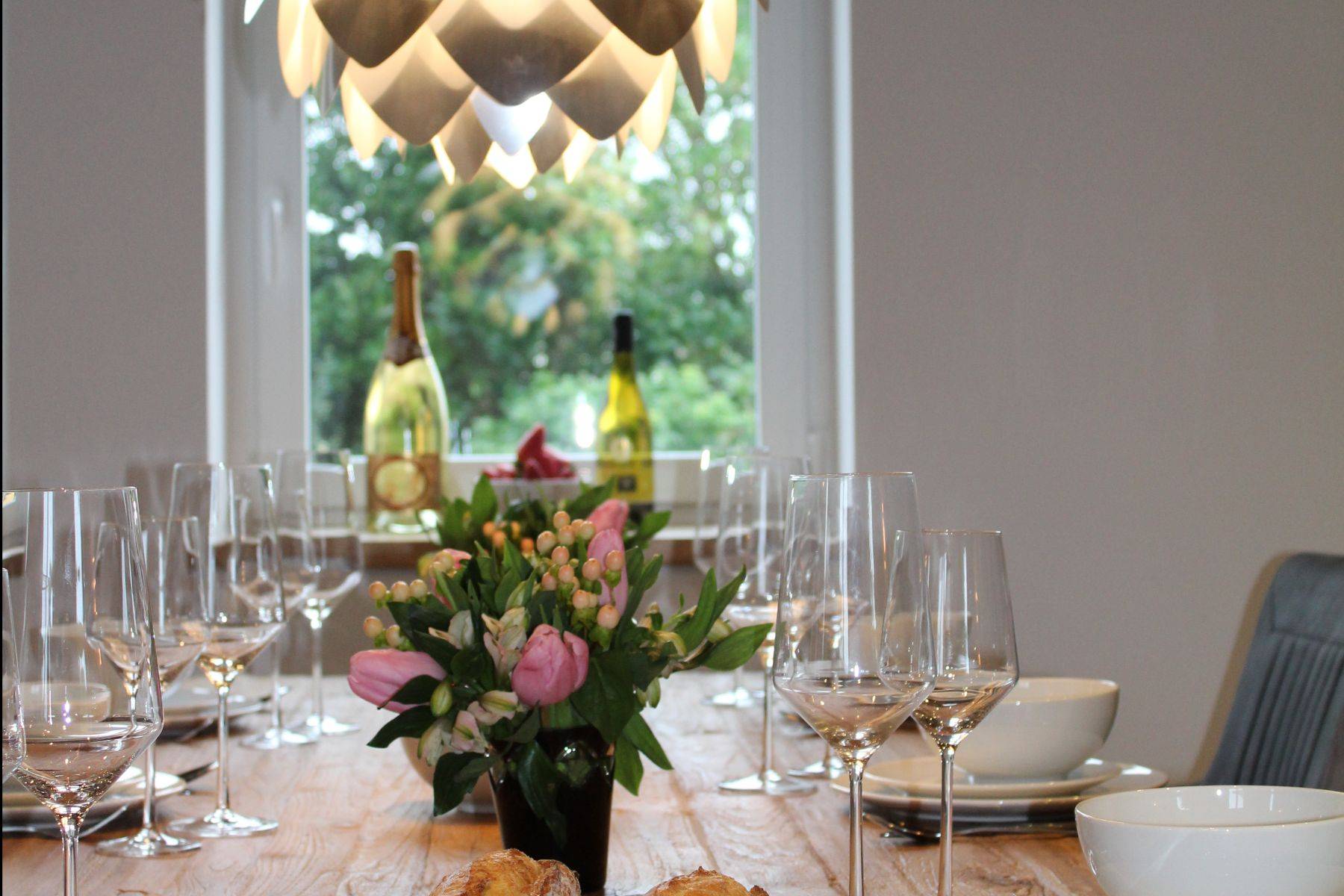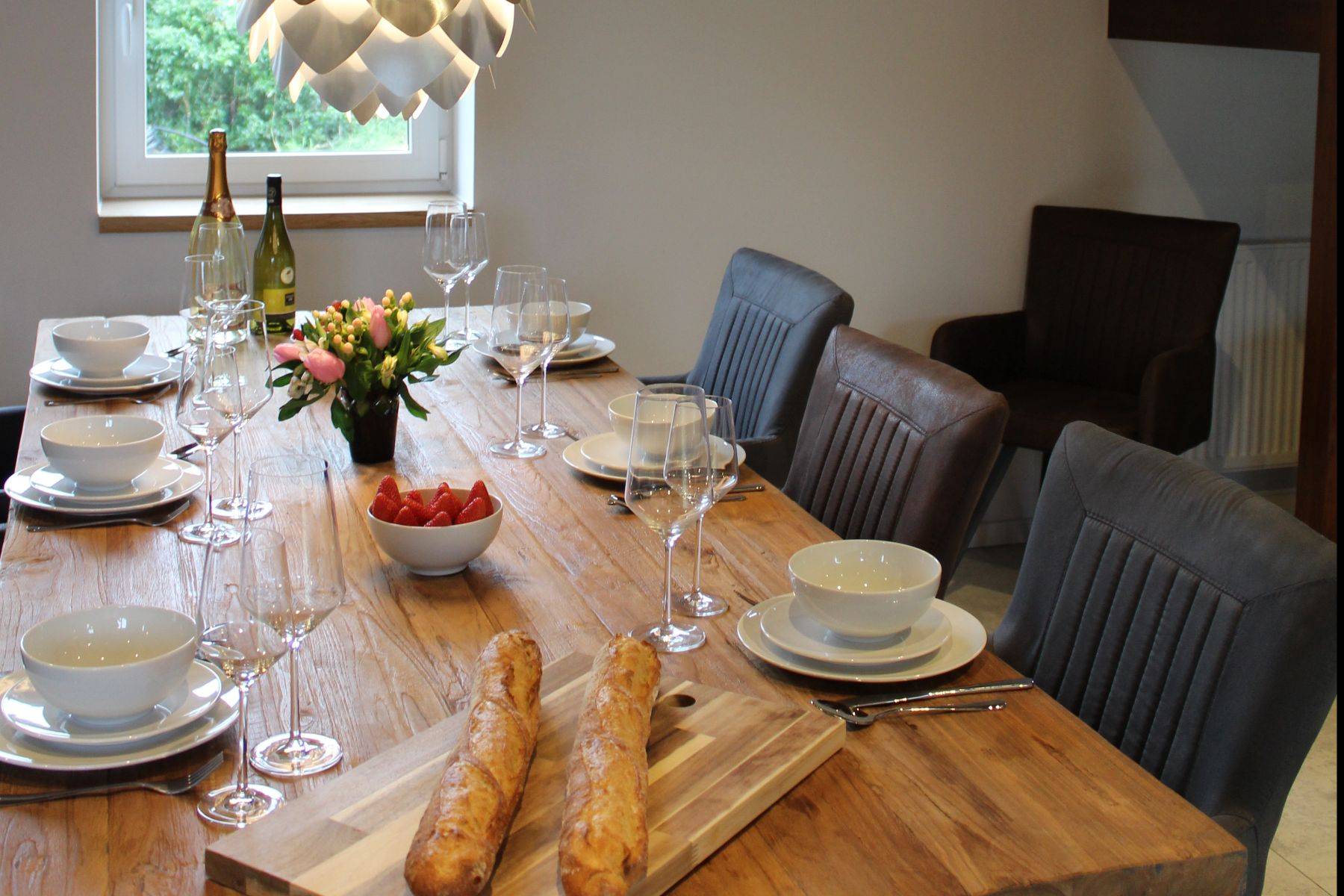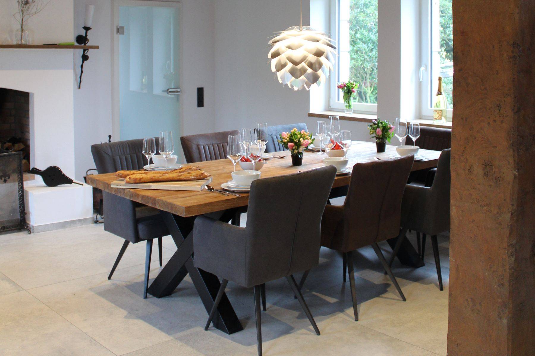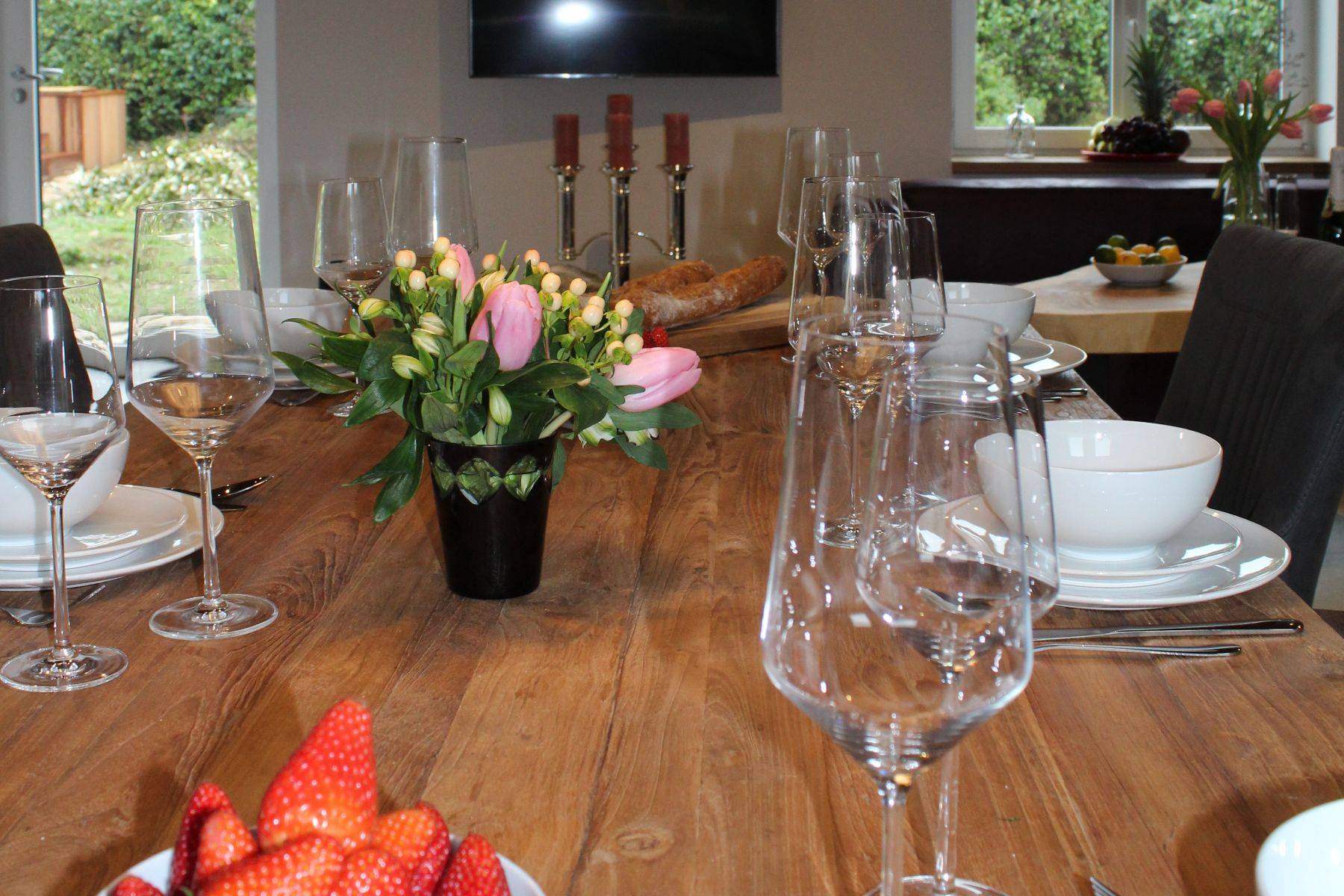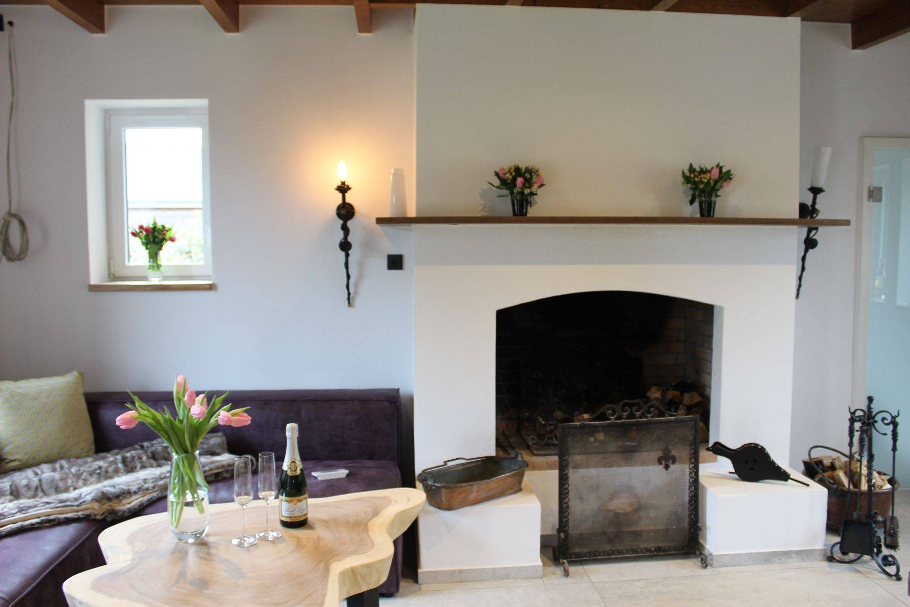 Hunde sind hier sehr gerne willkommen (max. zwei Hunde bitte.!! und ausschließlich gegen Voranmeldung) der Garten ist eingezäunt und bietet üppigen Platz, der große Parkplatz (gut 3 Pkw möglich) ist durch ein elektrisches Tor verschlossen. Gleich neben der überdachten Steinterrasse gelangt man in die große Küche mit Oberlicht - die Küchen-Ausstattung ist einzigartig komplett, und Ihr Herd samt Ofen-Bereich annähernd professionell, der Amerikanische Kühlschrank selbstverständlich. Ein Gang mit eigener Bar (Weinkühlschrank, zusätzlicher Getränkekühlschrank, antike manuelle Aufschnitt-Maschine und vieles mehr!!) An der Bar vorbei wird man in den hellen offenen Wohnbereich mit klassisch offenem Kamin und großzügigem und massivem Kloster- Esstisch geführt; und eine Sofalandschaft zum Relaxen gleich daneben.