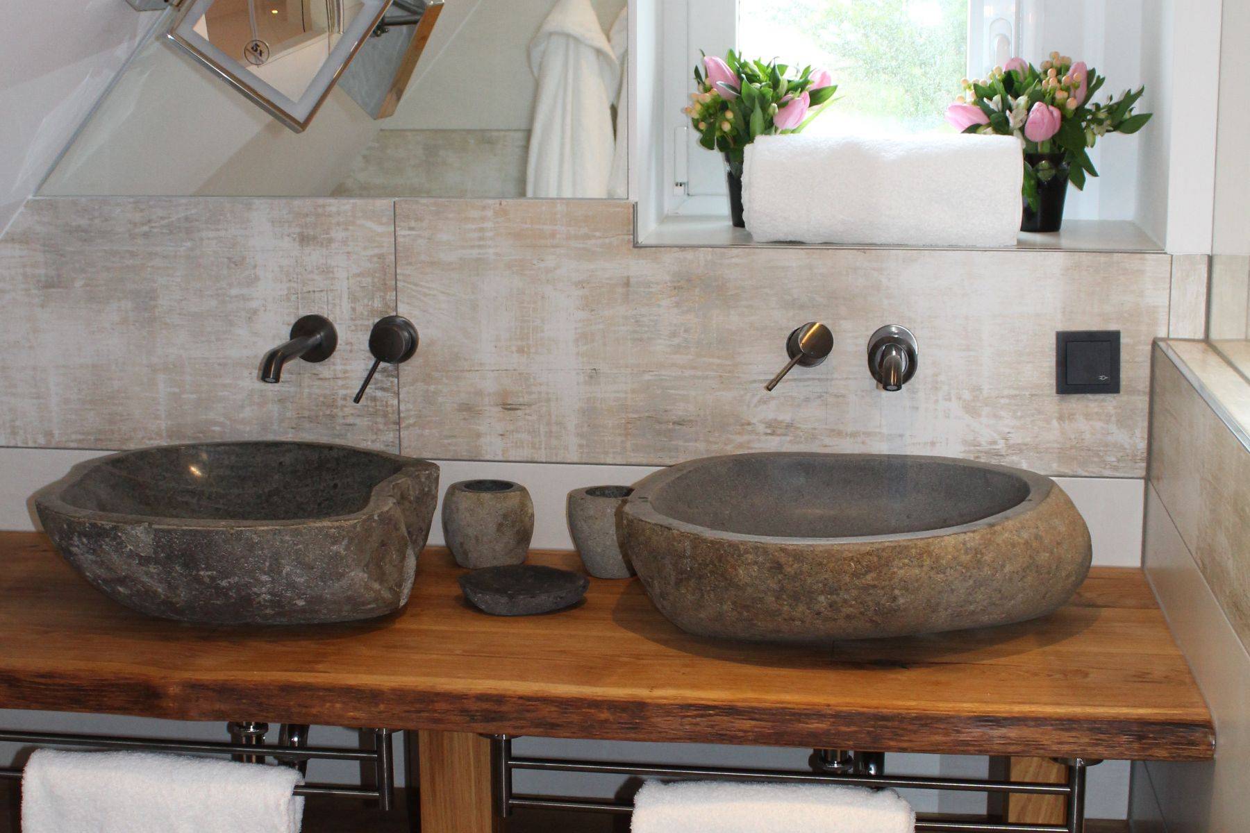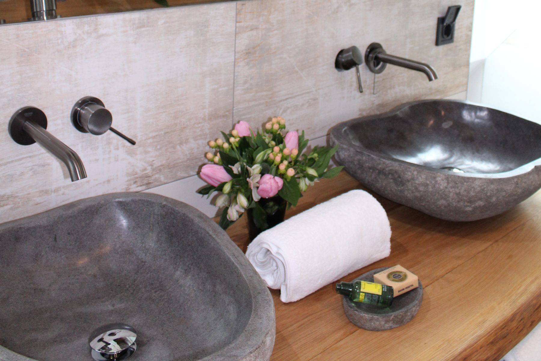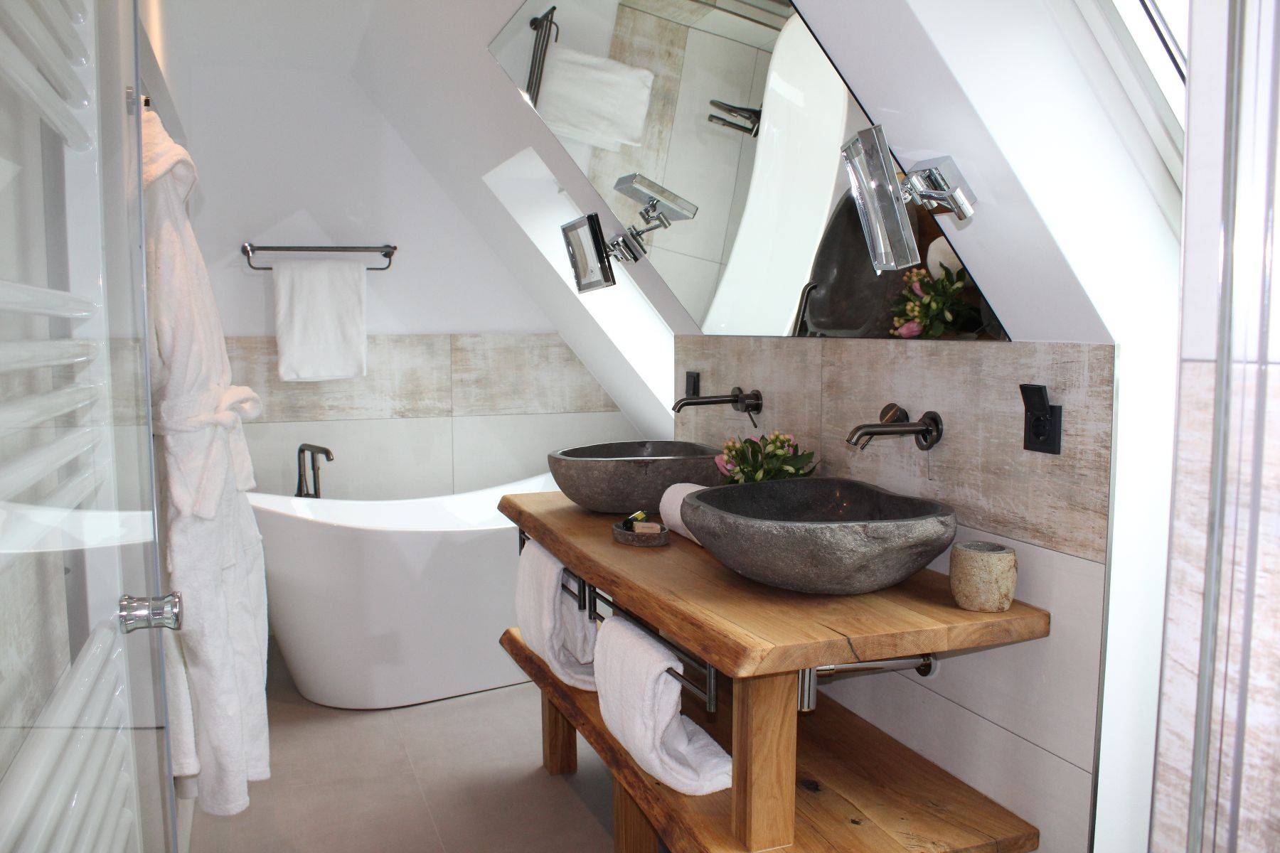 Bademantel Badewanne Doppelwaschbecken Dusche Duschgel Fenster Haartrockner Handtuch Handtuchheizkörper Heizung Klimaanlage Kosmetikspiegel Seife Shampoo Spiegel Waschbecken WC