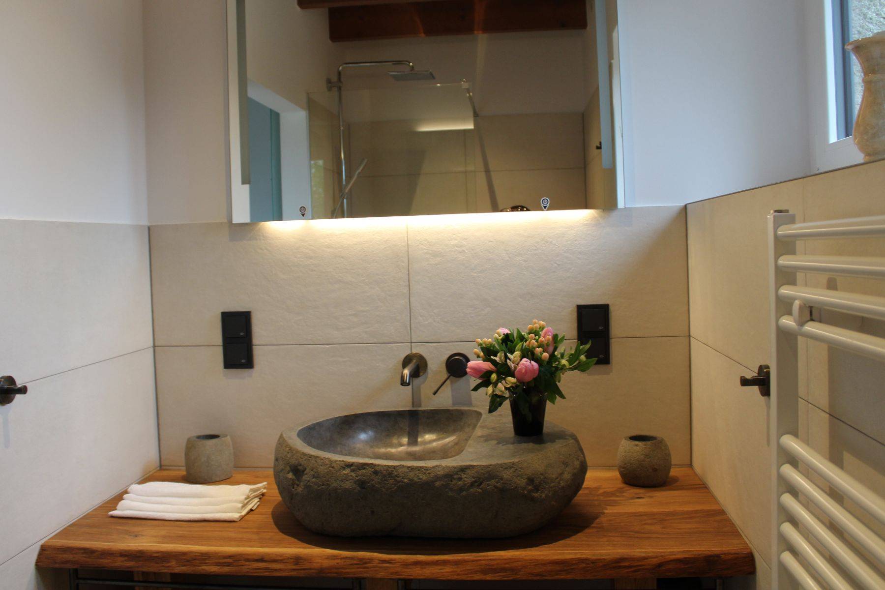 Bademantel Dusche Duschvorlage Fenster Haartrockner Handtuch Handtuchheizkörper Heizung Seife Shampoo Spiegel Waschbecken Wellnessslipper