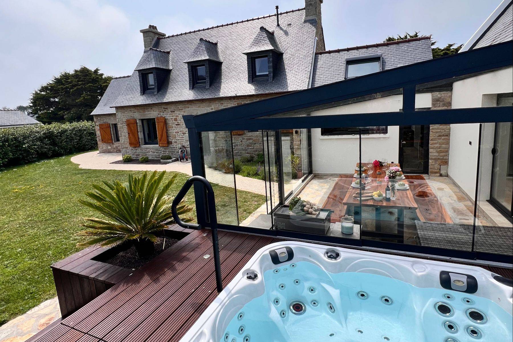 Ein gemütliches de luxe Haus direkt am Meer, in dem der Gast sich sofort zu Hause fühlt. Das war die Intention als Ty Arvoirig 2020 und 2021 umgebaut wurde. Dem hübschen bretonischen Granit-Steinhaus, in 30 m Entfernung zum Meer, gleich an der Bucht von Ber ar Scaf, hat der Umbau zu einen tollen Meerblick verholfen, Sie liegen auf den Sonnenliegen im OG des Spa Bereichs und genießen den herrlichen Meerblick. Der Spa Bereich ist großzügig, verfügt über eine 5m² Klafs-Sauna, Kneipp-Wechselbecken, italienisch ebenerdige Dusche...und einem riesigen 5 Personen Jacuzzi (der außen vor dem Spa-Bereich in eine weitere Holzterrasse integriert wurde).