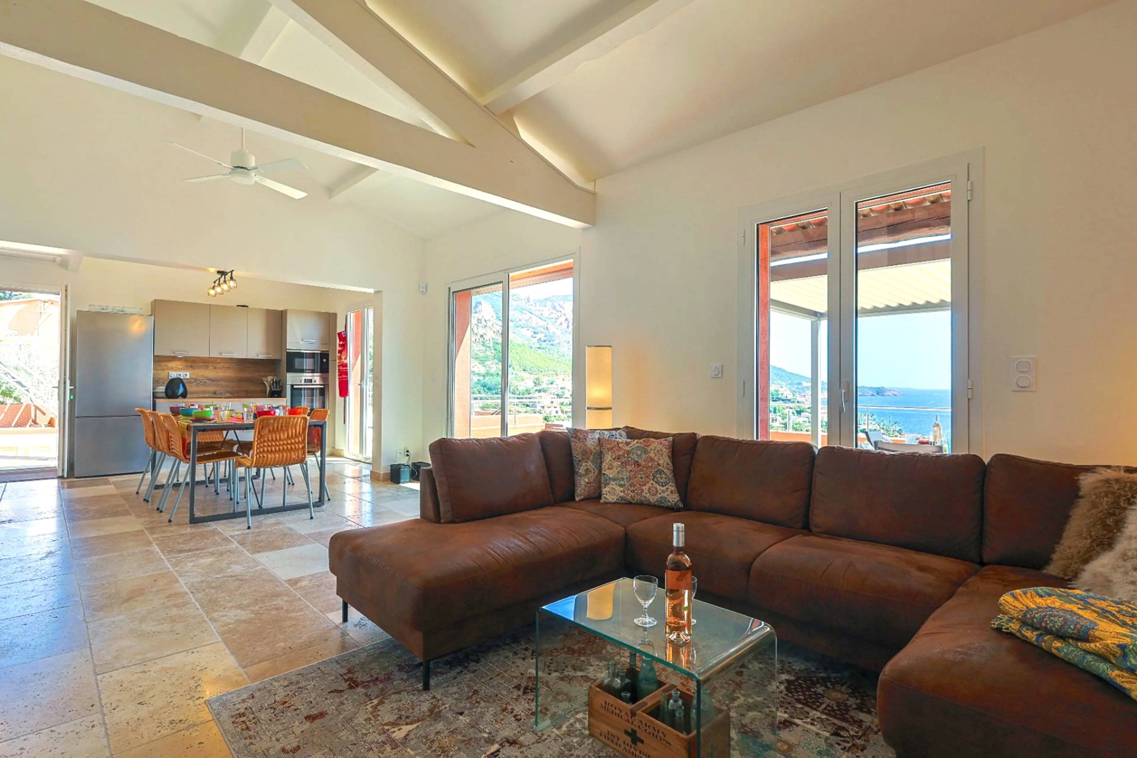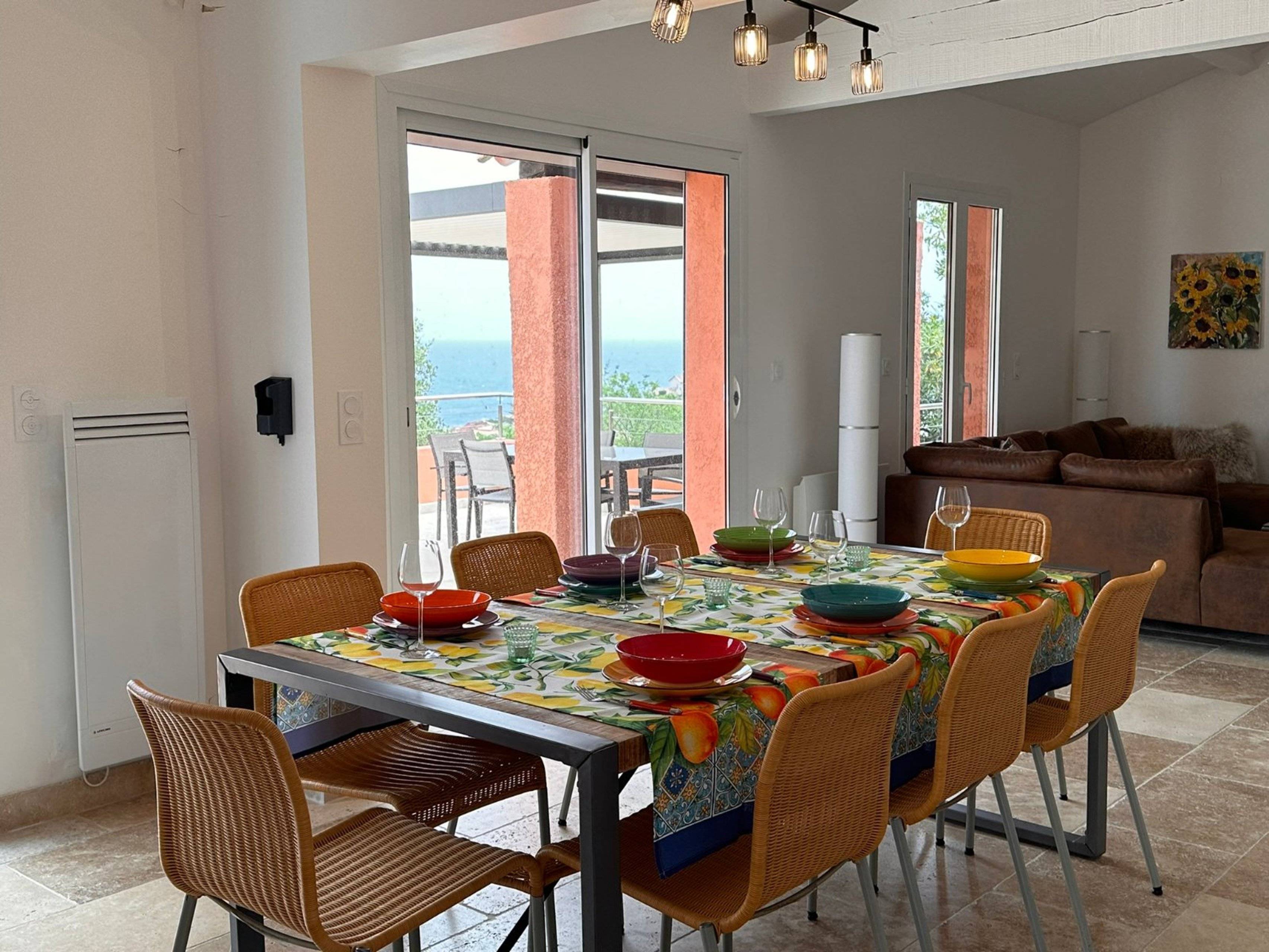 Auf der untersten Etage befindet sich der große Wohn-/Essbereich mit der offenen Küche und dem Zugang zur möblierten Terrasse und Blick über das Mittelmeer, der an manchen Tagen sogar bis nach Korsika reicht. Auf der Terrassenebene befindet sich auch der große Schwimm-Spa mit Gegenstromanlage und der zum Entspannen einladende Jacuzzi/Whirlpool, der zu alleinigen Verfügung steht.