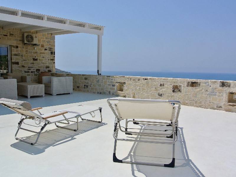 4 große Terrassen mit Sonnenliegen, ausreichend Schattenplätzen und Blick auf das Meer und das Idagebirge.