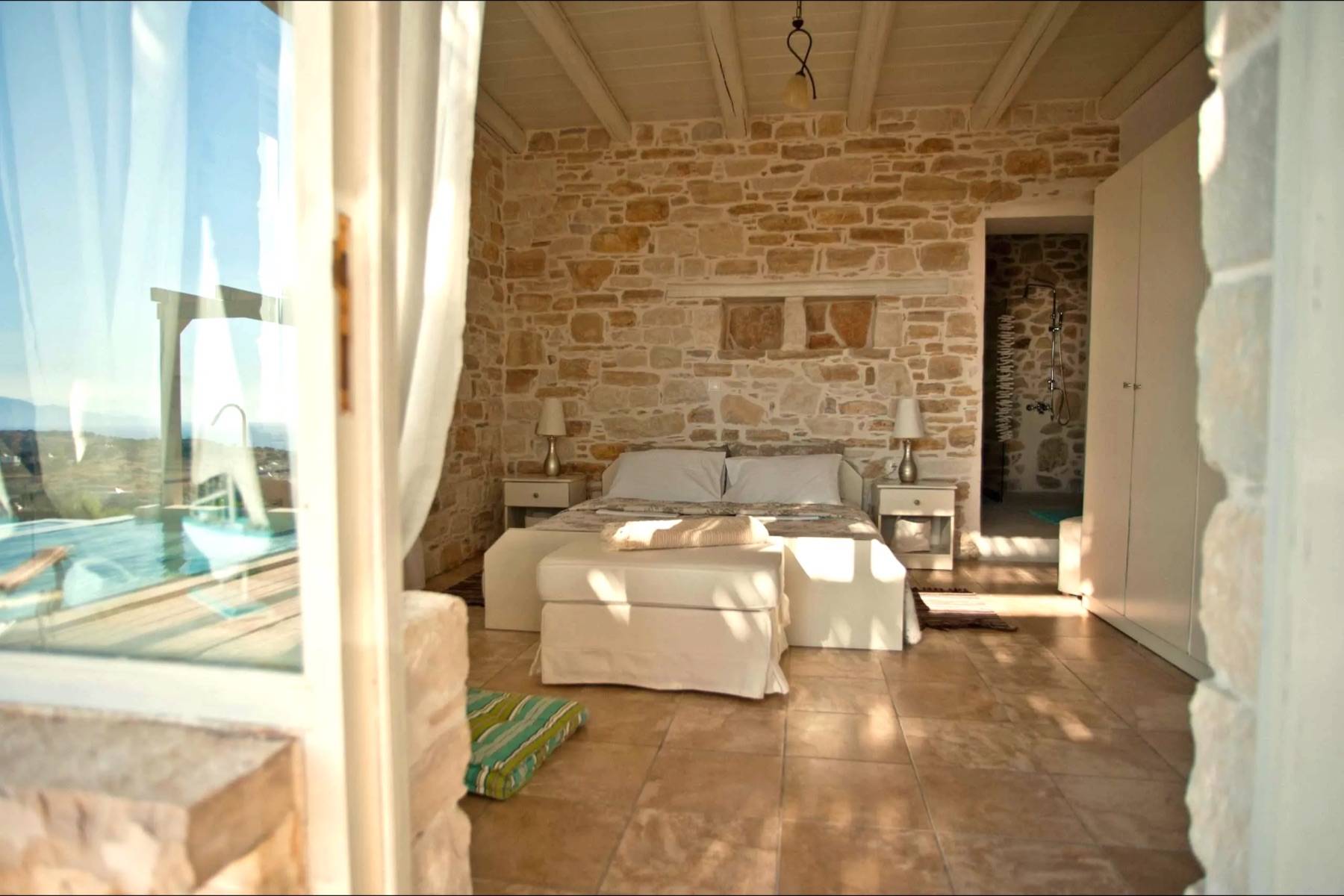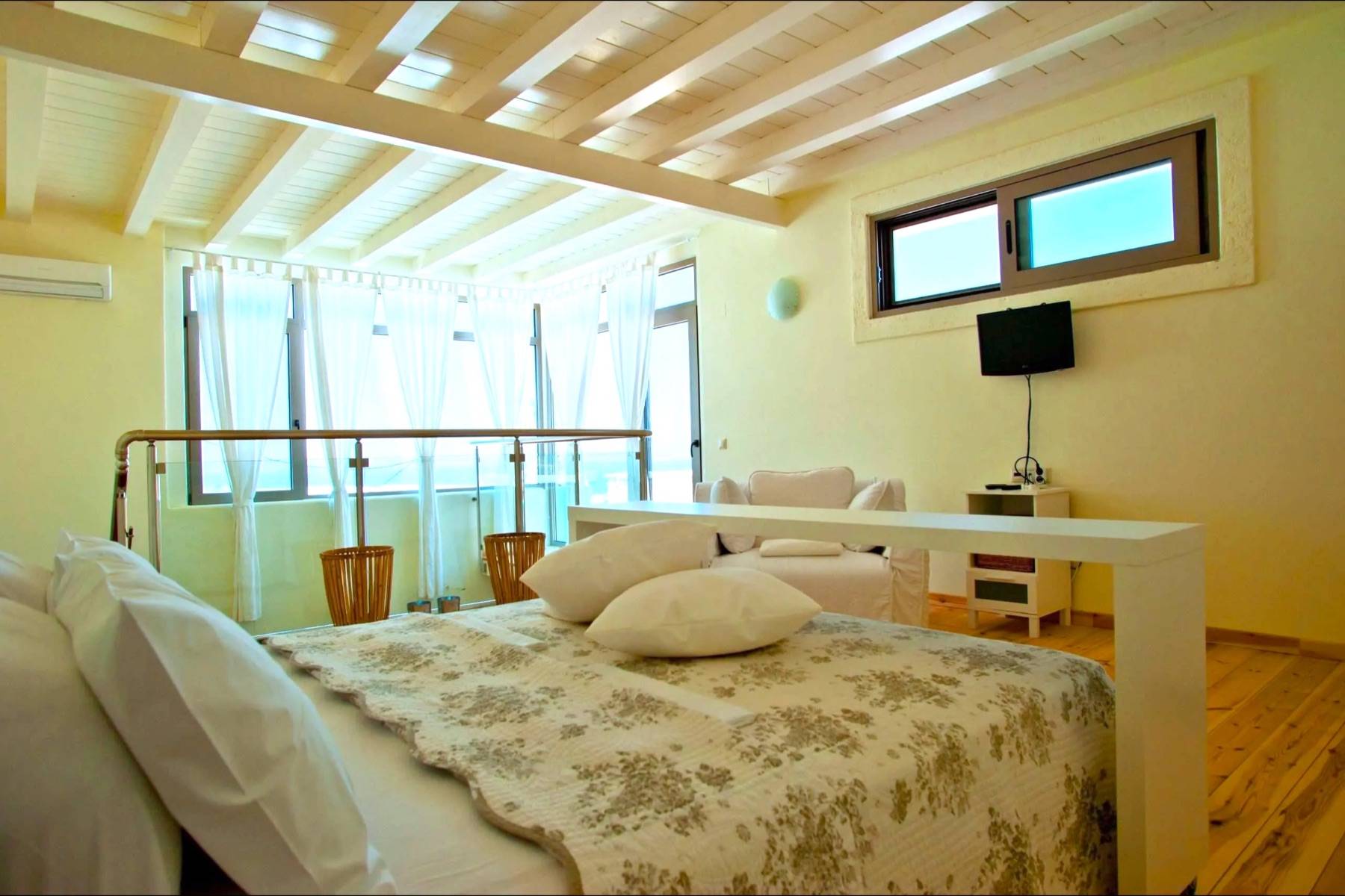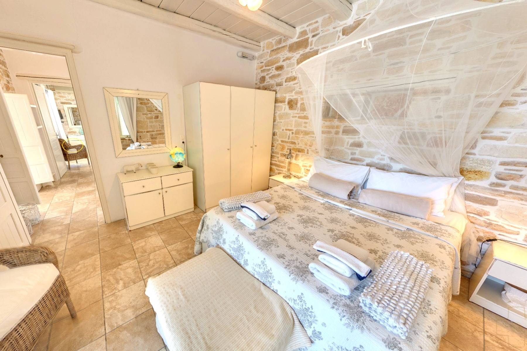 Die vier unikaten Schlafzimmer, jedes mit separaten Eingang, geben einen ungehinderten sowie faszinierenden Blick auf das glitzernde nahe Meer frei. Drei Ensuite-Dusch-Bäder, zwei mit Bidet, sowie ein Bad mit Badewanne, Waschmaschine, Wäschetrockner, Bügeleisen - Brett, geben dem Haus zusätzlich eine spezielle Note.