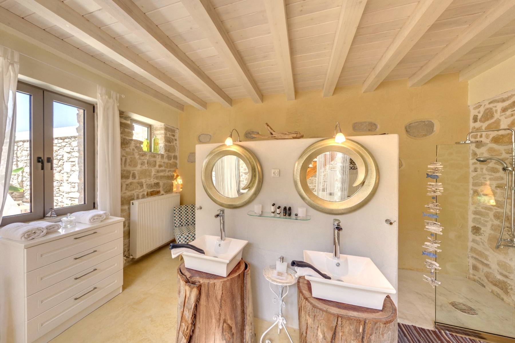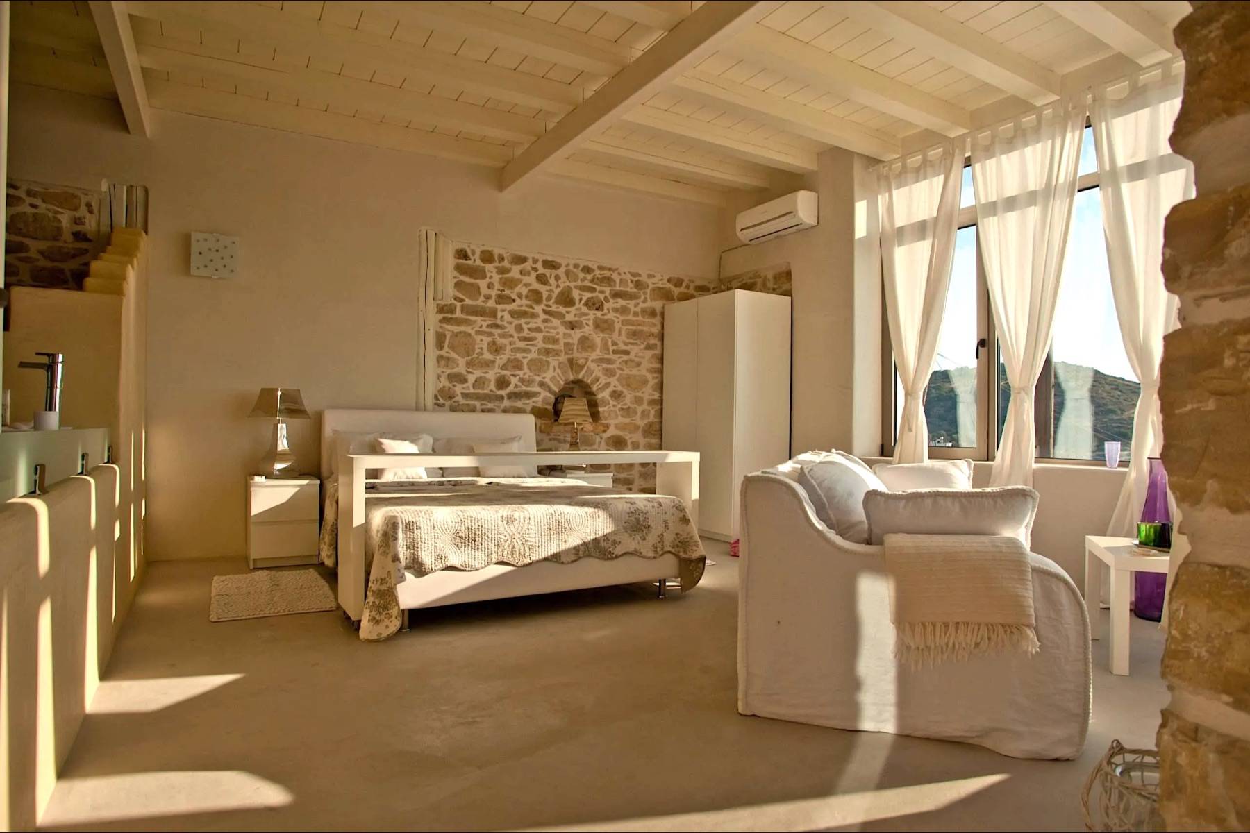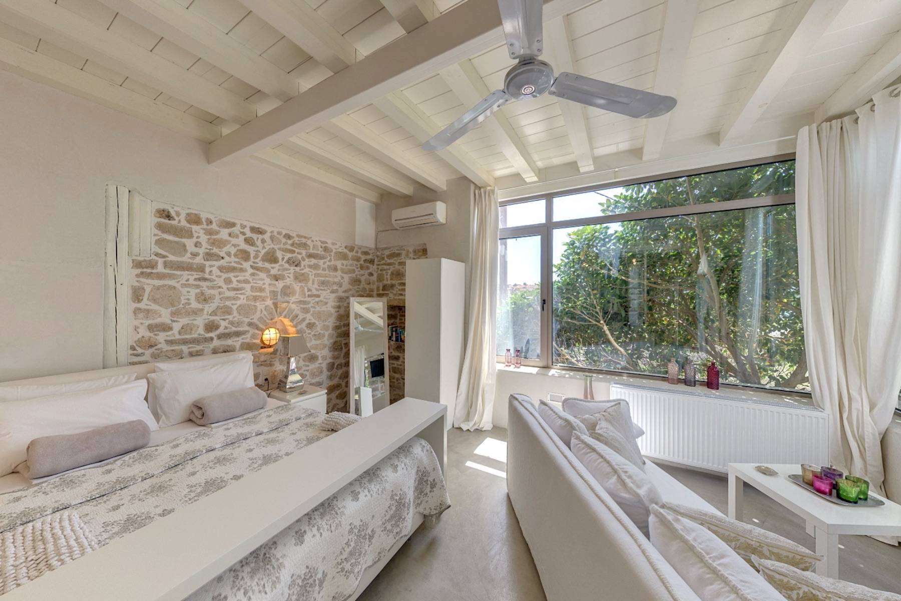Die vier unikaten Schlafzimmer, jedes mit separaten Eingang, geben einen ungehinderten sowie faszinierenden Blick auf das glitzernde nahe Meer frei. Drei Ensuite-Dusch-Bäder, zwei mit Bidet, sowie ein Bad mit Badewanne, Waschmaschine, Wäschetrockner, Bügeleisen - Brett, geben dem Haus zusätzlich eine spezielle Note.