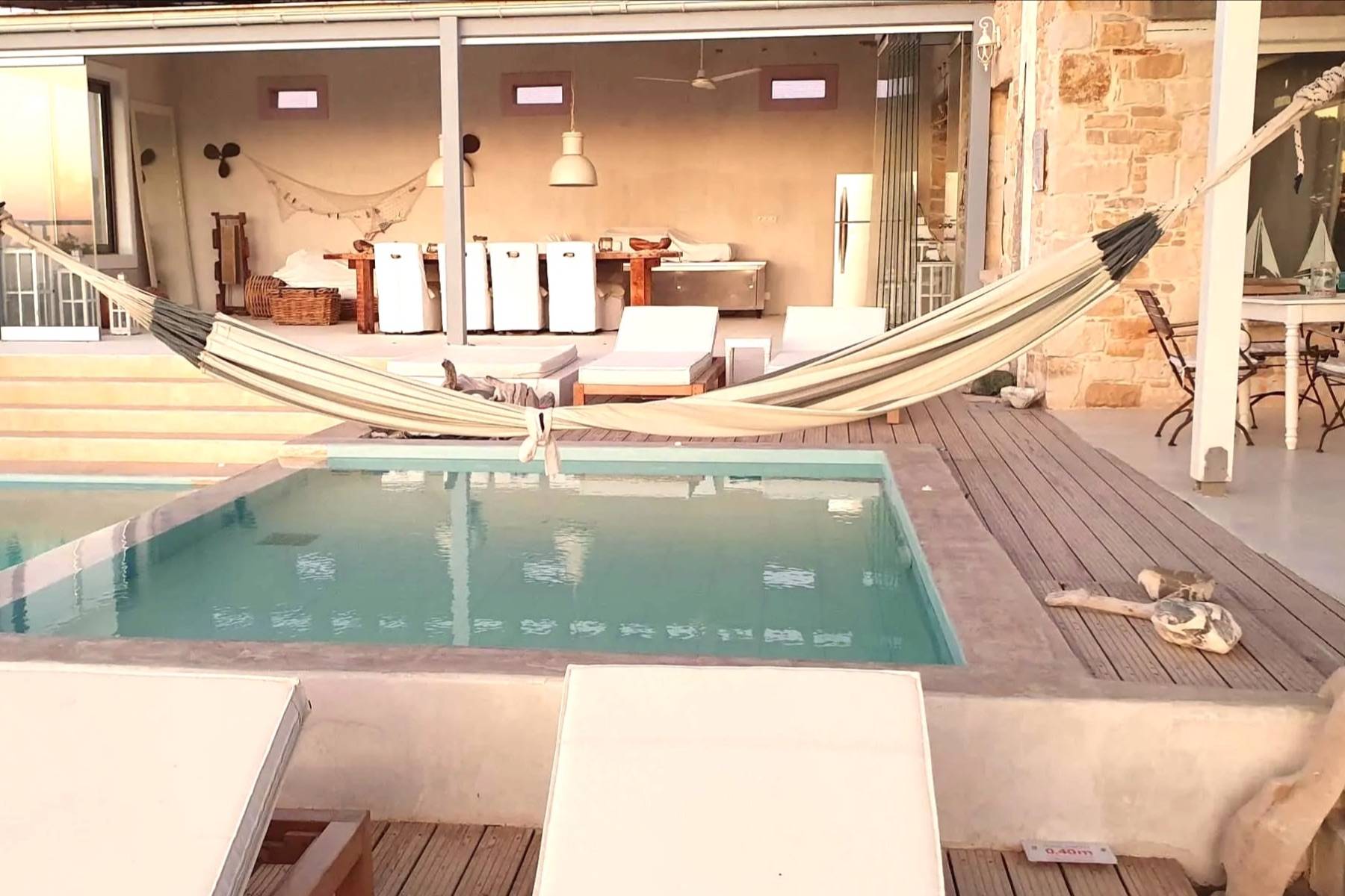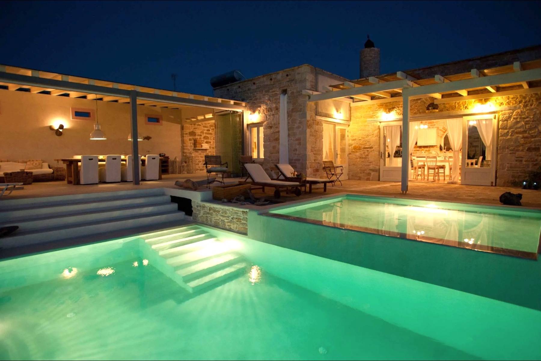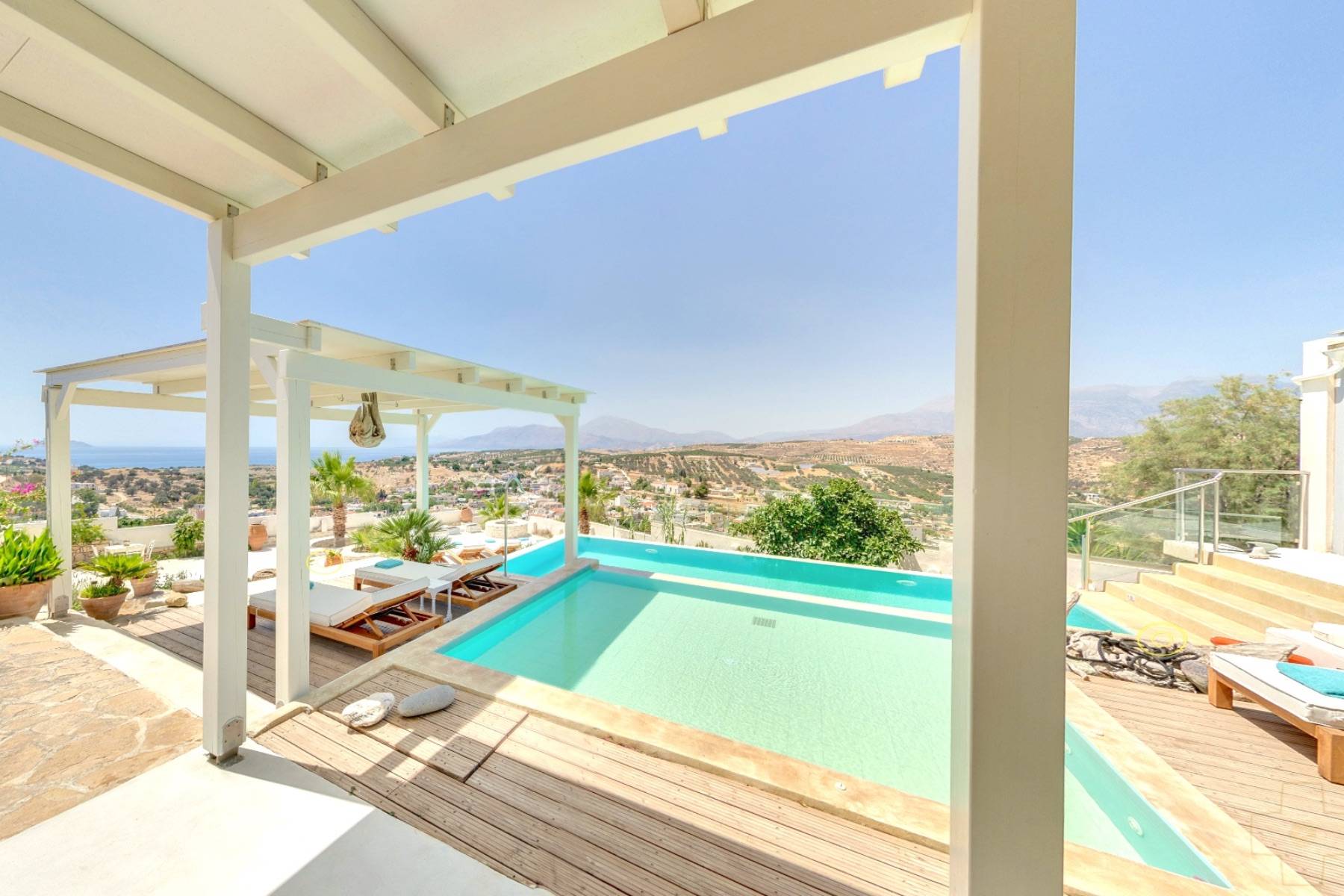Das Highlight der Villa Thea ist der Infinity Swimmingpool mit Salzfilteranlage, ohne Chlor. Sie können vom Kinder Becken (4 m x 3.50 m x 0.40 m) mit Whirlpool-Funktion in den großen Swimmingpool (5 m x 9 m x 1.50 m) gleiten. Dieser ist mit einer Schwalldusche für Massageanwendungen ausgestattet. Sie sind umgeben von einem begrünten Garten mit Palmen, Lavendel, Obstbäume und Oliven Hain.