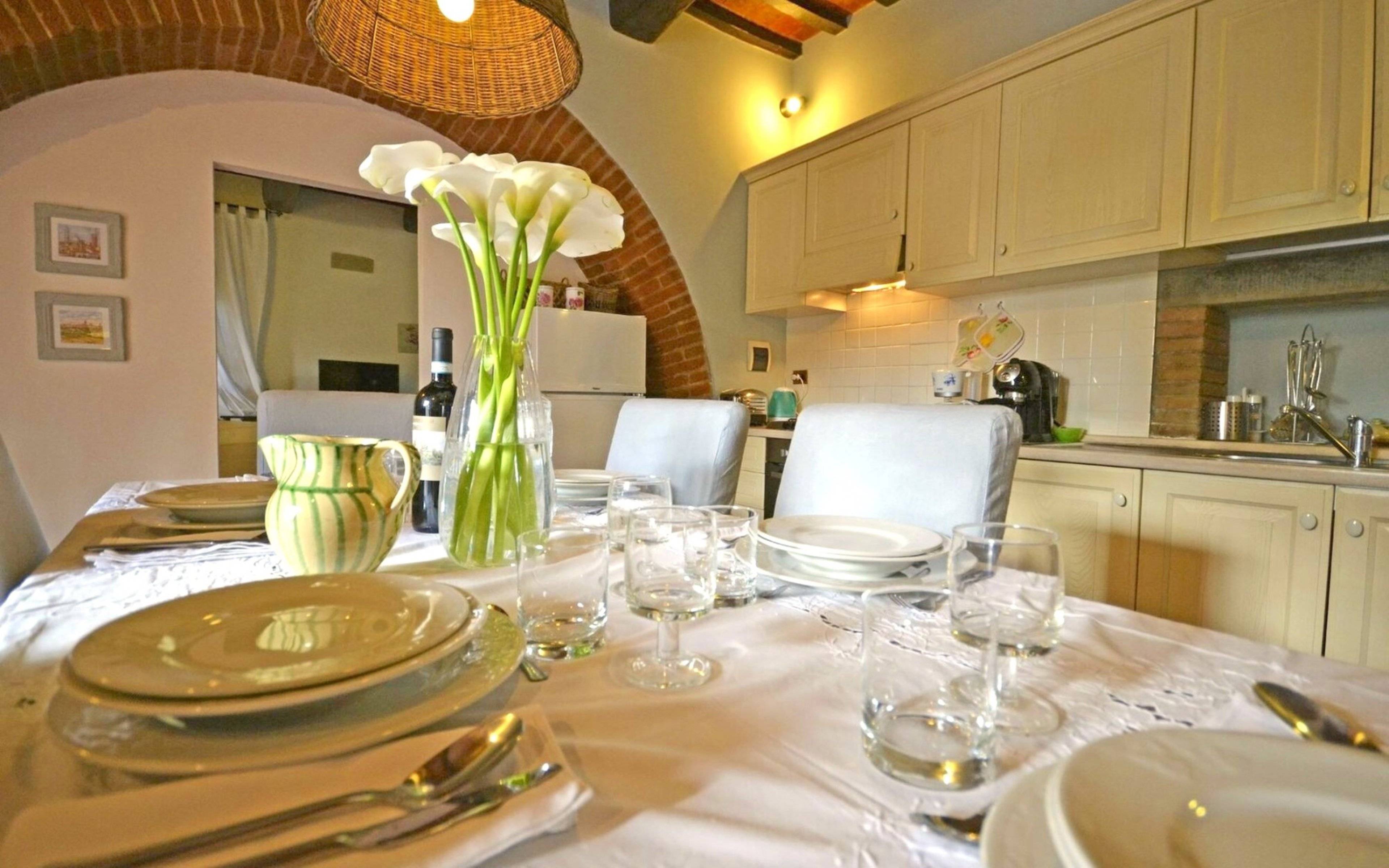 Das Hauptgebäude hat zwei Eingänge im Erdgeschoss. Der erste Zugang führt euch direkt zur geräumigen Küche, ausgestattet mit allem, was zum Kochen und komplett mit Esstisch benötigt wird.