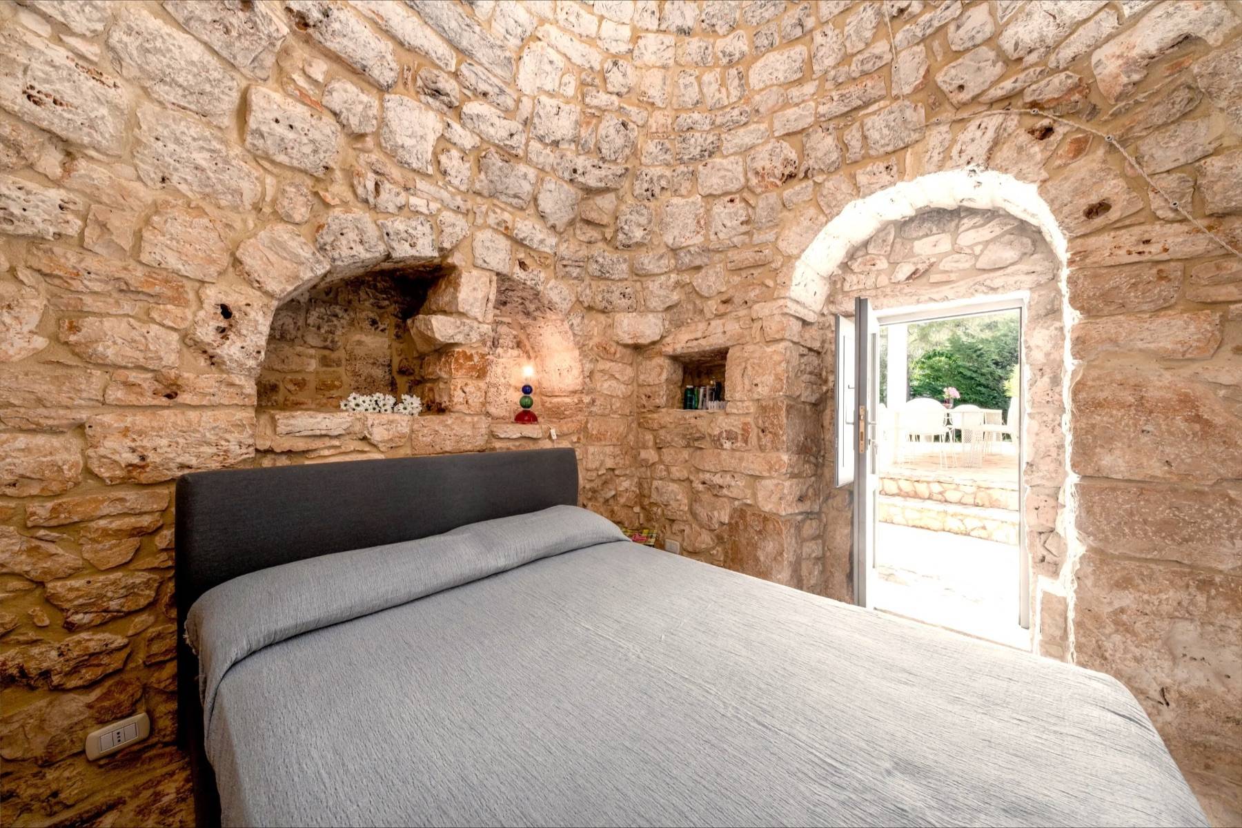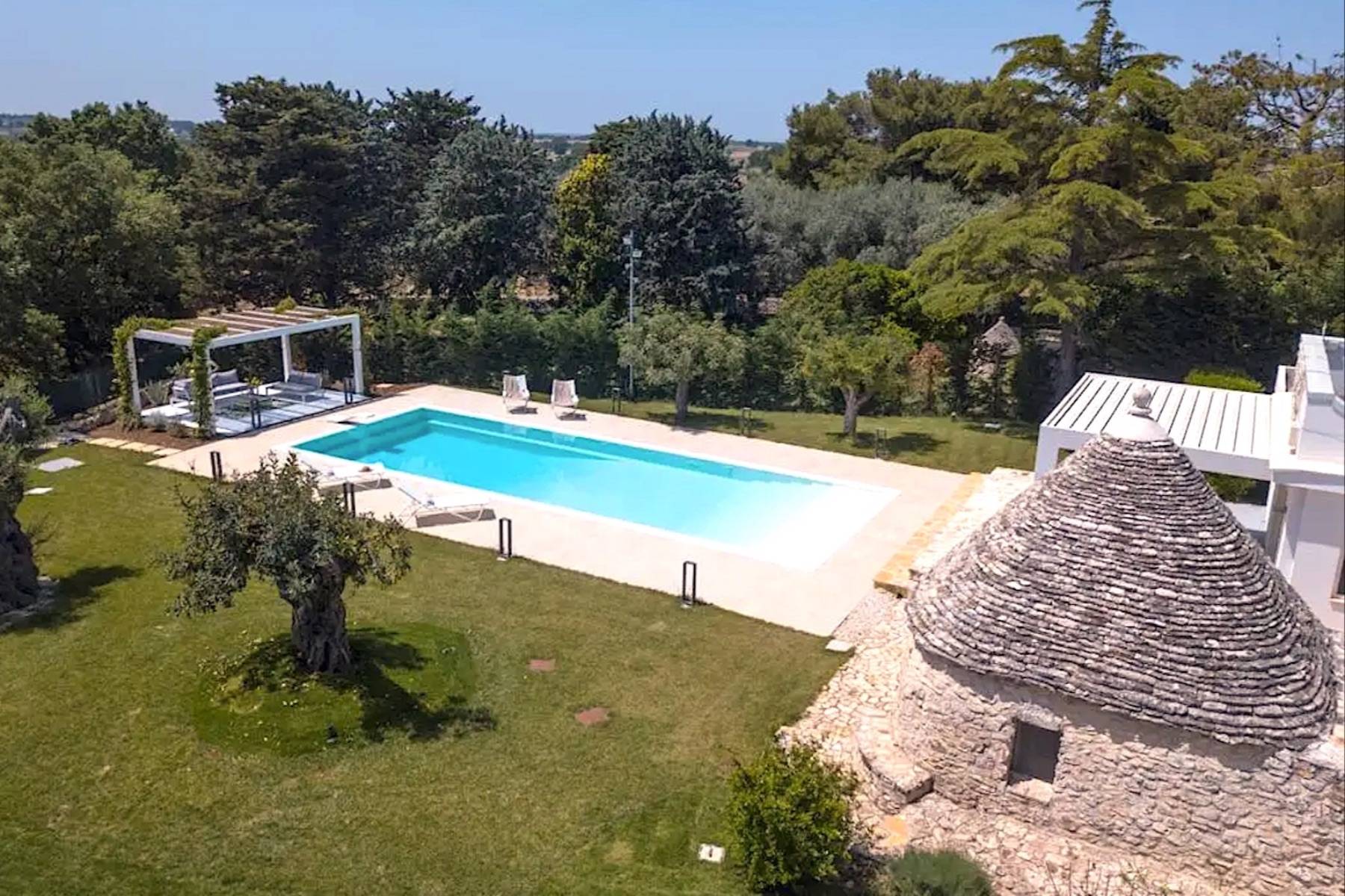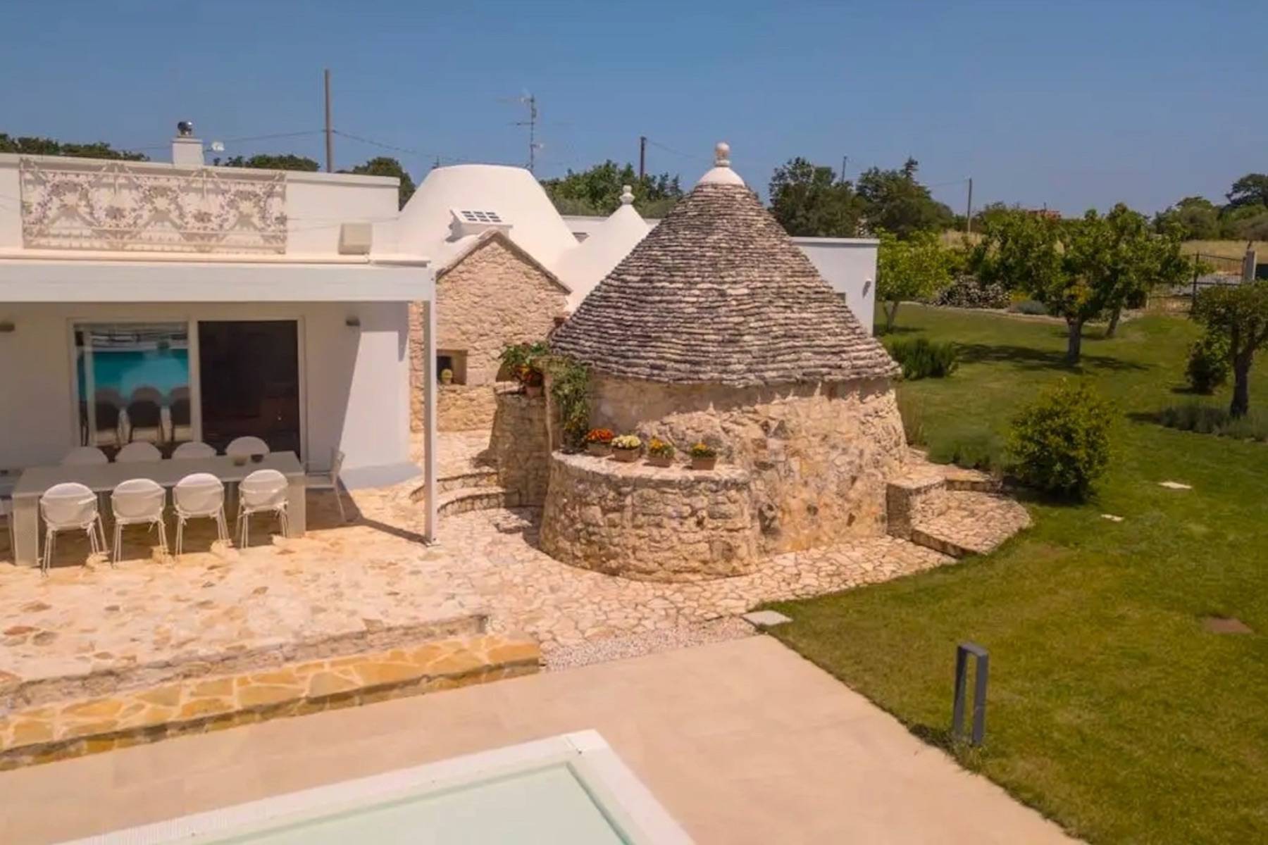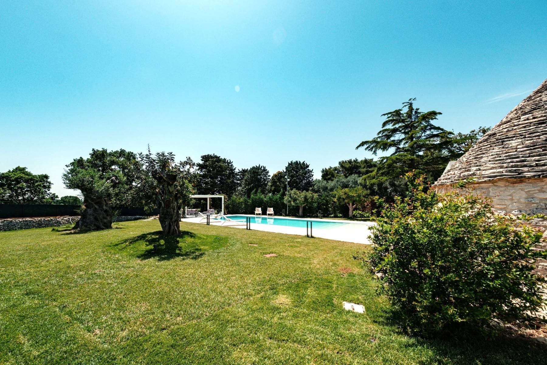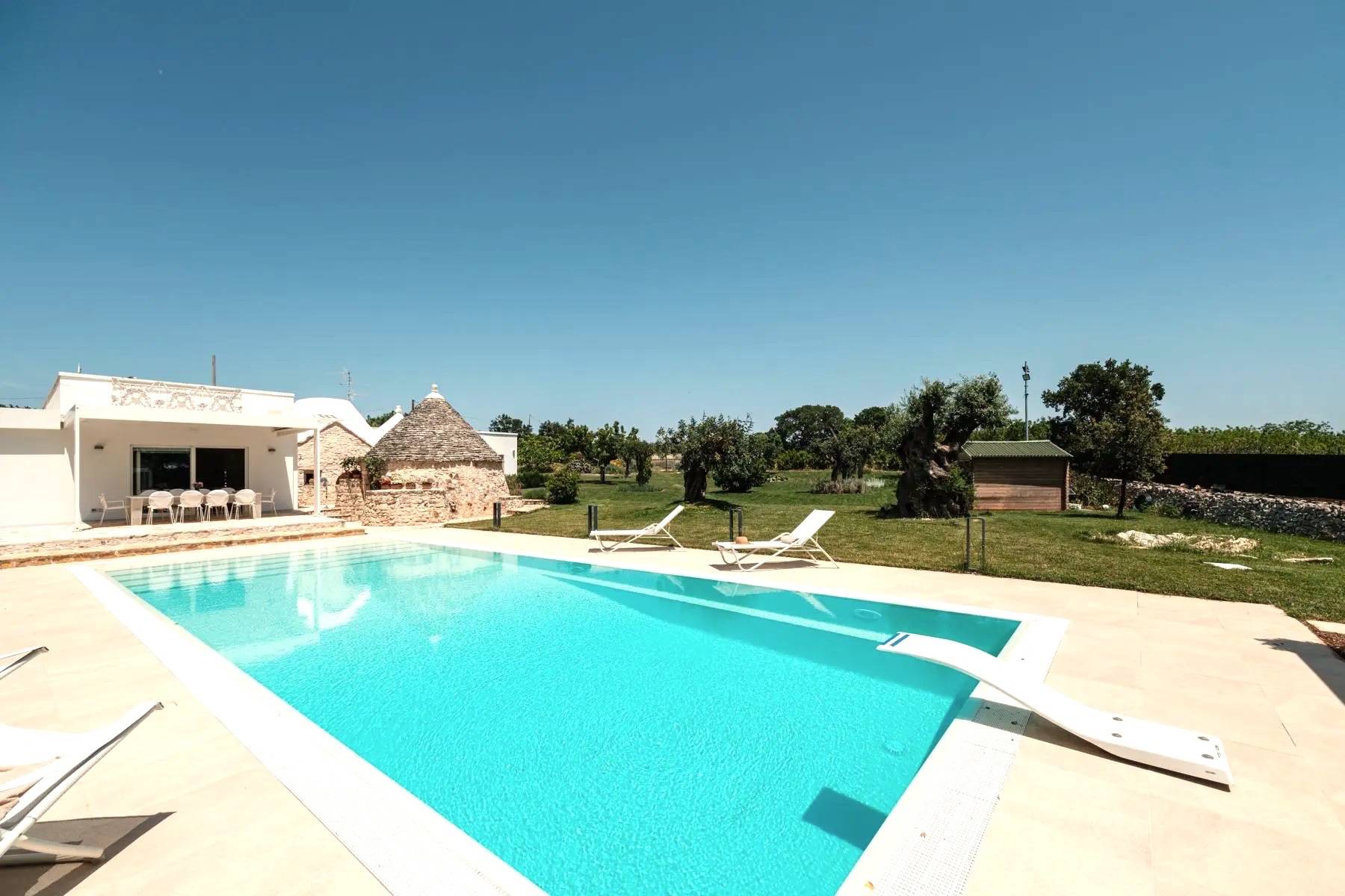Die perfekte Kombination aus Moderne und Tradition: Das große, moderne Wohnzimmer mit offener Küche ist perfekt mit dem Flur verbunden, der zum Schlafbereich führt, der aus einem Trullo herausgearbeitet wurde. Der Trullo im Freien, der ein Schlafzimmer mit eigenem Bad beherbergt, fügt sich perfekt in die grüne Weite des perfekt gepflegten Rasens ein.