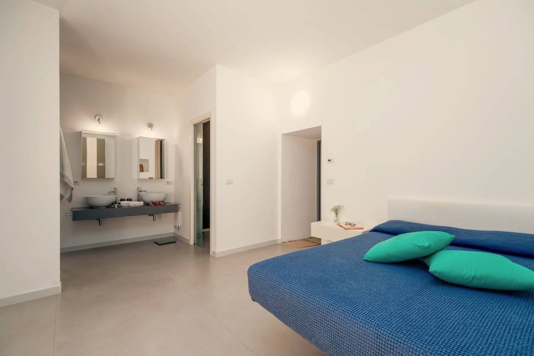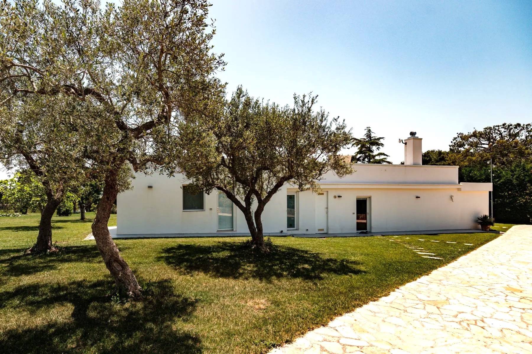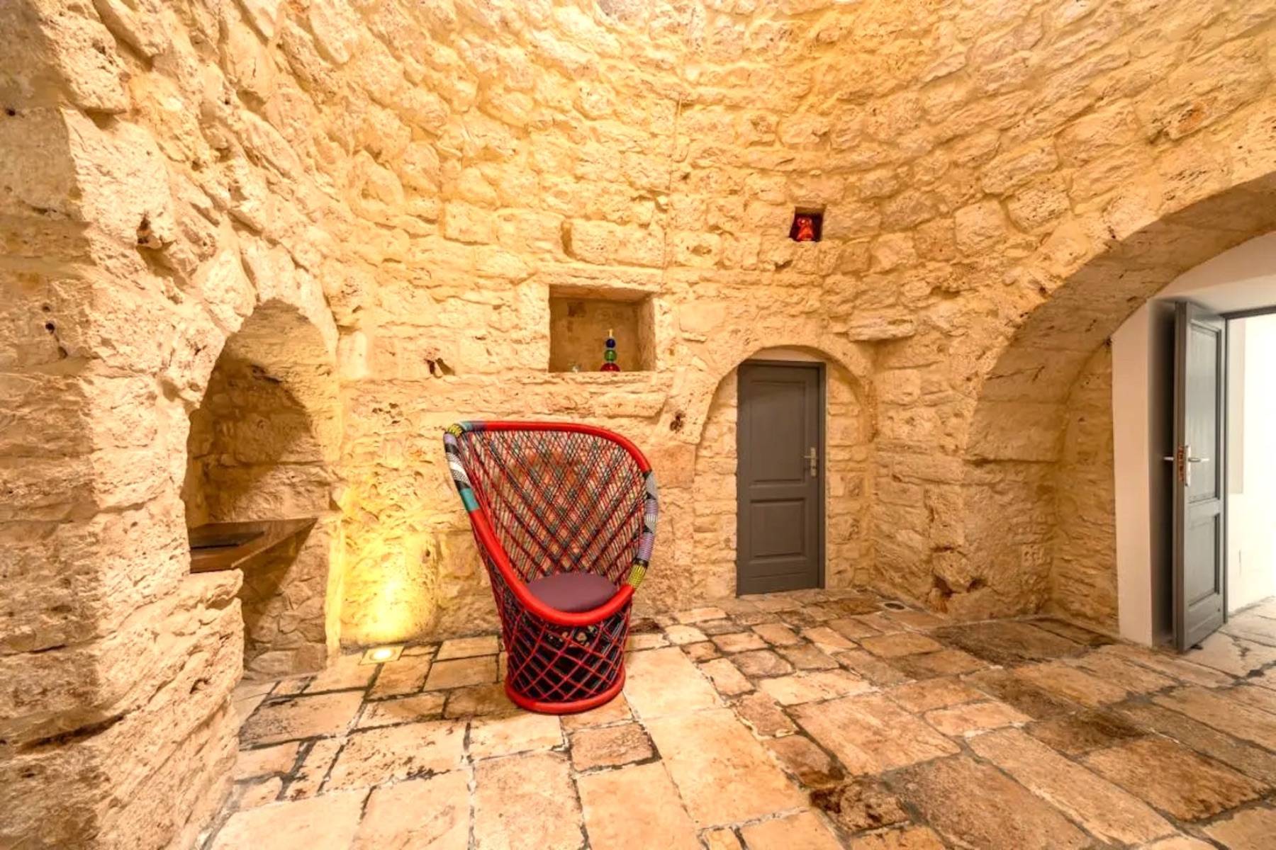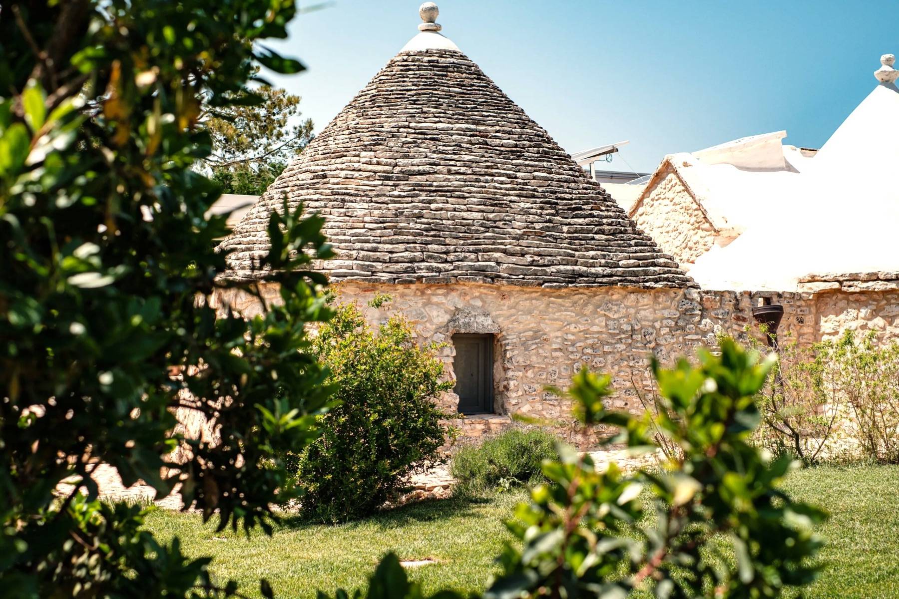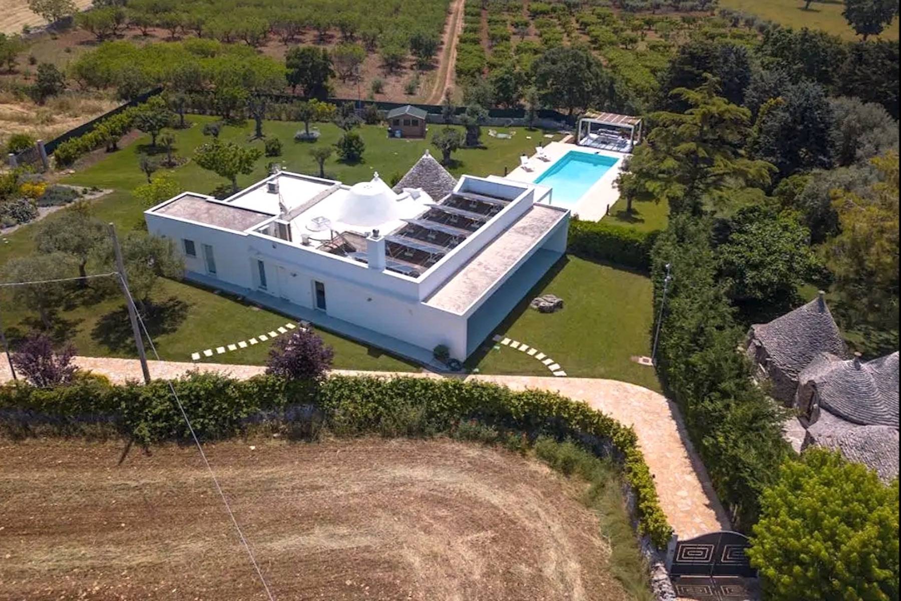 Die perfekte Kombination aus Moderne und Tradition: Das große, moderne Wohnzimmer mit offener Küche ist perfekt mit dem Flur verbunden, der zum Schlafbereich führt, der aus einem Trullo herausgearbeitet wurde. Der Trullo im Freien, der ein Schlafzimmer mit eigenem Bad beherbergt, fügt sich perfekt in die grüne Weite des perfekt gepflegten Rasens ein.