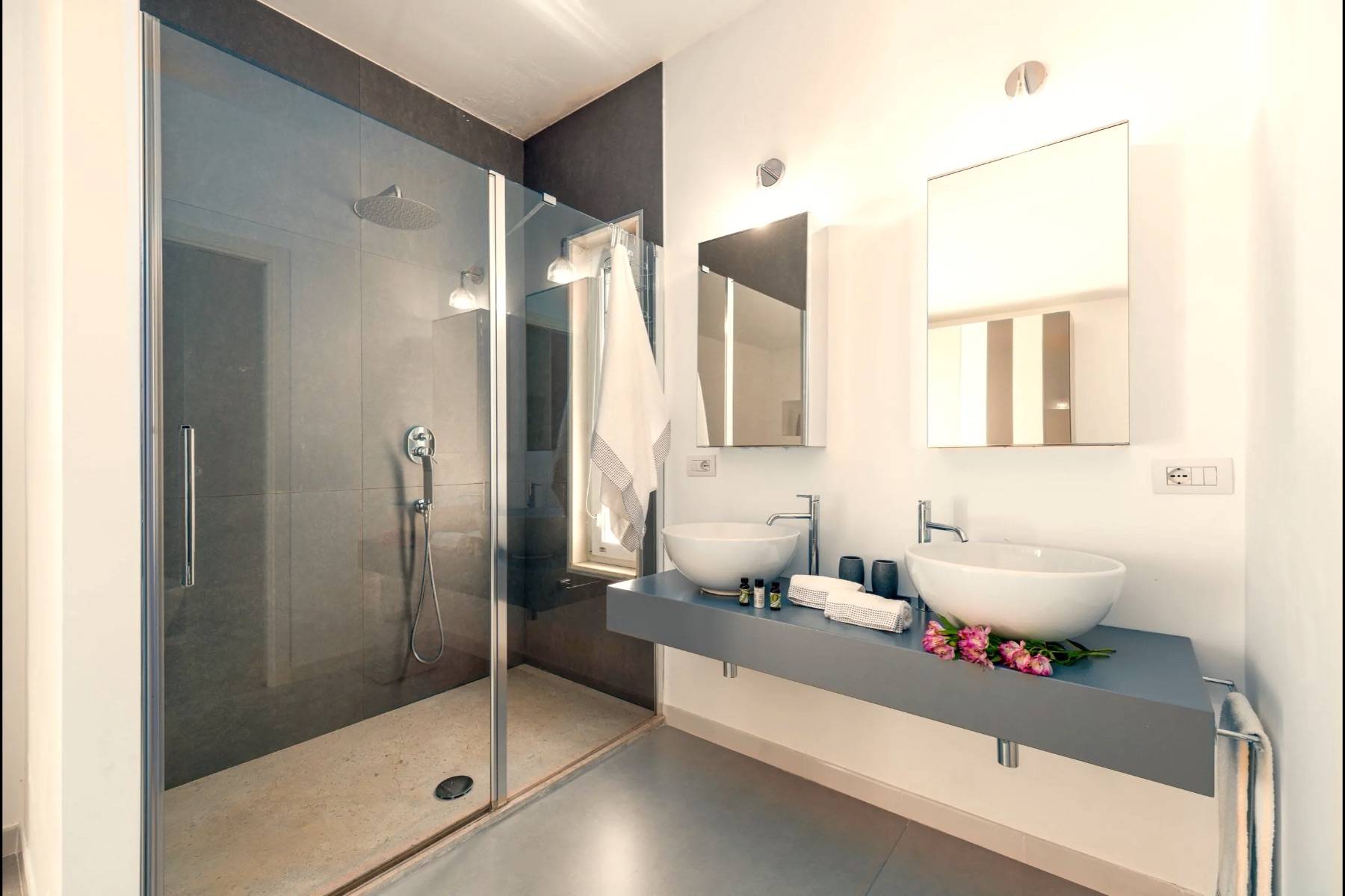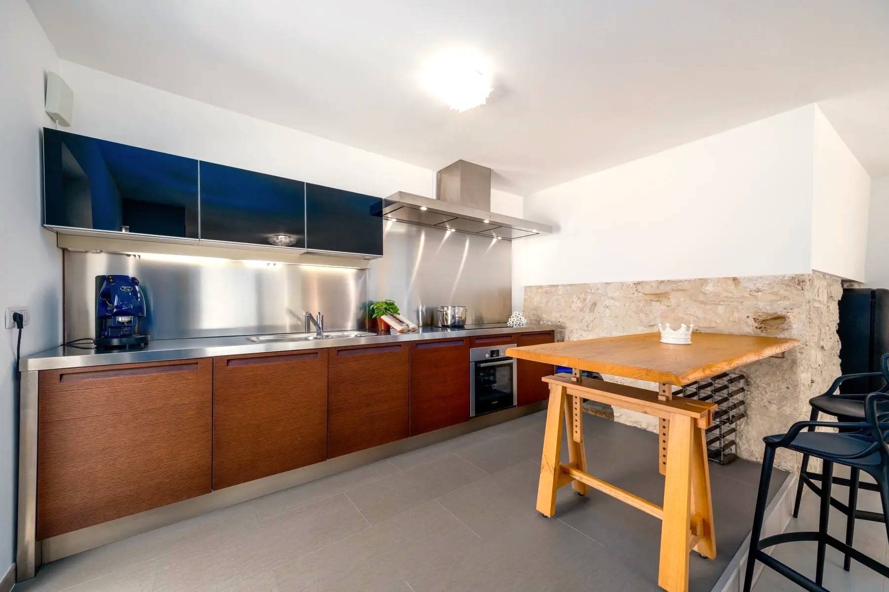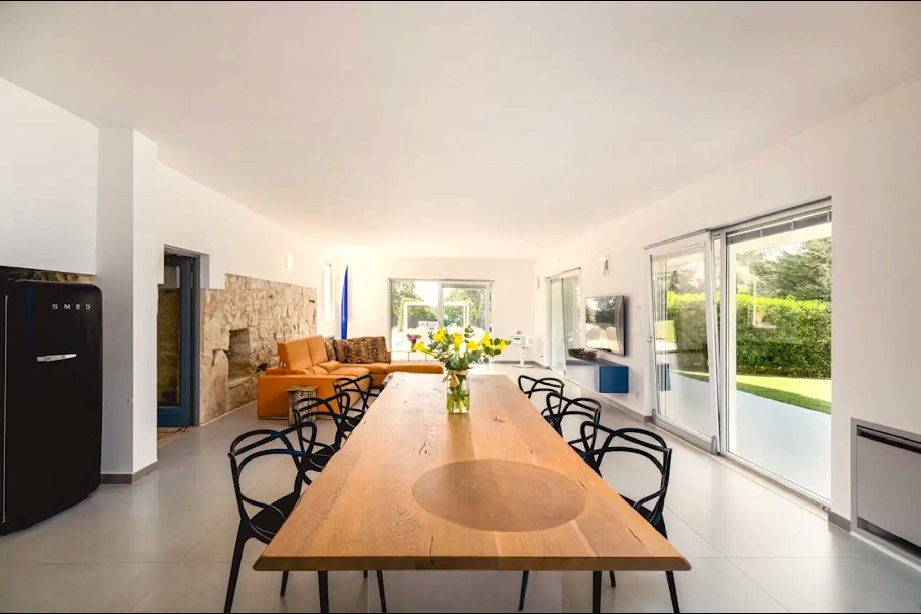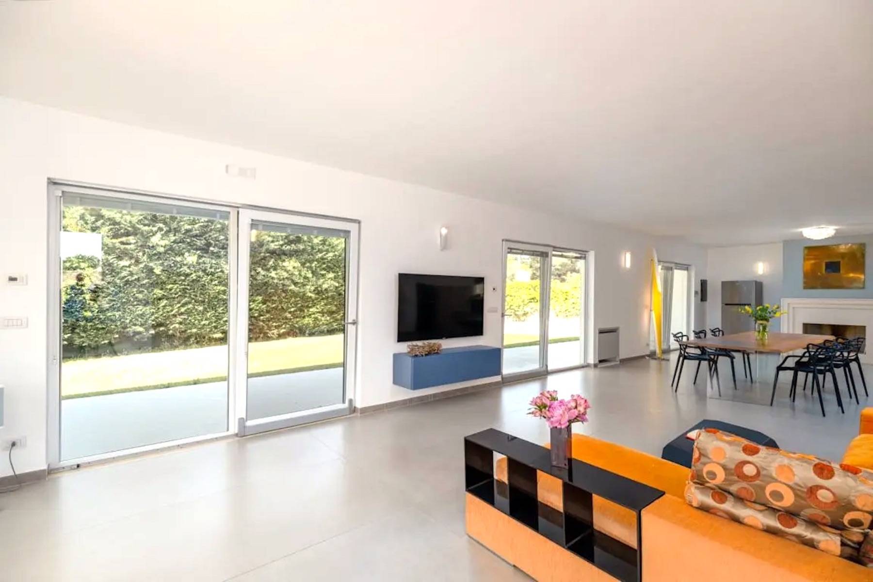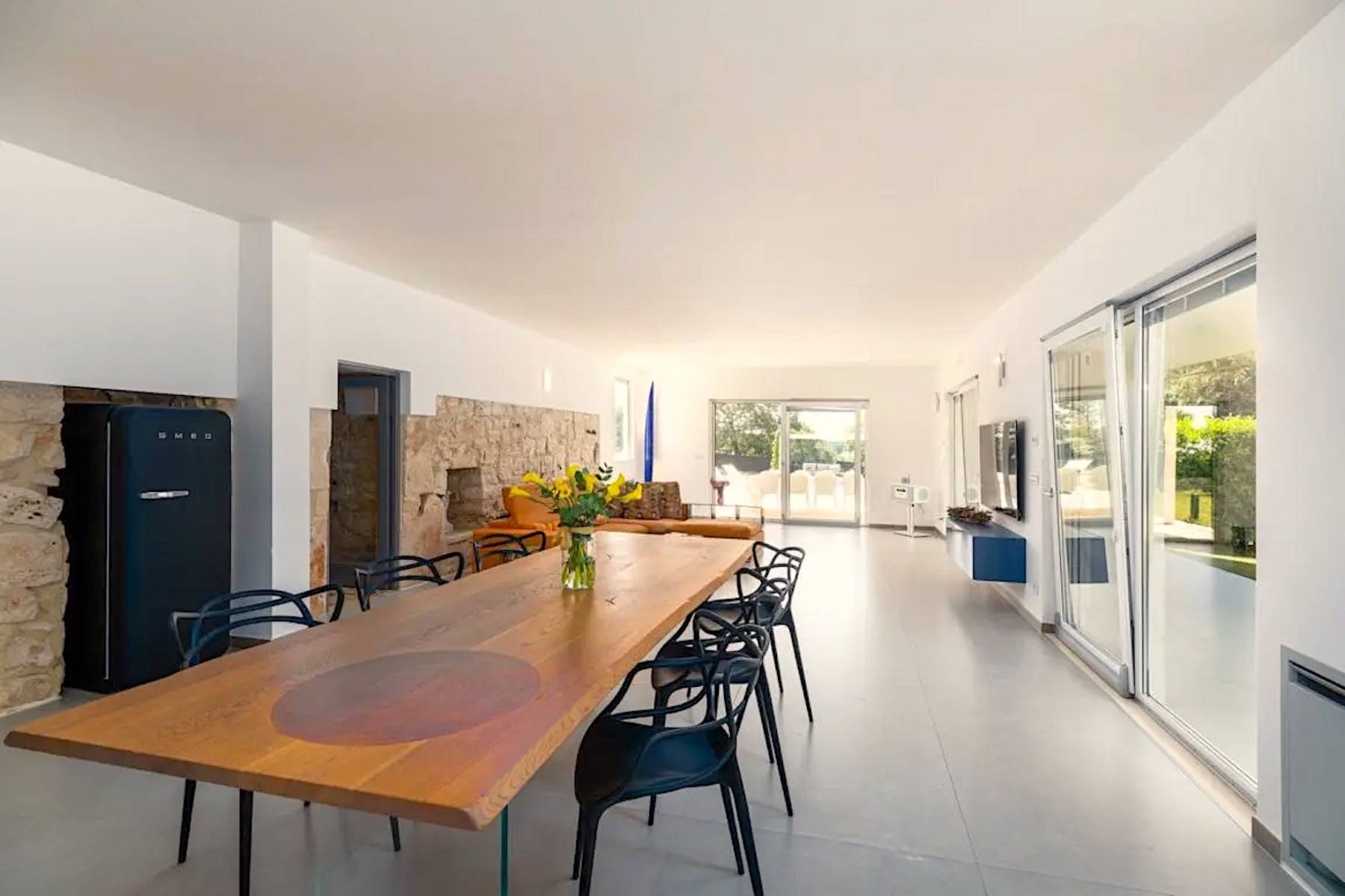 Die perfekte Kombination aus Moderne und Tradition: Das große, moderne Wohnzimmer mit offener Küche ist perfekt mit dem Flur verbunden, der zum Schlafbereich führt, der aus einem Trullo herausgearbeitet wurde. Der Trullo im Freien, der ein Schlafzimmer mit eigenem Bad beherbergt, fügt sich perfekt in die grüne Weite des perfekt gepflegten Rasens ein.