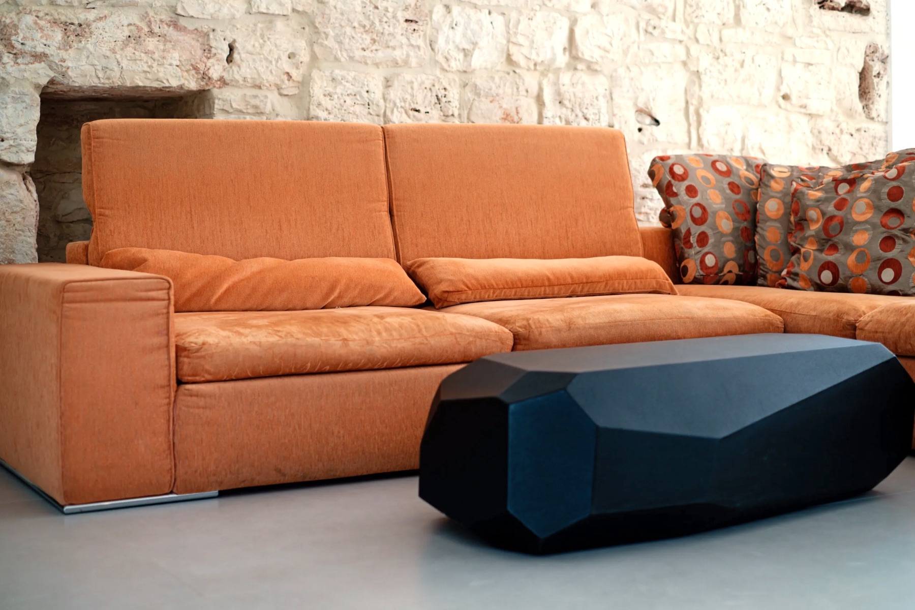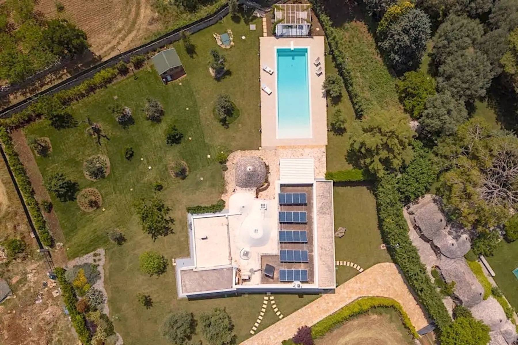 Der Trulli Paolino verfügt über ein zentrales Gebäude und einen Trullo. Der zentrale Teil besteht aus dem großen Wohnzimmer mit offener Küche und zeichnet sich durch große Fenster mit Blick auf den Pool und den umliegenden Rasen aus. Der große Kamin dominiert den Raum und verleiht ihm einen modernen Touch, der auch durch die Designerlampen und die Stahlküche unterstrichen wird. Von hier aus gelangt man in den Flur, der einen in die Vergangenheit zurückversetzt: Ein typischer Trullo mit freiliegenden Steinen bietet Zugang zu einem modernen Schlafzimmer mit Doppelbett und eigenem Bad mit Dusche und großem Fenster mit Blick auf den Rasen, einem traditionellen Schlafzimmer, das aus einem Trullo herausgearbeitet wurde, und einem weiteren Bad, das ebenfalls in den Trullo eingebaut wurde, ein kleiner Raum wird als Abstellraum genutzt. Vom Wohnzimmer aus gelangt man über die möblierte Terrasse, die mit einem großen Tisch für Mahlzeiten im Freien ausgestattet ist, in den Poolbereich.