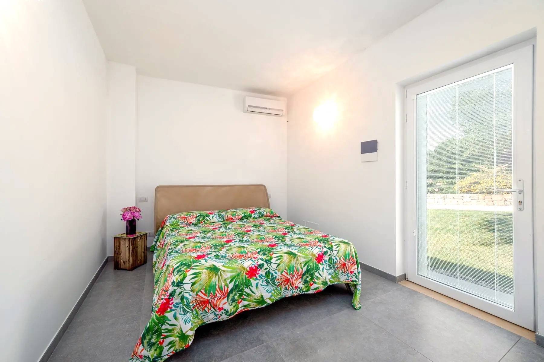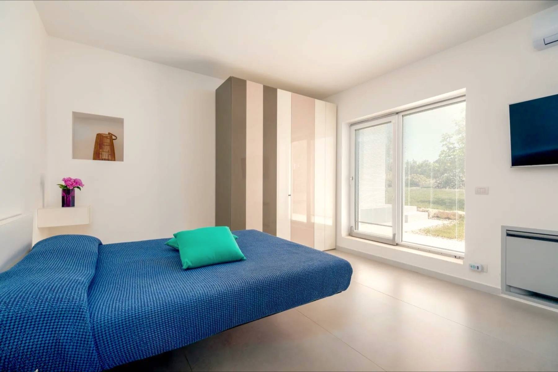 Bettwäsche Doppelbett Fenster Klimaanlage Plissees Terrassenzugang